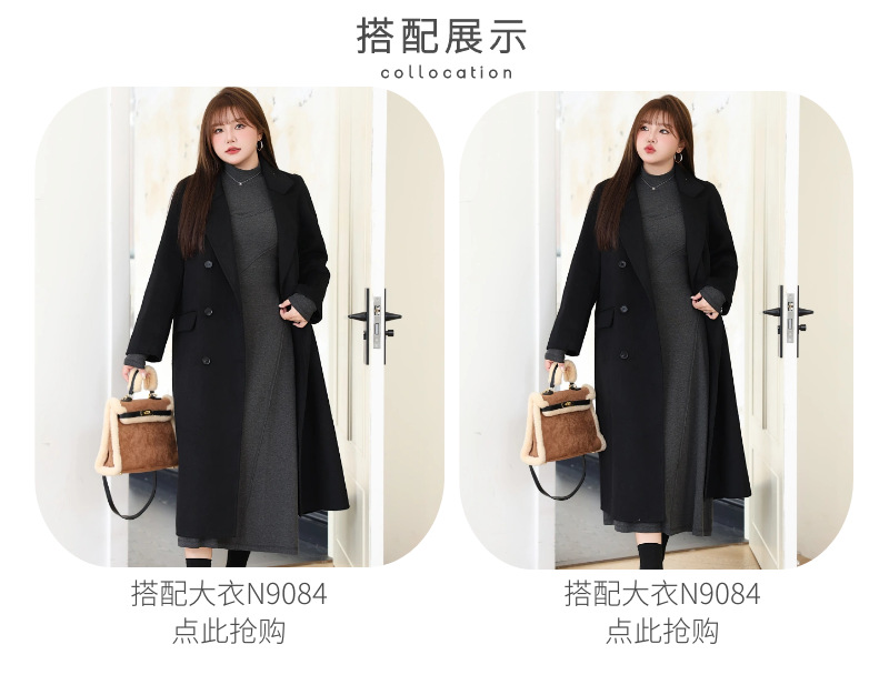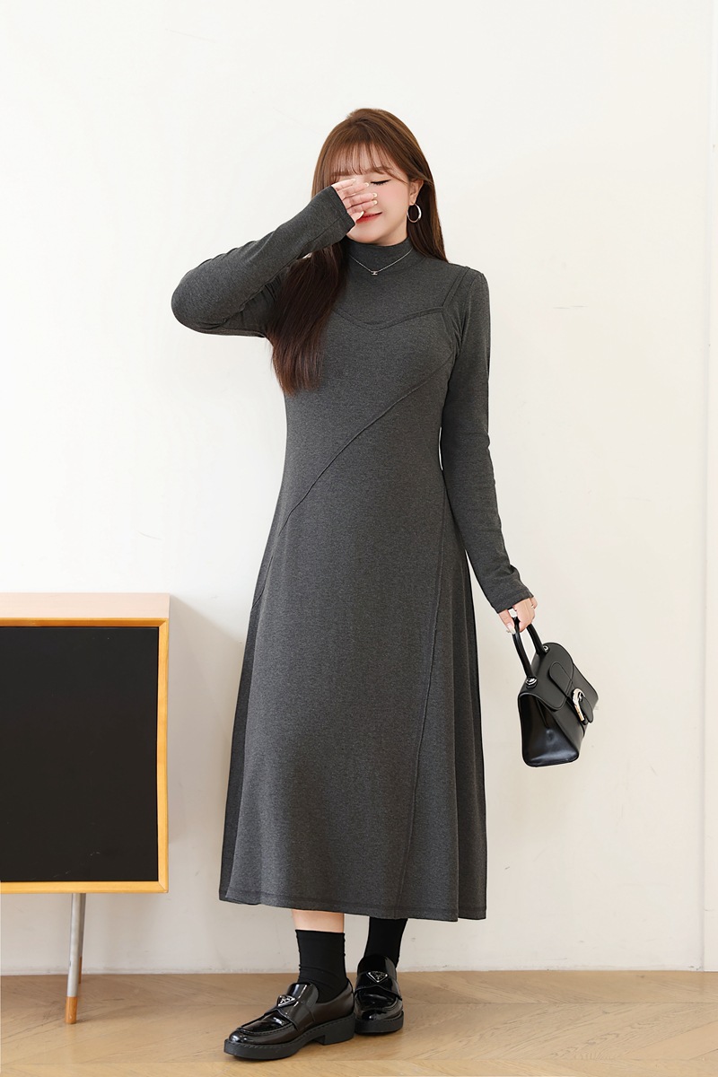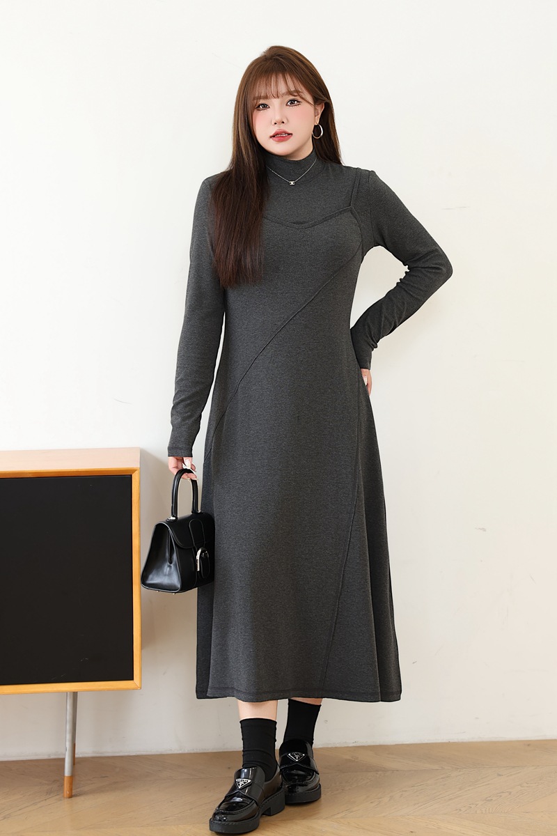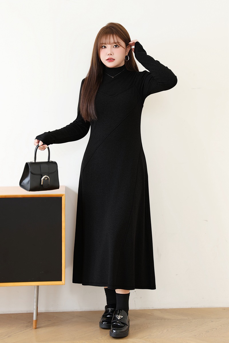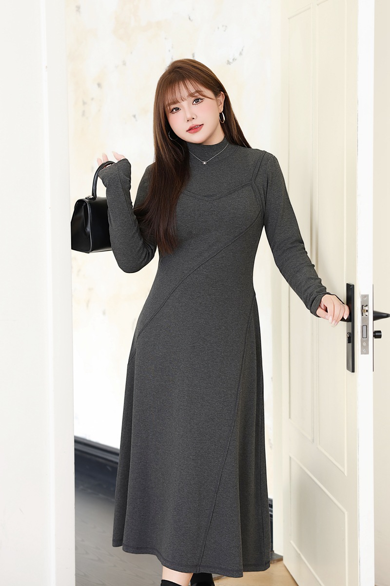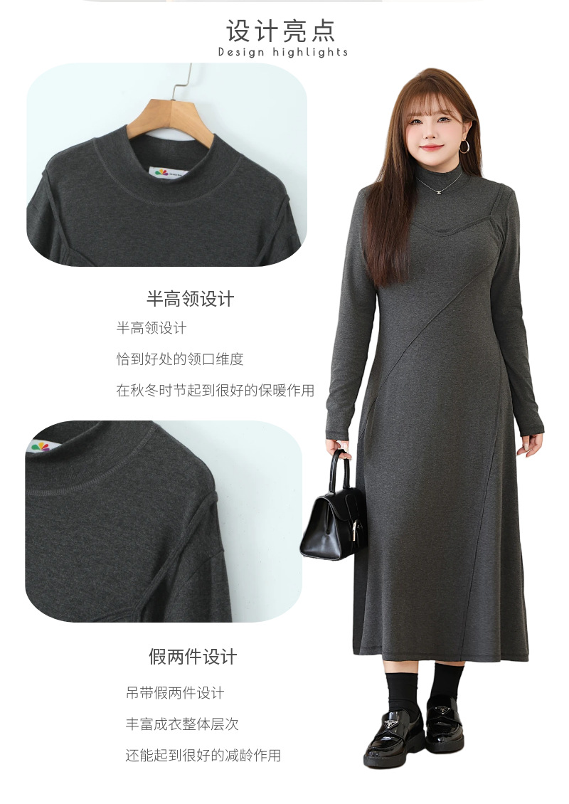 假两件半高领针织长袖收腰连衣裙润其9108大码弹力磨毛秋秋冬打底