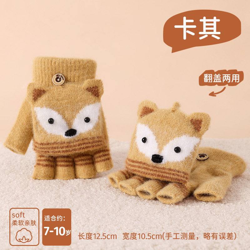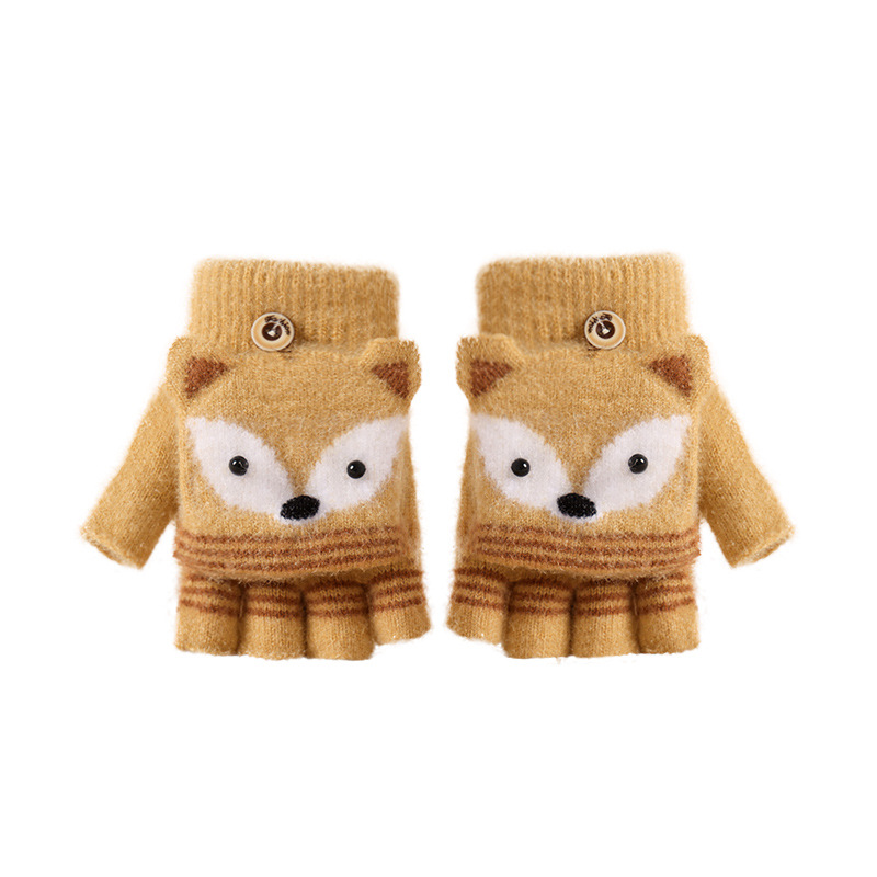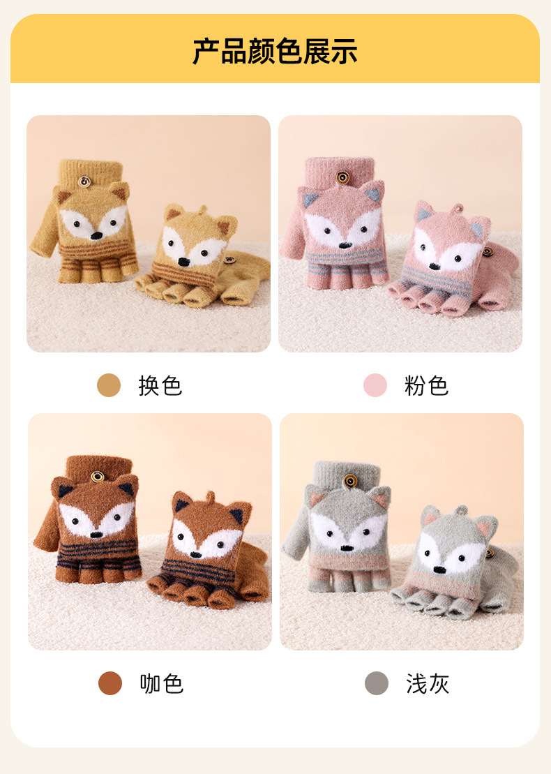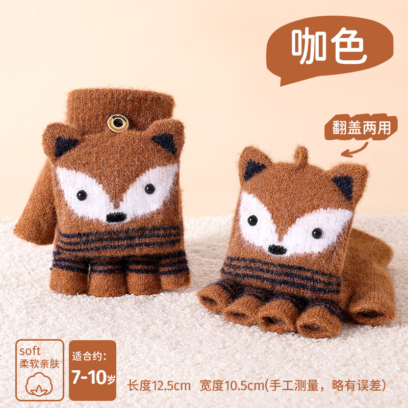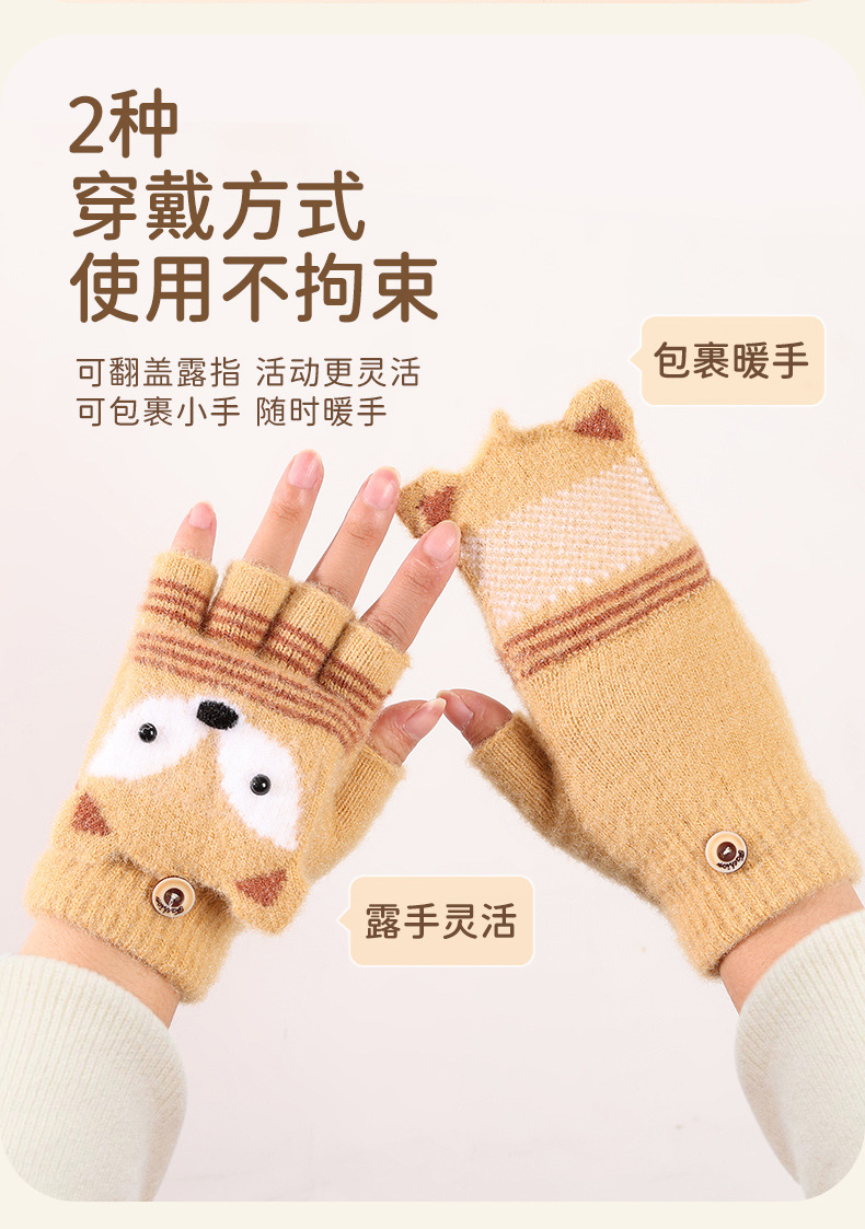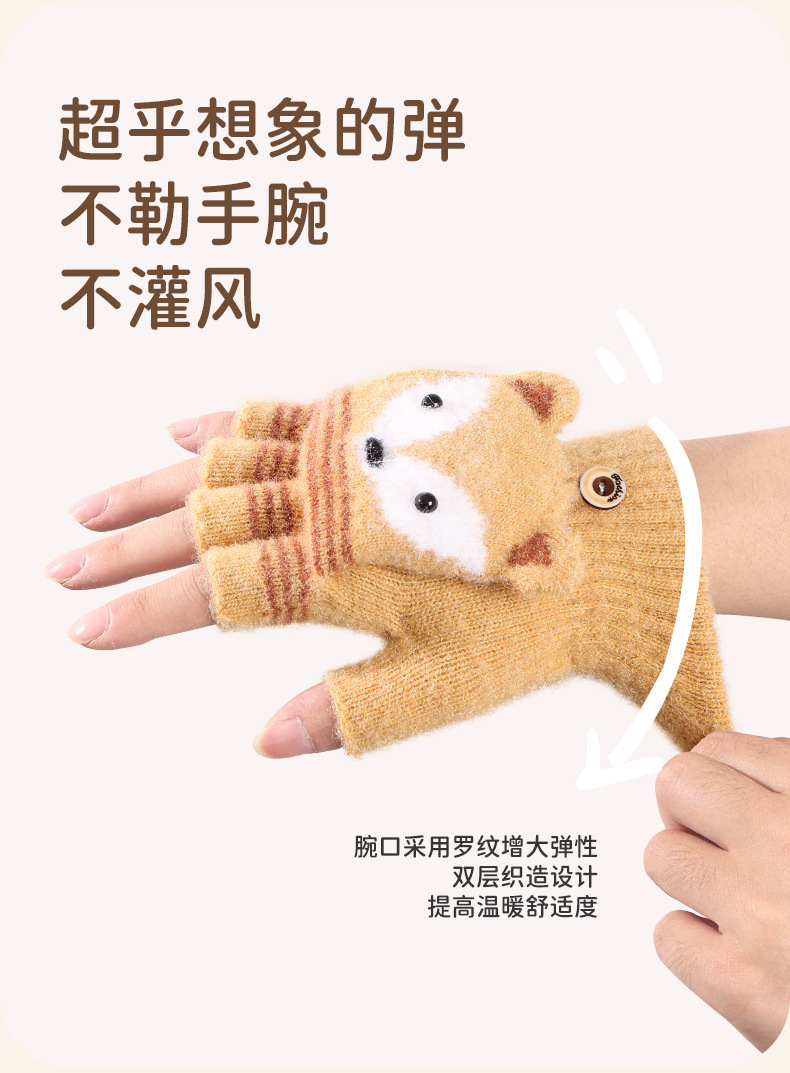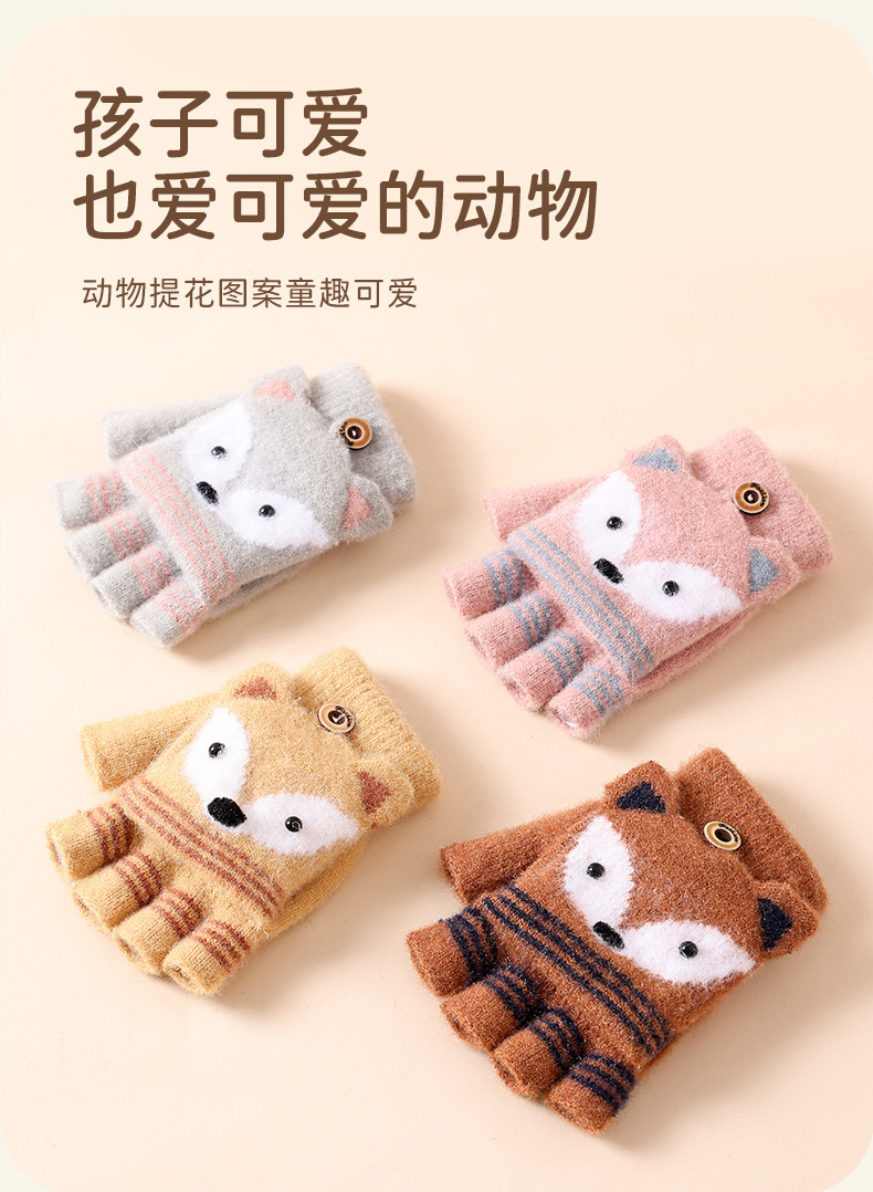 儿童冬季半指翻盖卡通针织保暖加绒露指可爱男童手套批发女童防寒