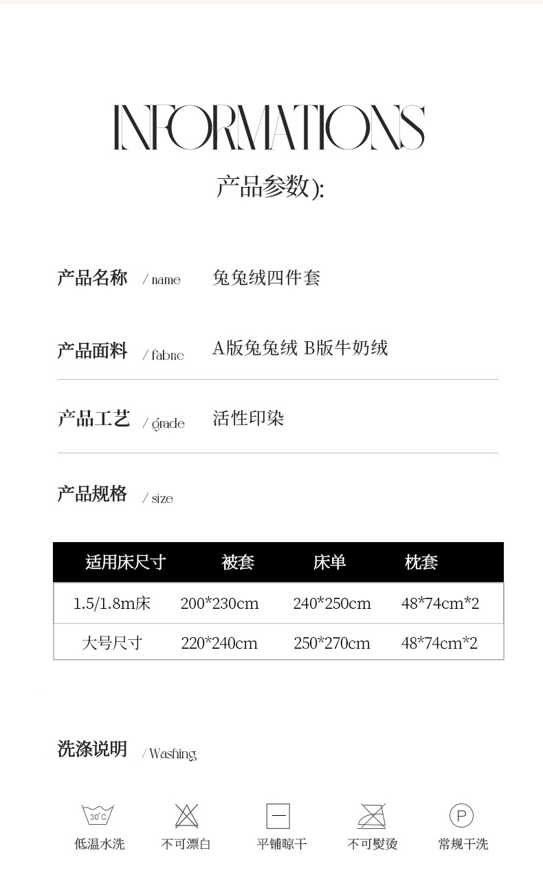 | 1.5 fitted sheet four-piece set (quilt cover 200*230)(1.5床笠款四件套(被套200*230)) | USD $30.88 | 5000 set available |