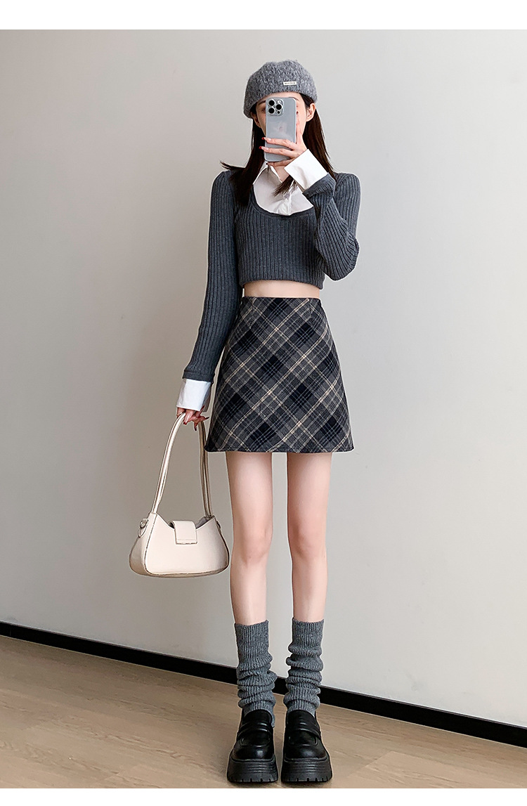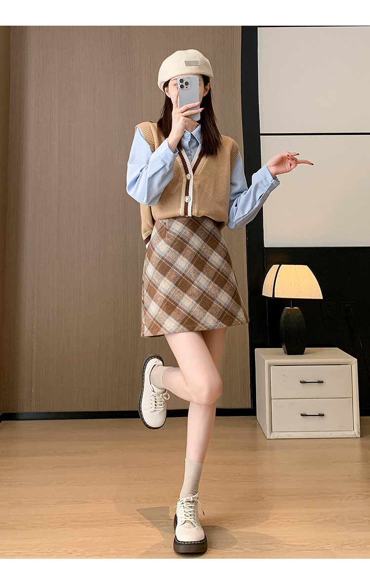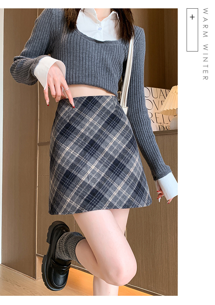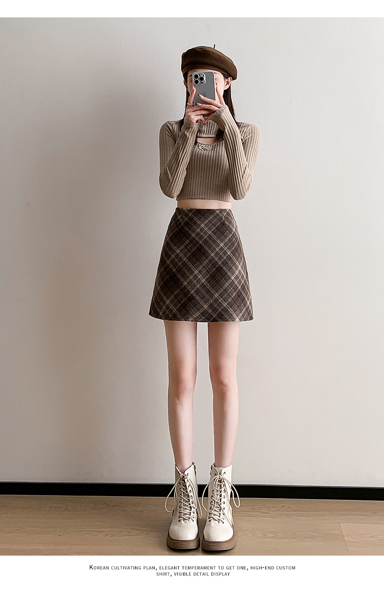 毛呢半身裙2025秋冬新款短裙女高腰显瘦小个子A字复古格子包臀裙