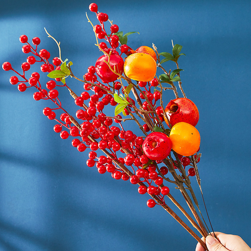 发财果红浆果假花石榴枝柿子仿真花春节年宵花红果枝福桶配件花卉