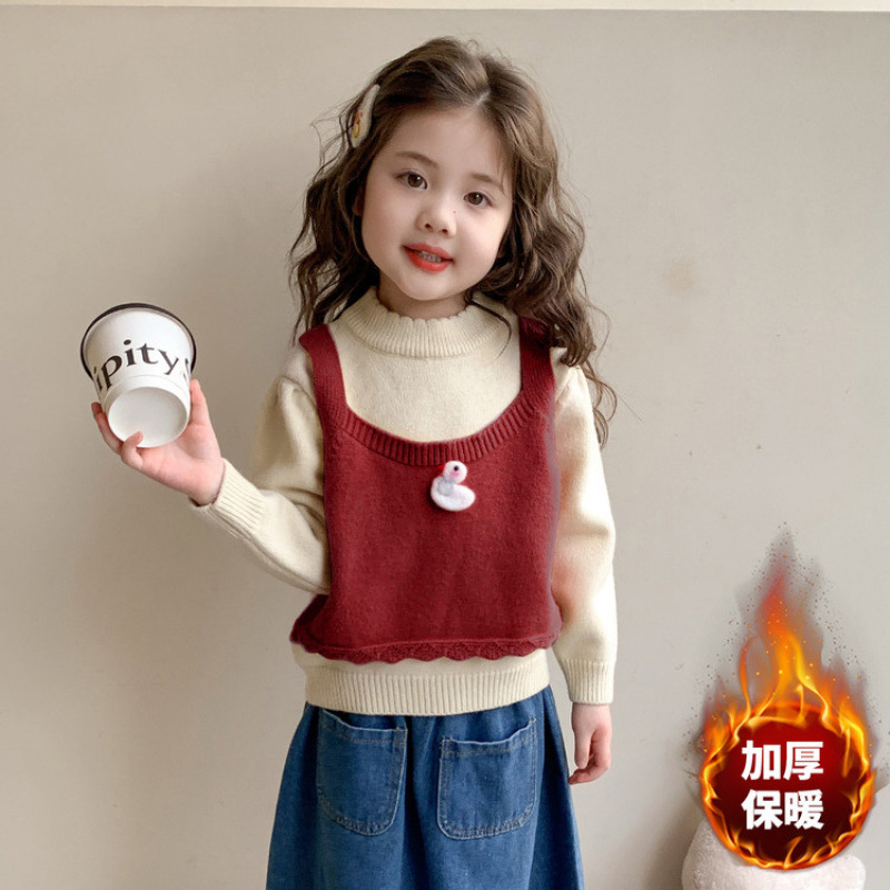女童卡通假两件毛衣秋冬季2025新款女宝宝洋气时髦加厚冬装针织。