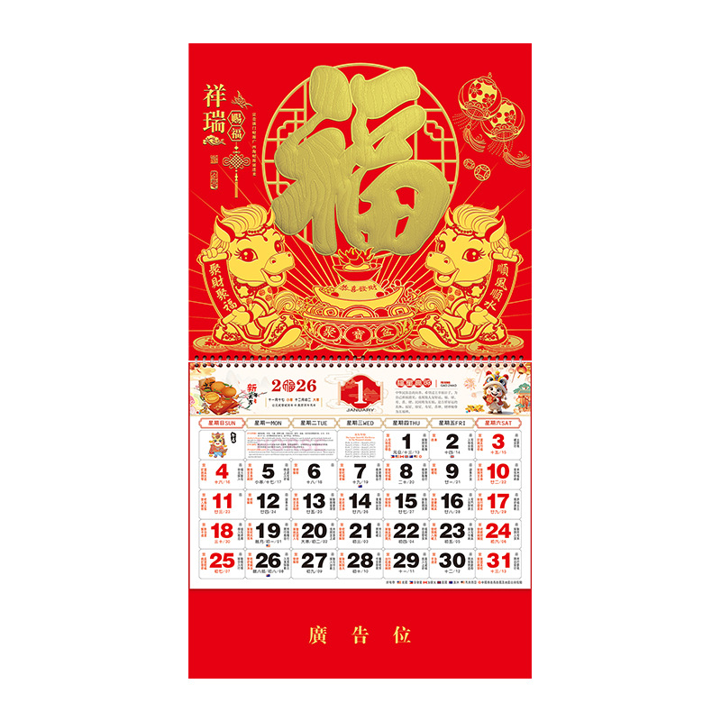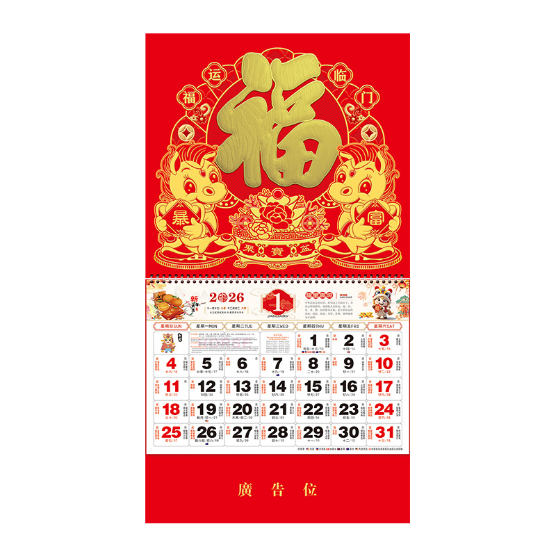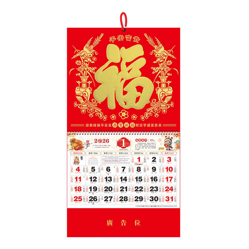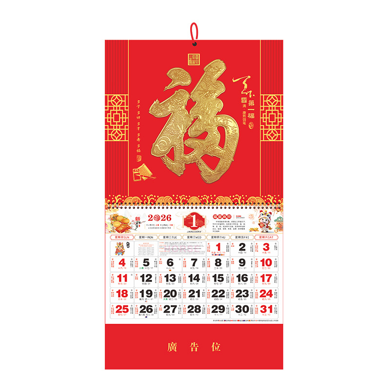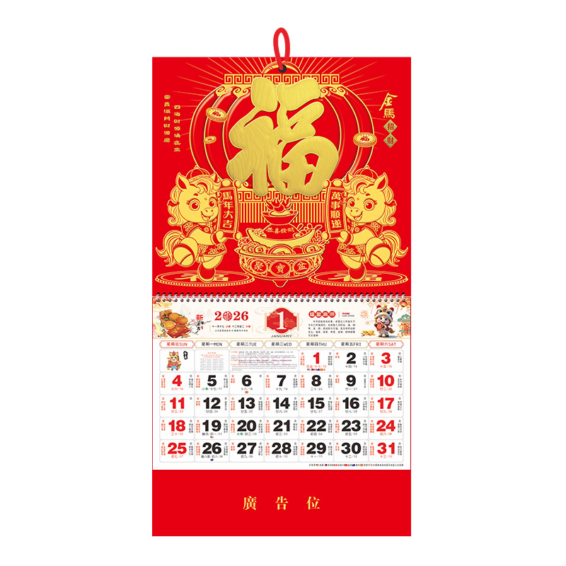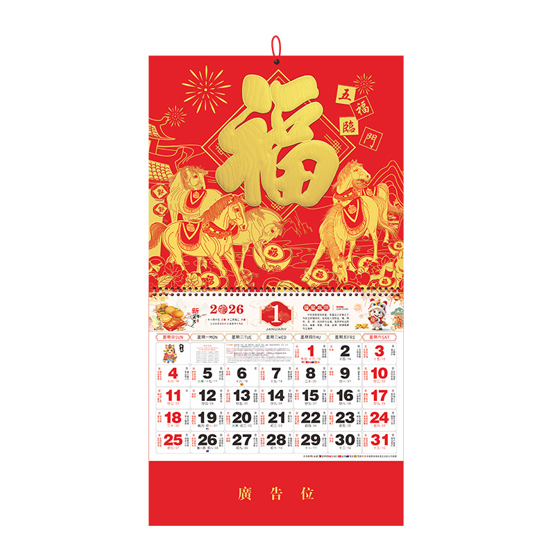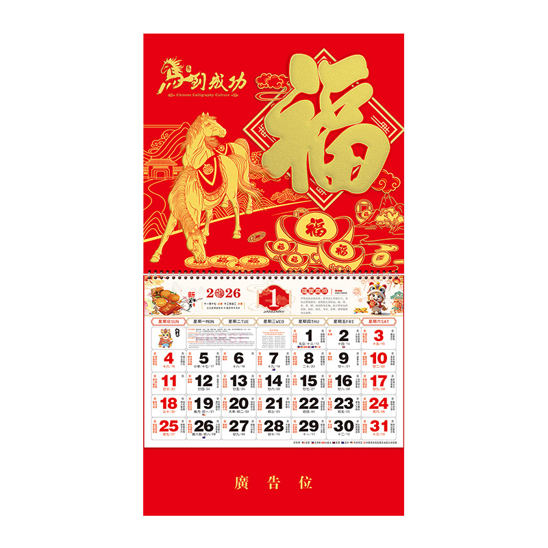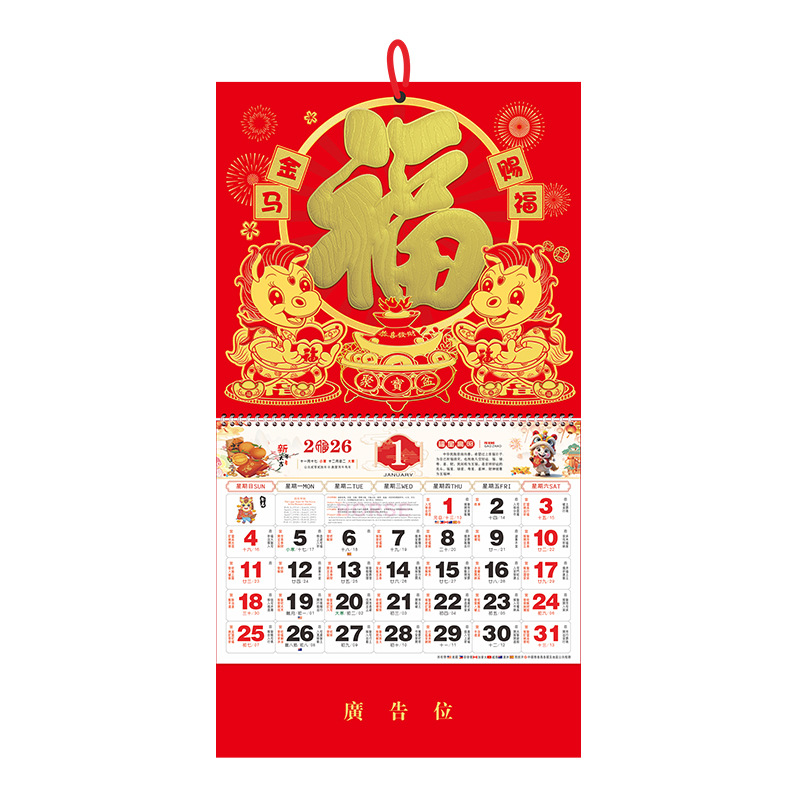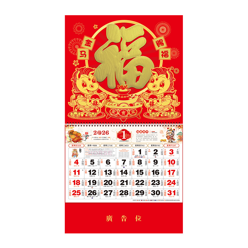 2026马年挂历 正六开金箔福字吊牌挂历专版广告烫金logo月历液压