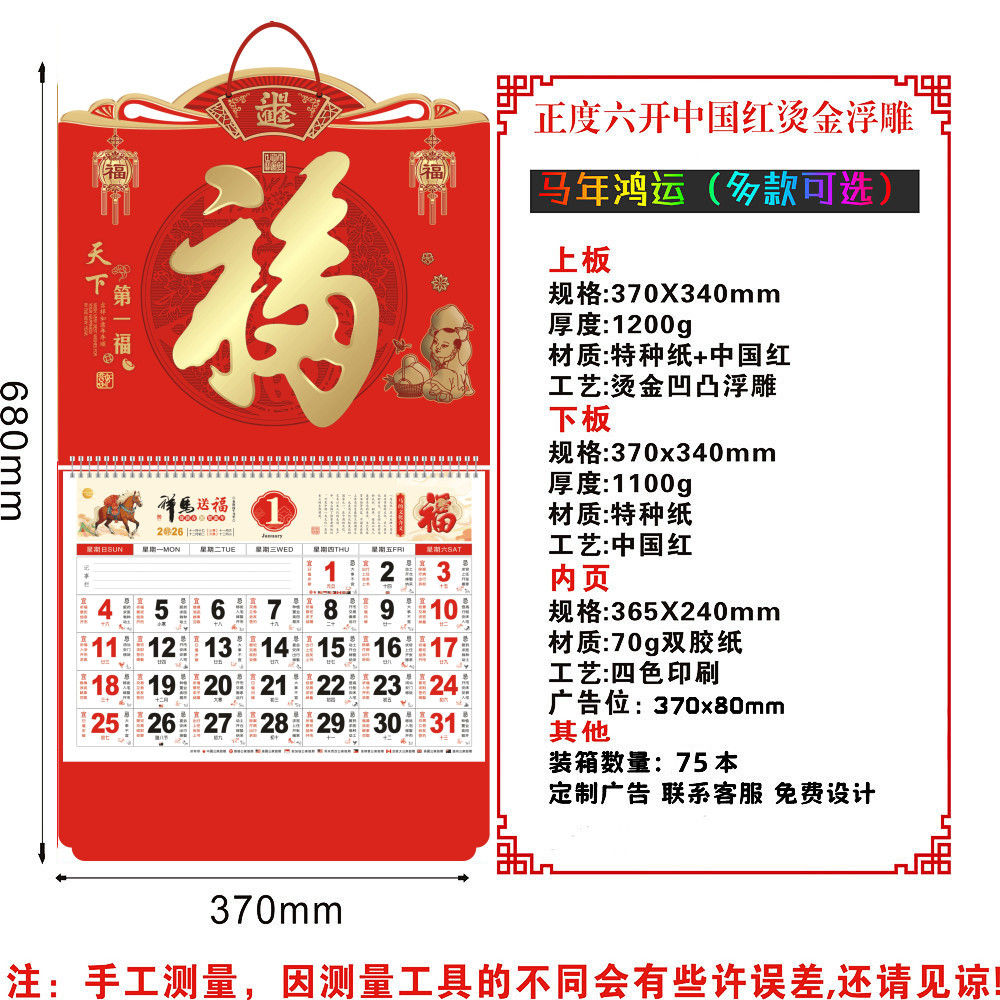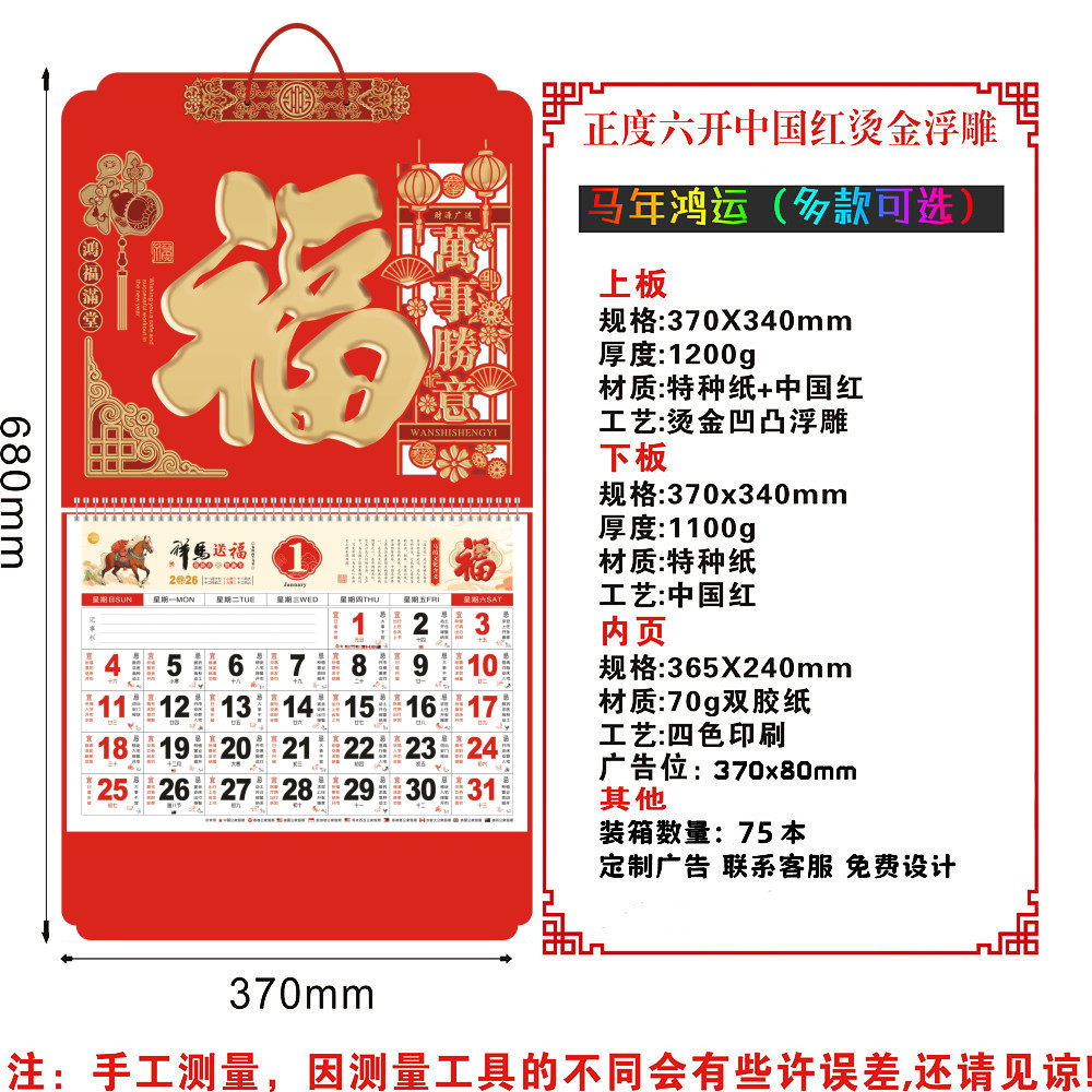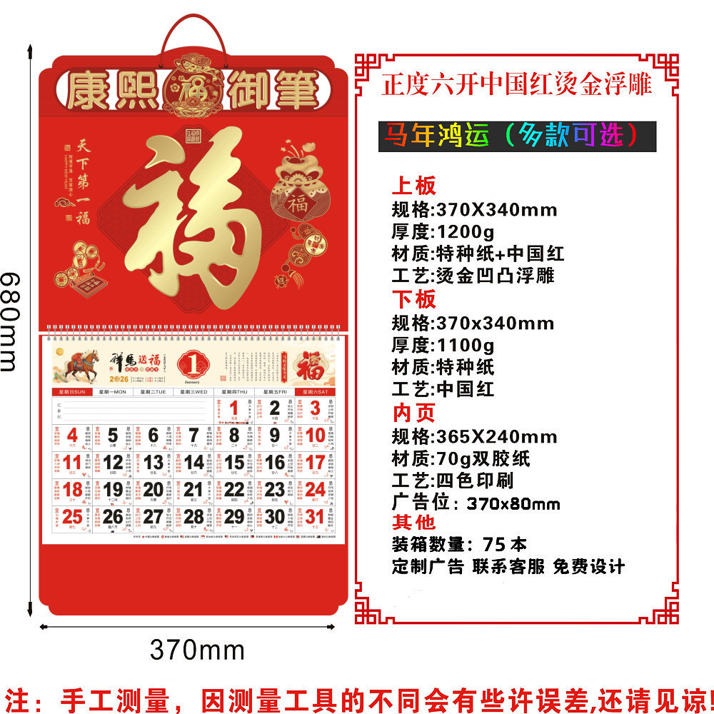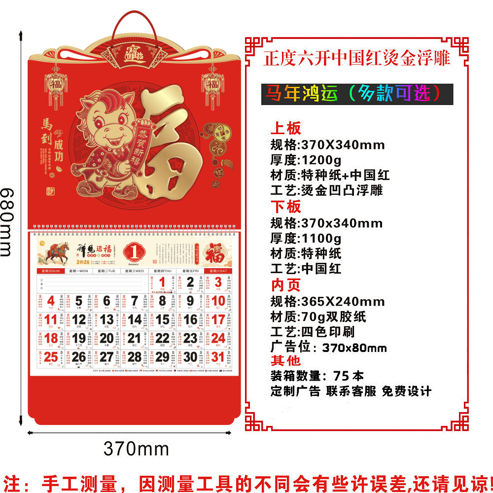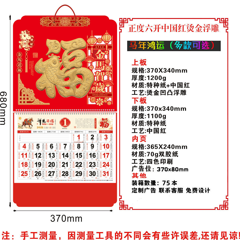 挂历 2026年加厚正六开中国红浮雕镂空挂历定制大药房挂历手撕月
