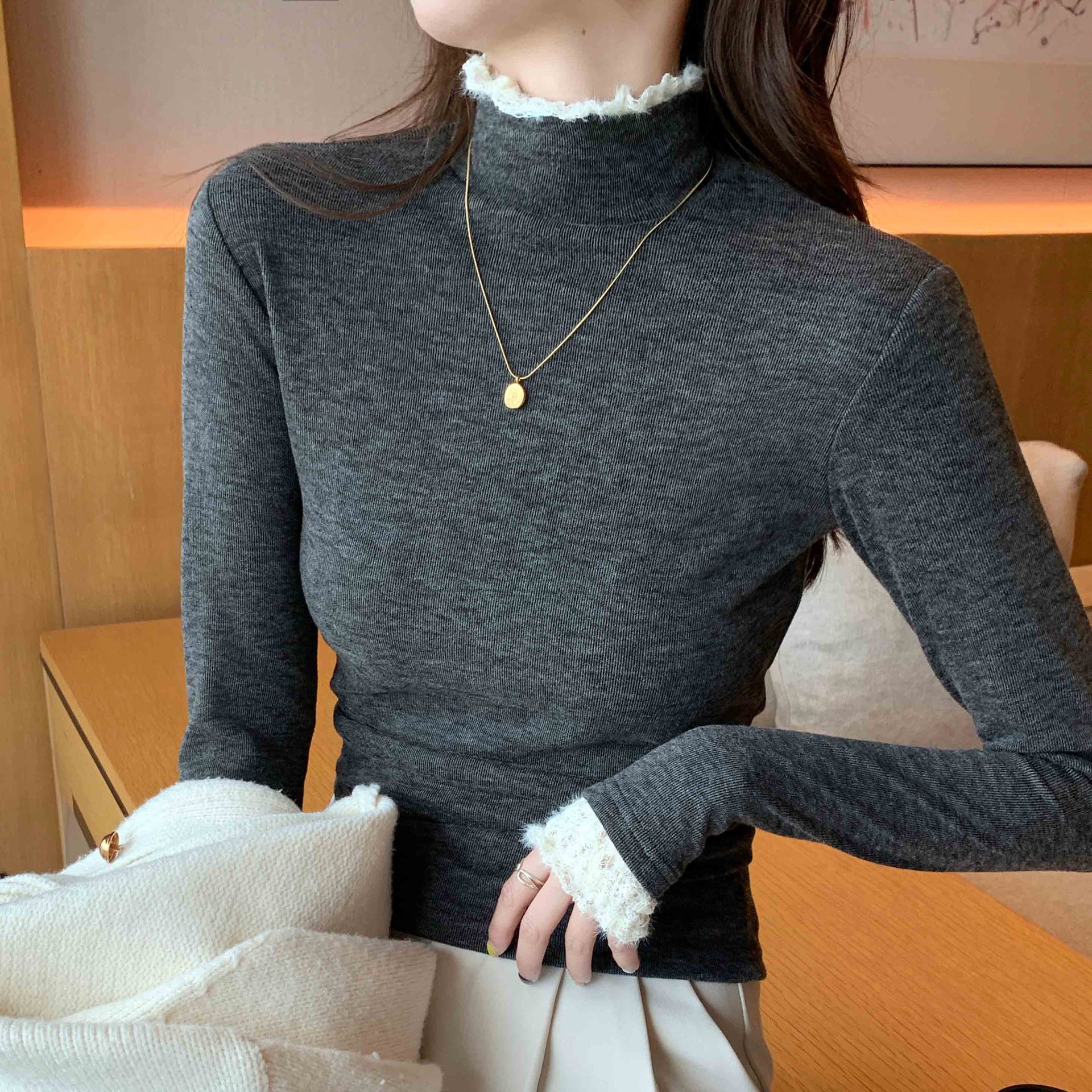 H270蕾丝拼接半高领打底衫女秋冬螺纹修身毛衣花边针织衫内搭上衣