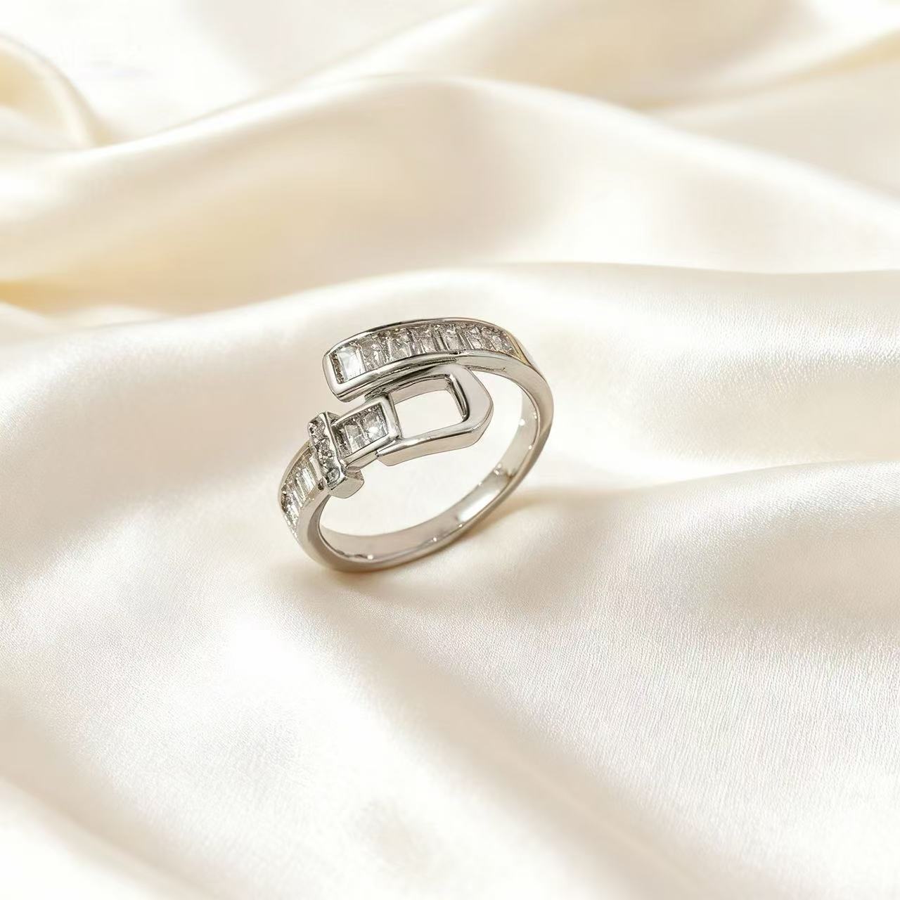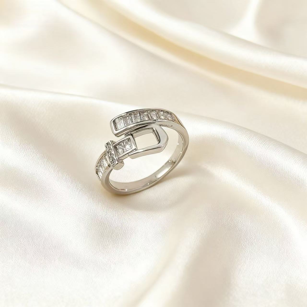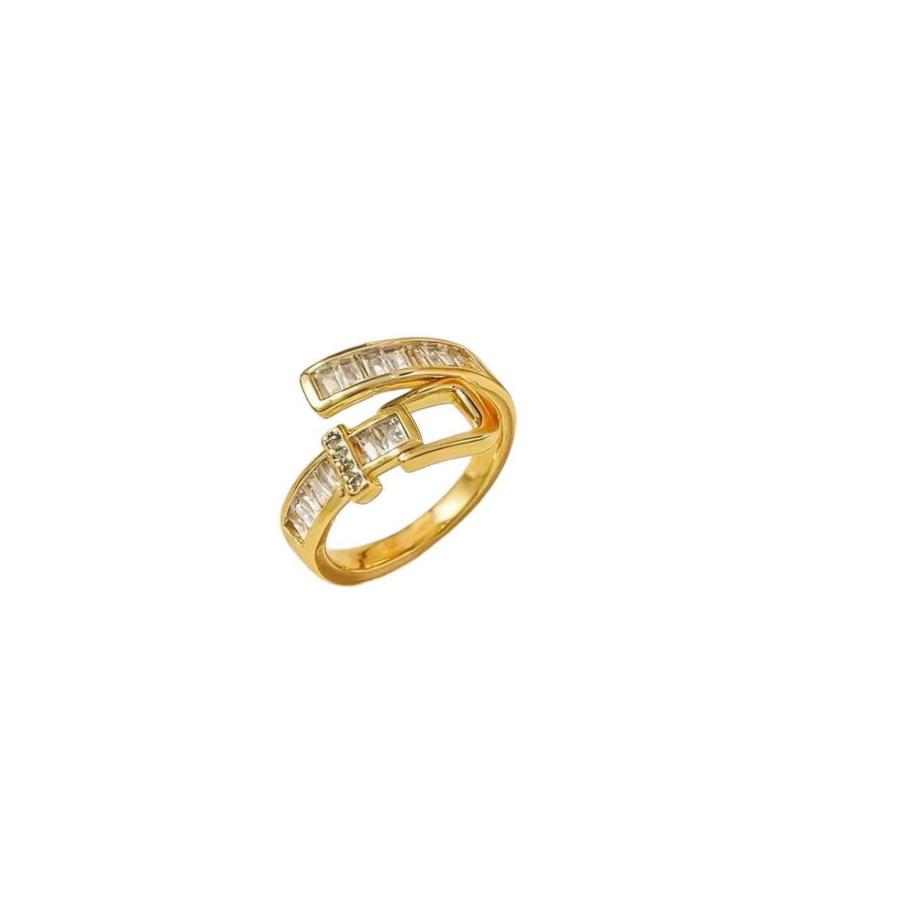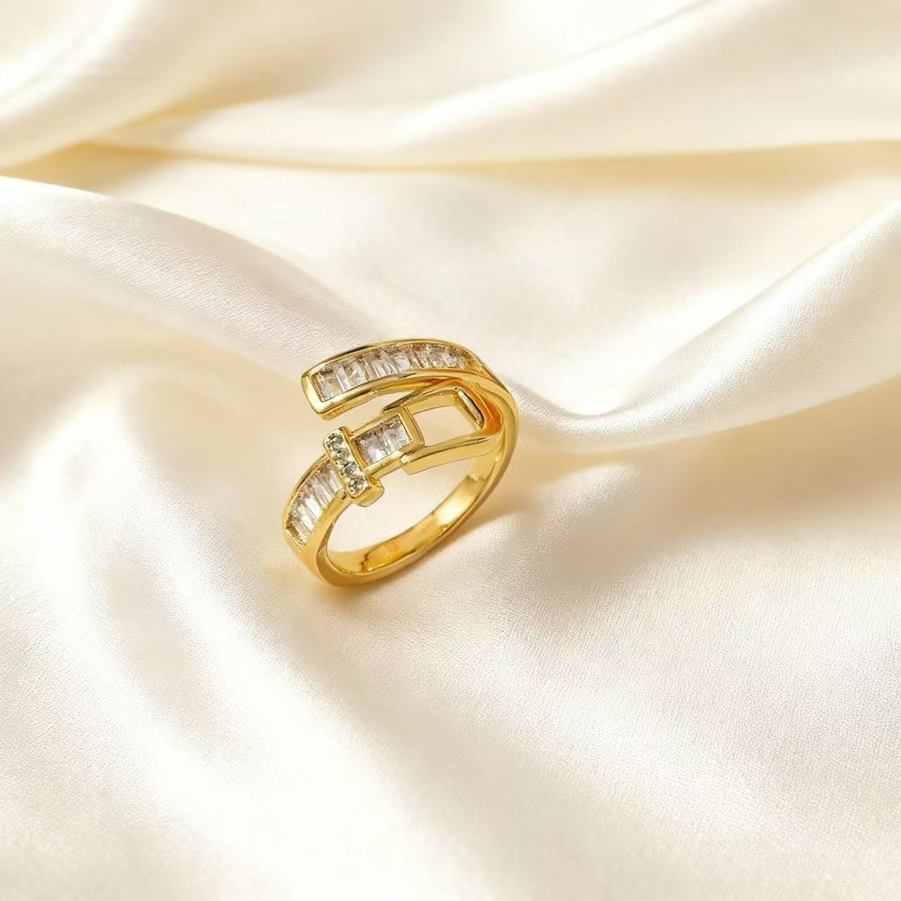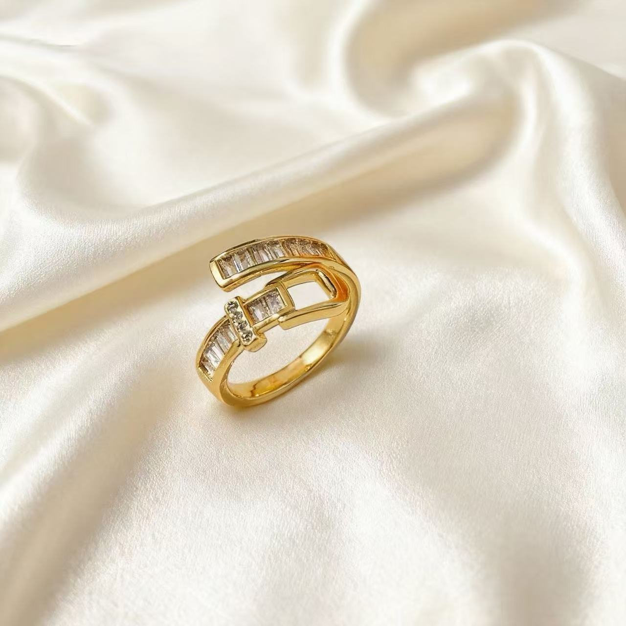 真金电镀个性皮带扣开口戒指高级小众设计微镶锆石指环可调节戒圈