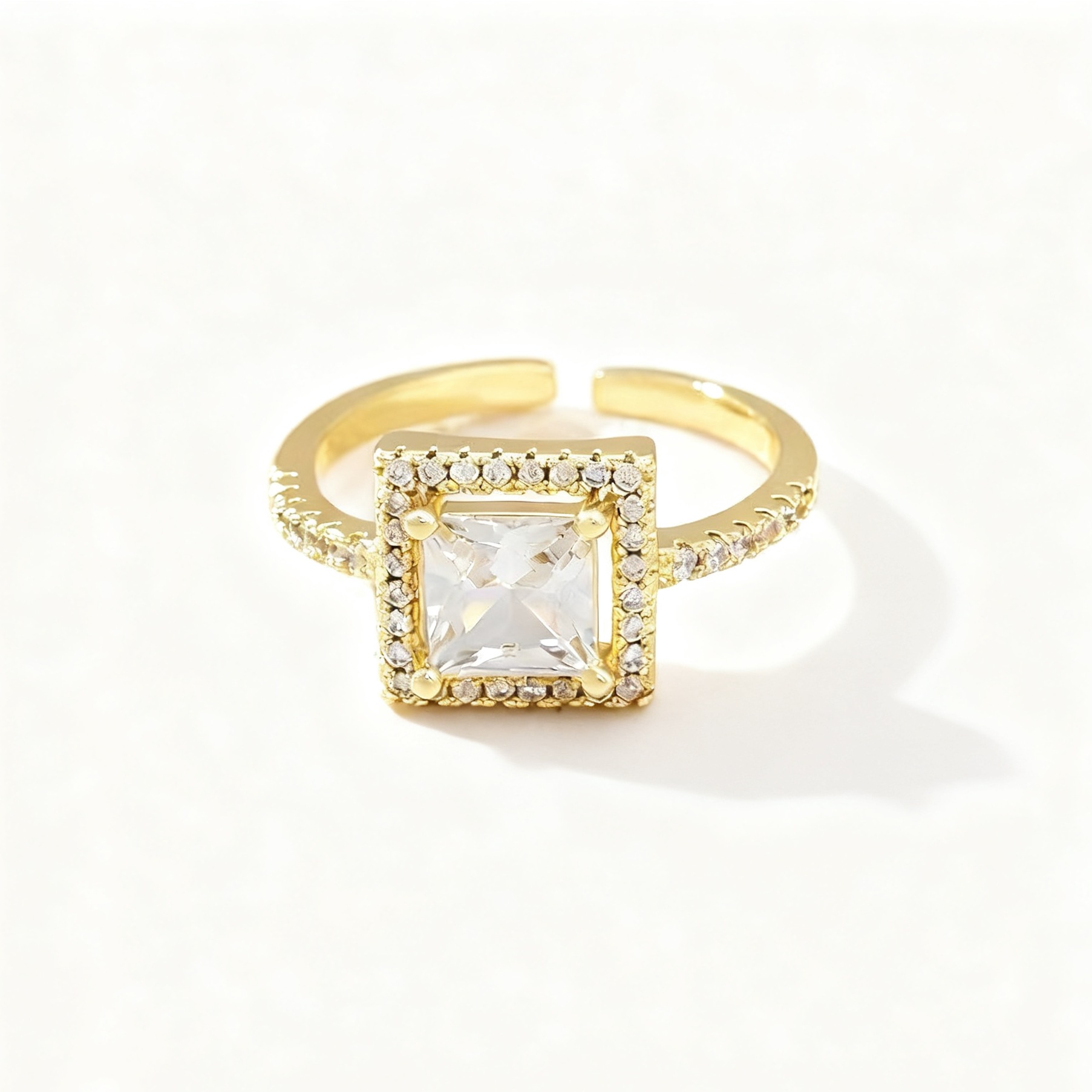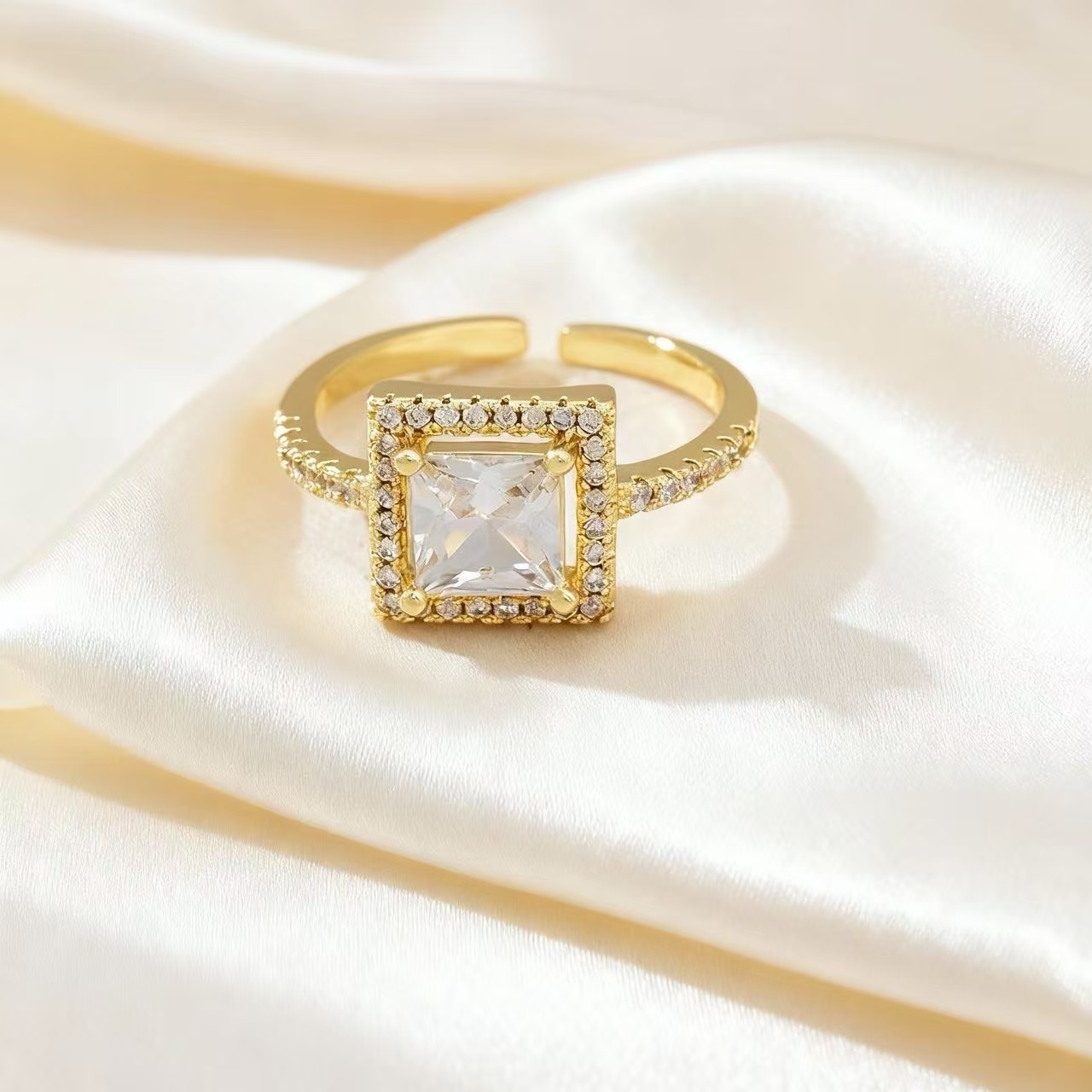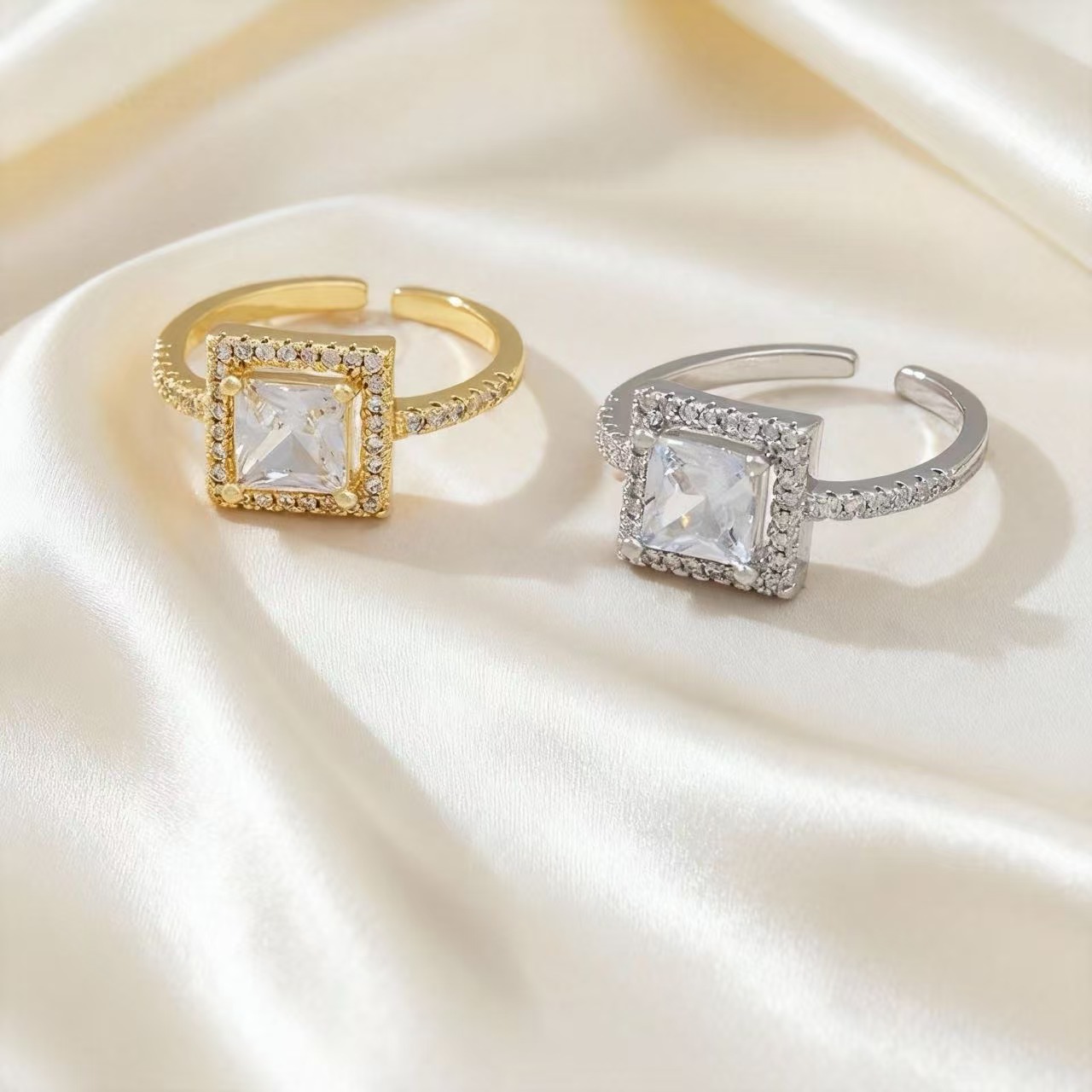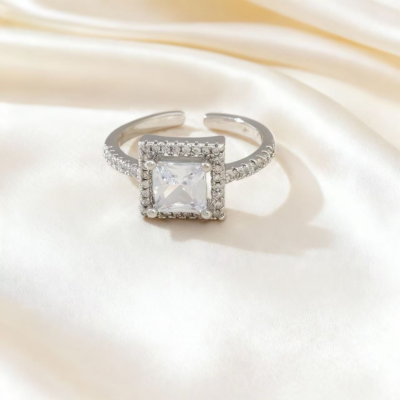 韩版轻奢锆石超闪戒指ins小众设计方钻冷淡风精致指环开口可调指