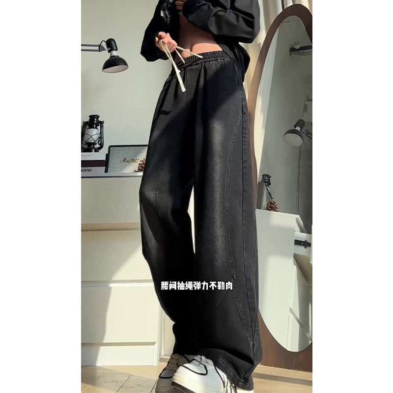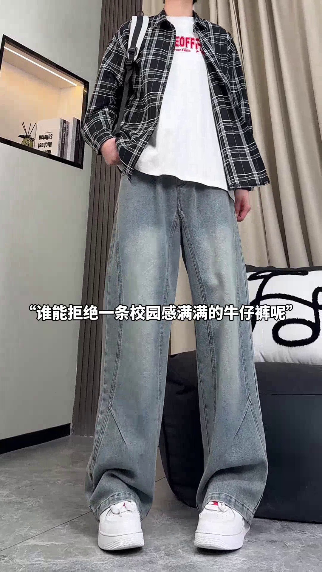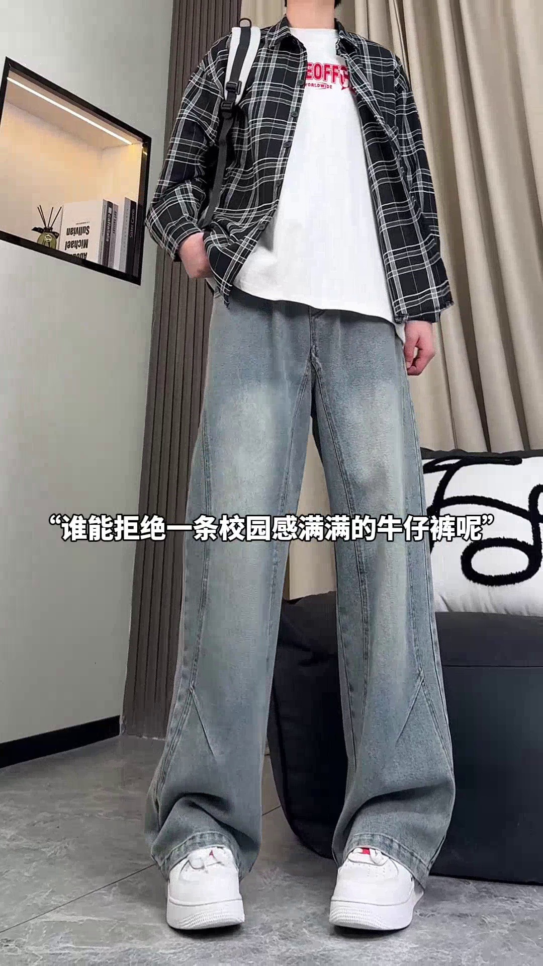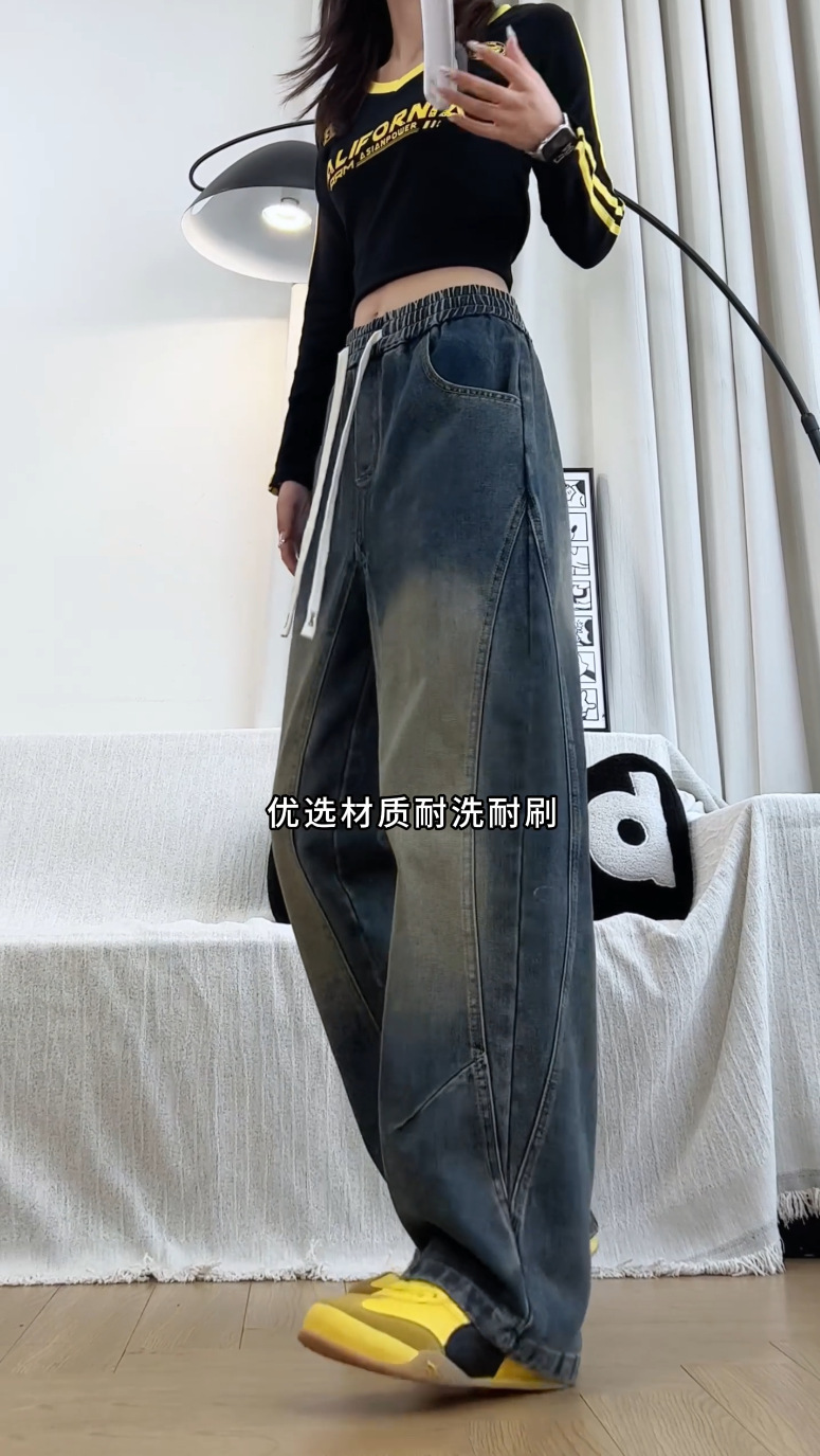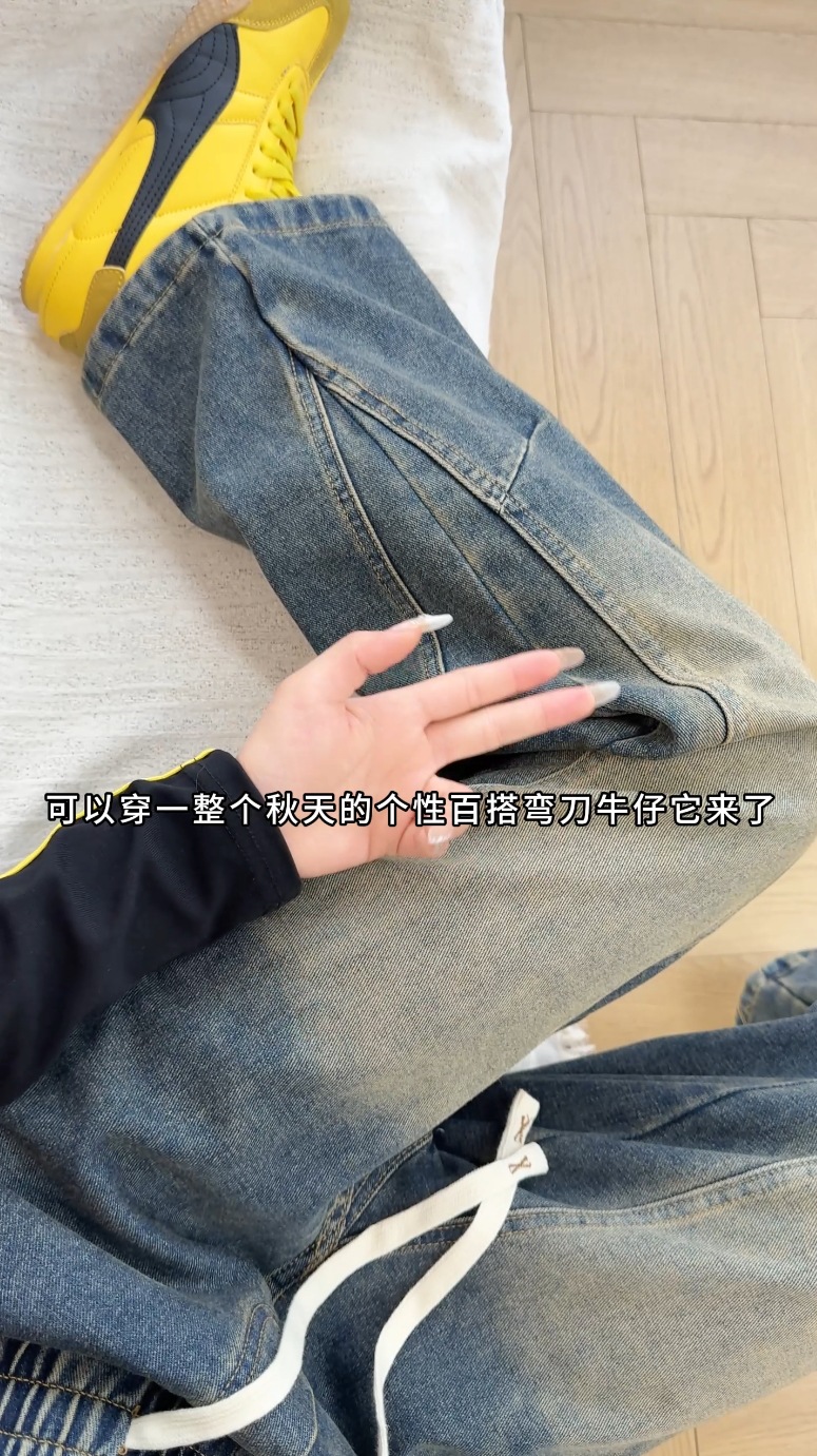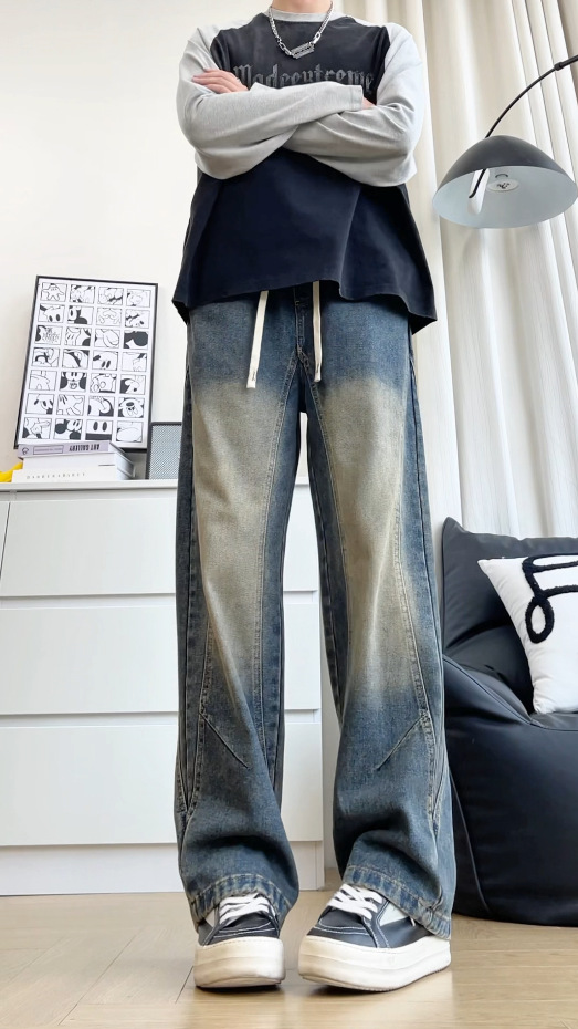 美式弯刀加绒牛仔裤男士冬季宽松大码男裤直筒复古高街厚款裤子
