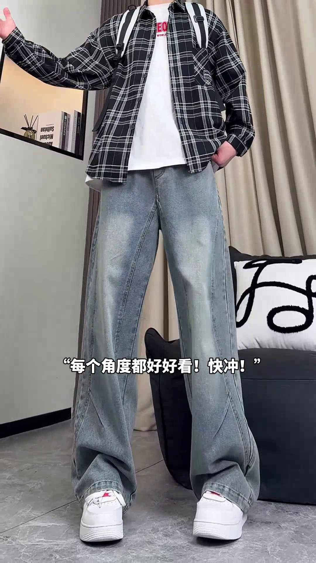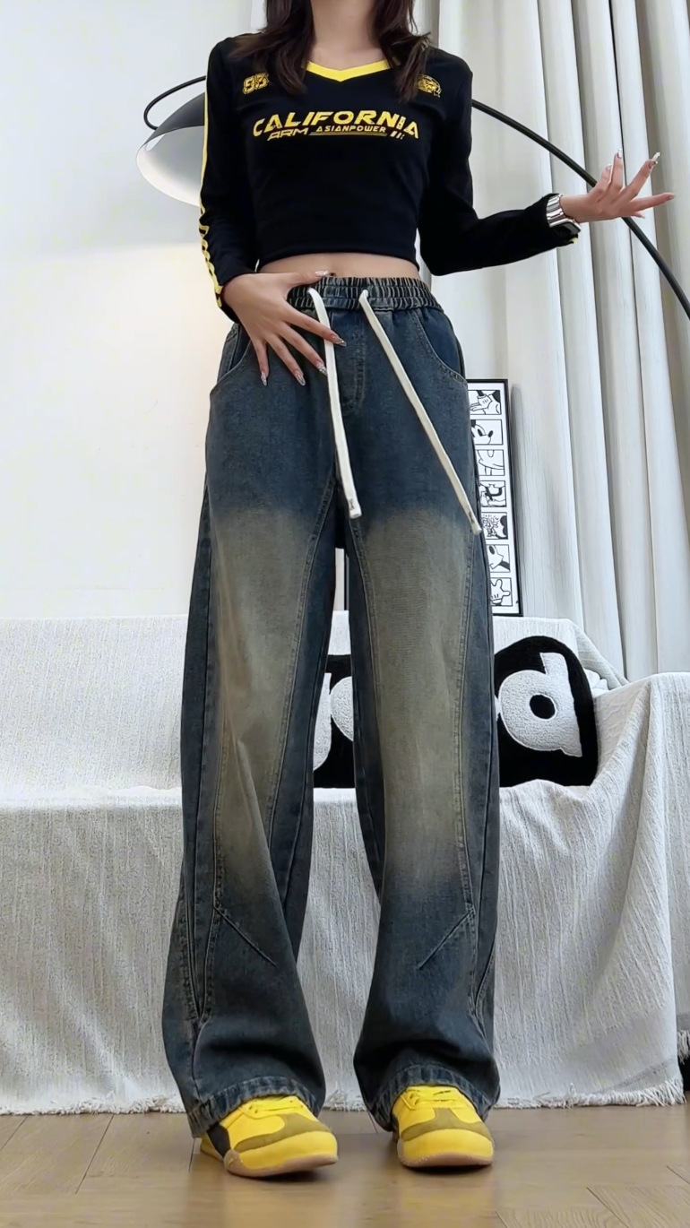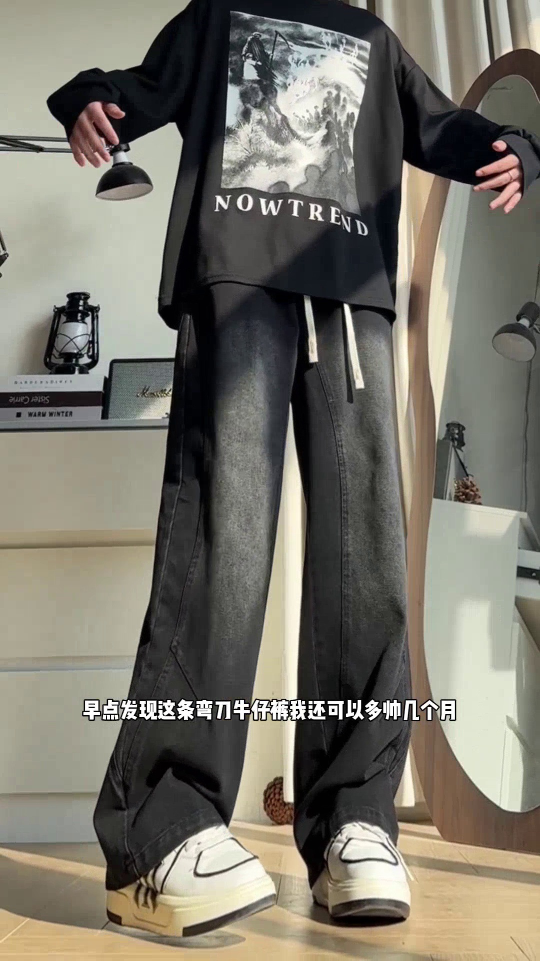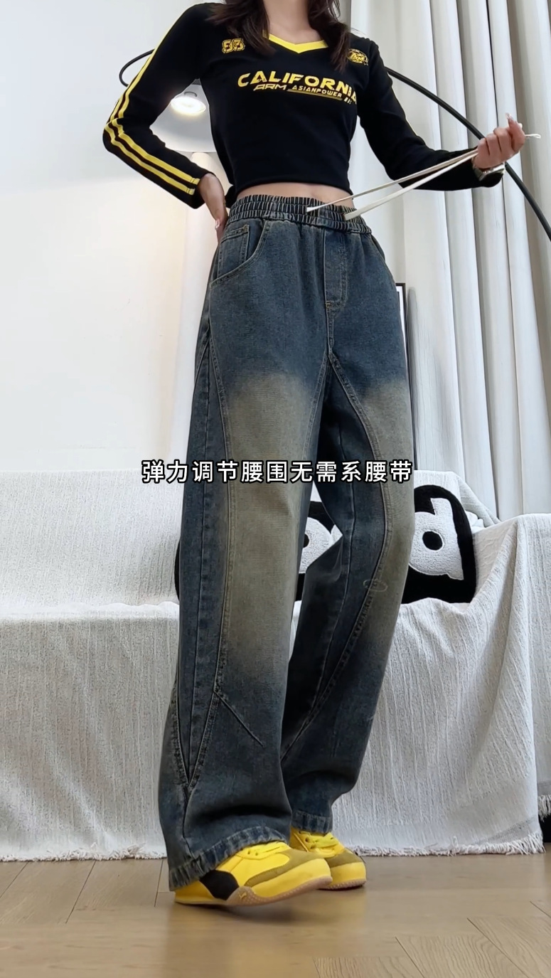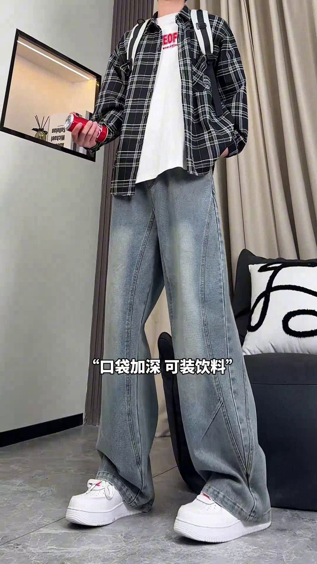 美式弯刀加绒牛仔裤男士冬季宽松大码男裤直筒复古高街厚款裤子
