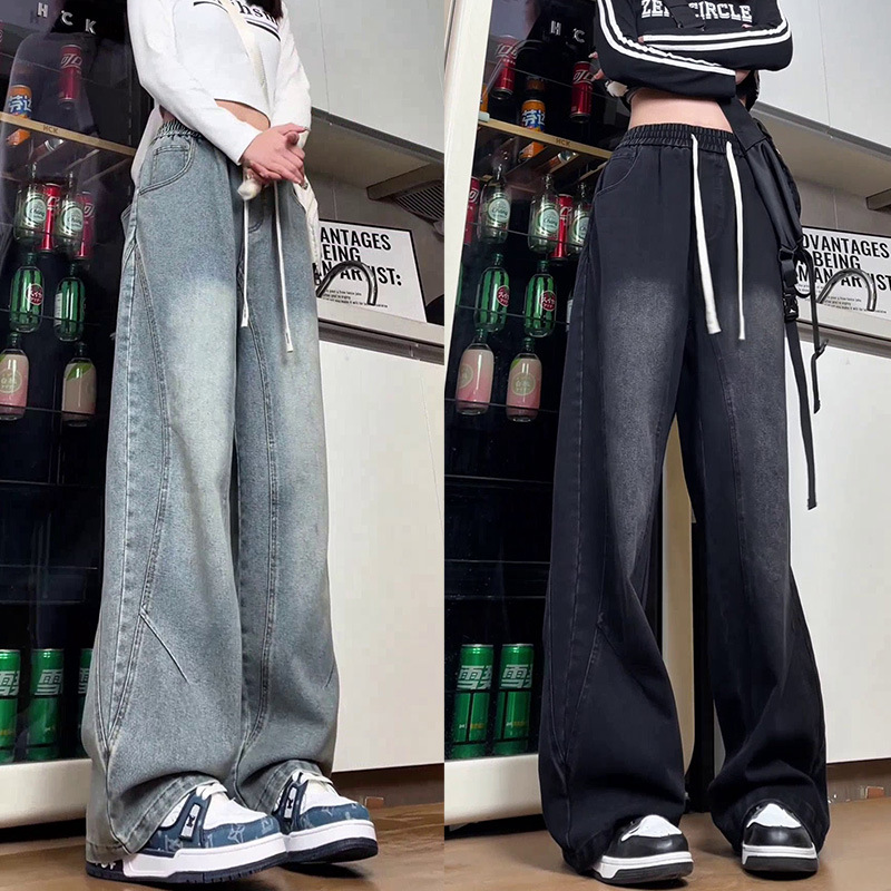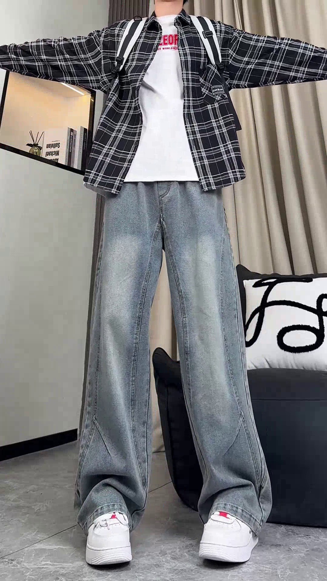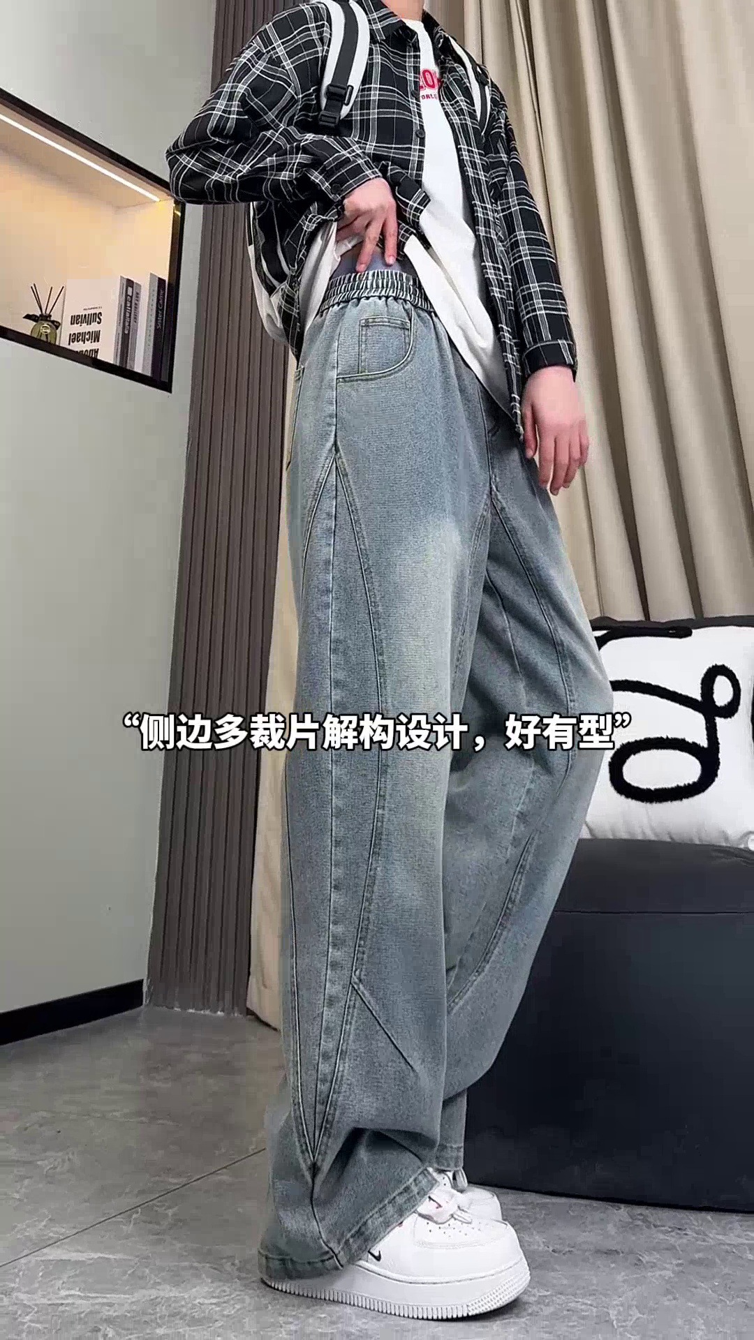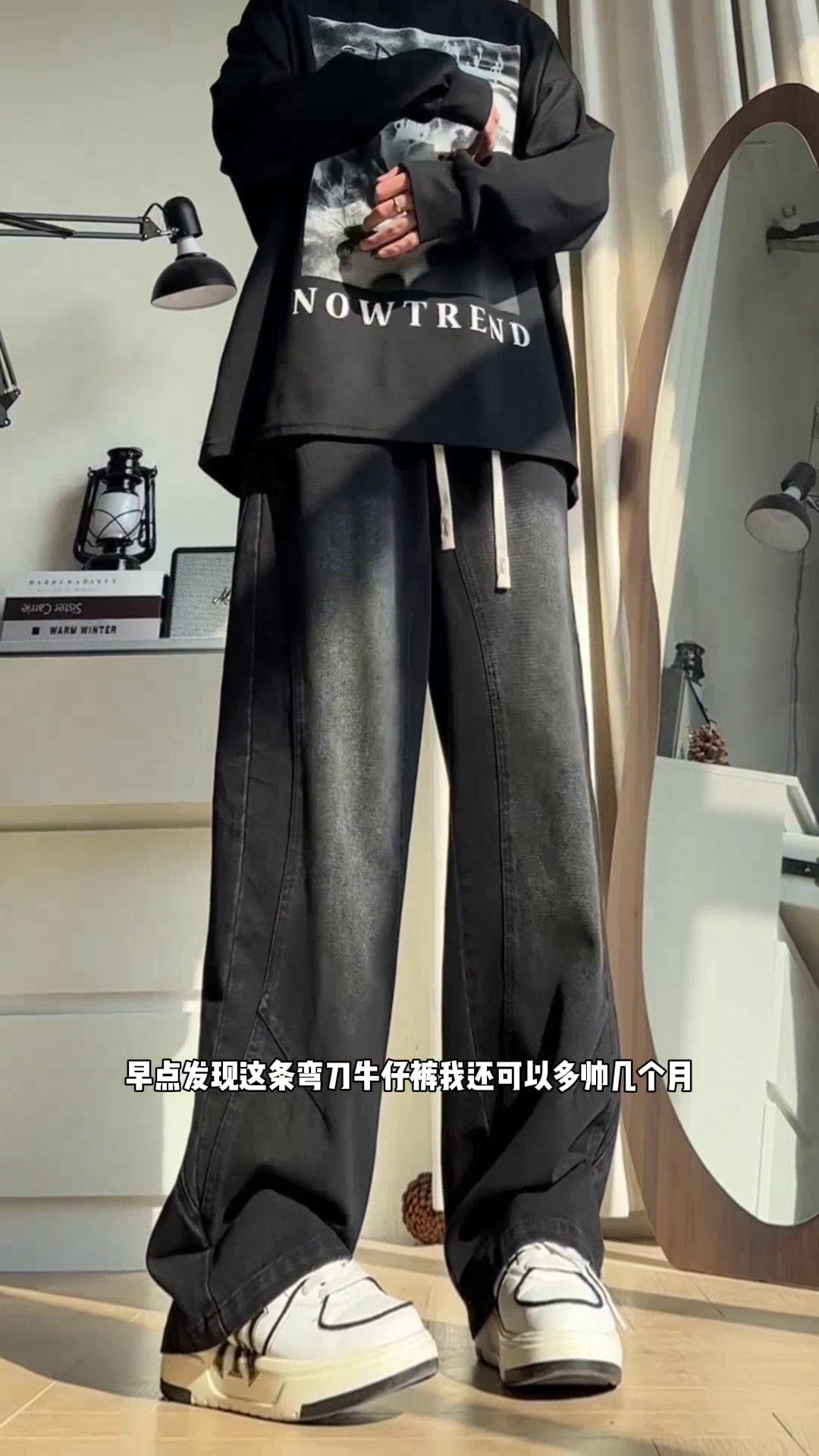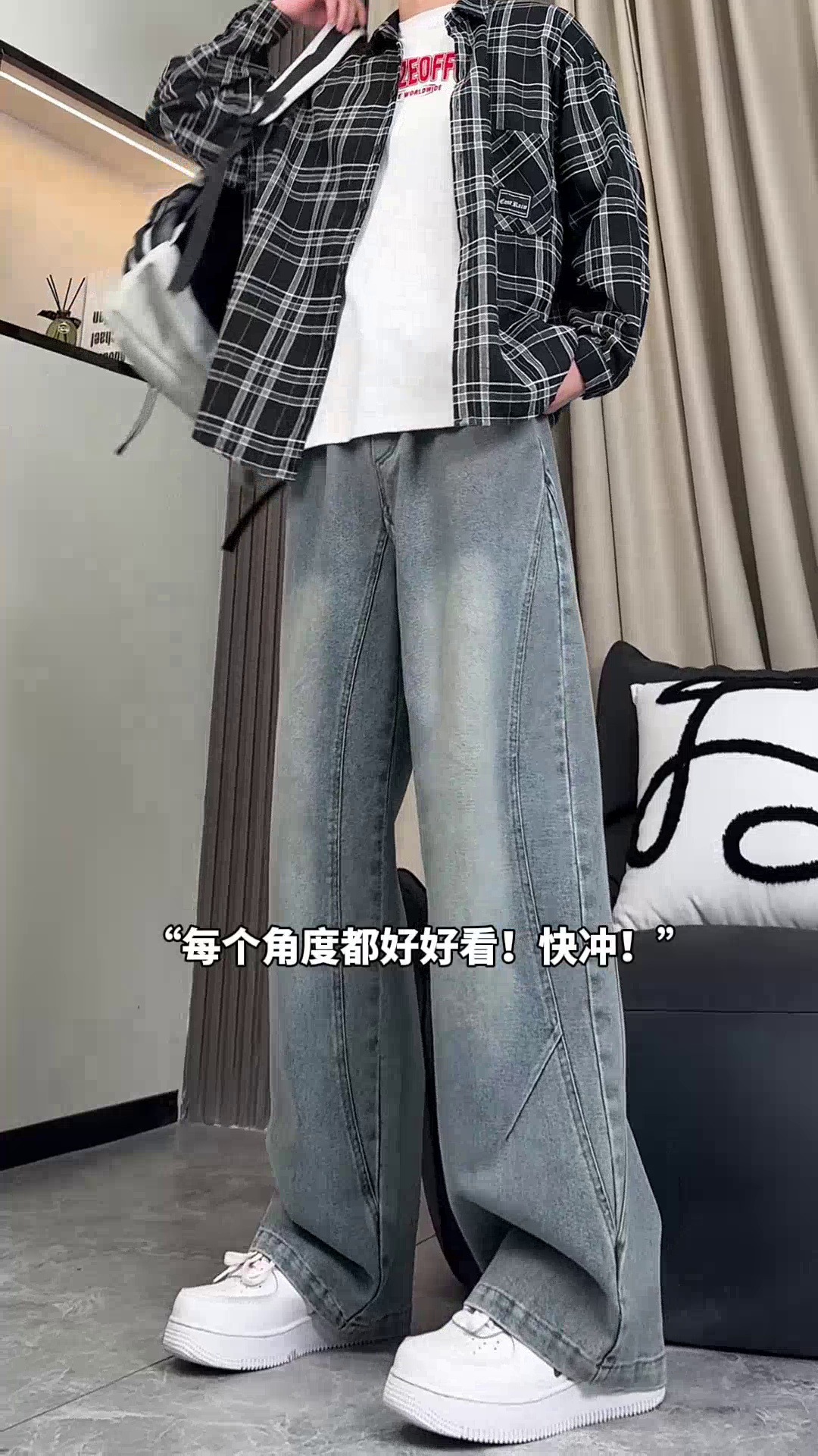 美式弯刀加绒牛仔裤男士冬季宽松大码男裤直筒复古高街厚款裤子