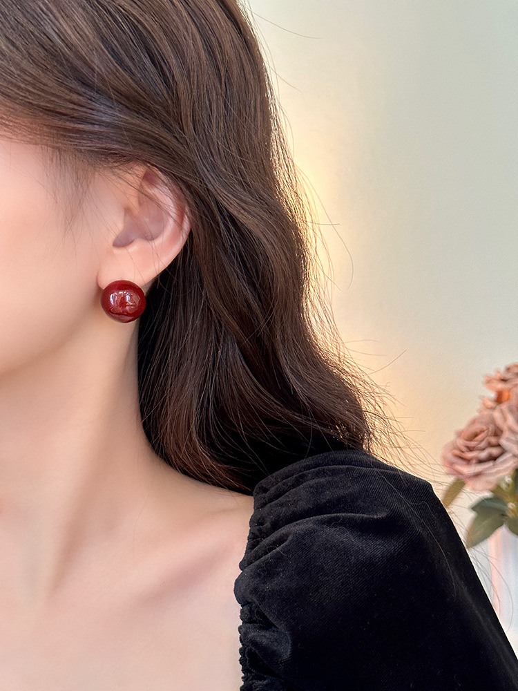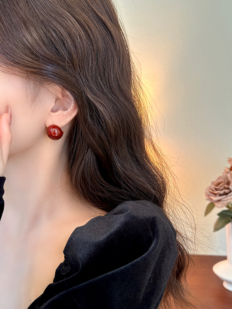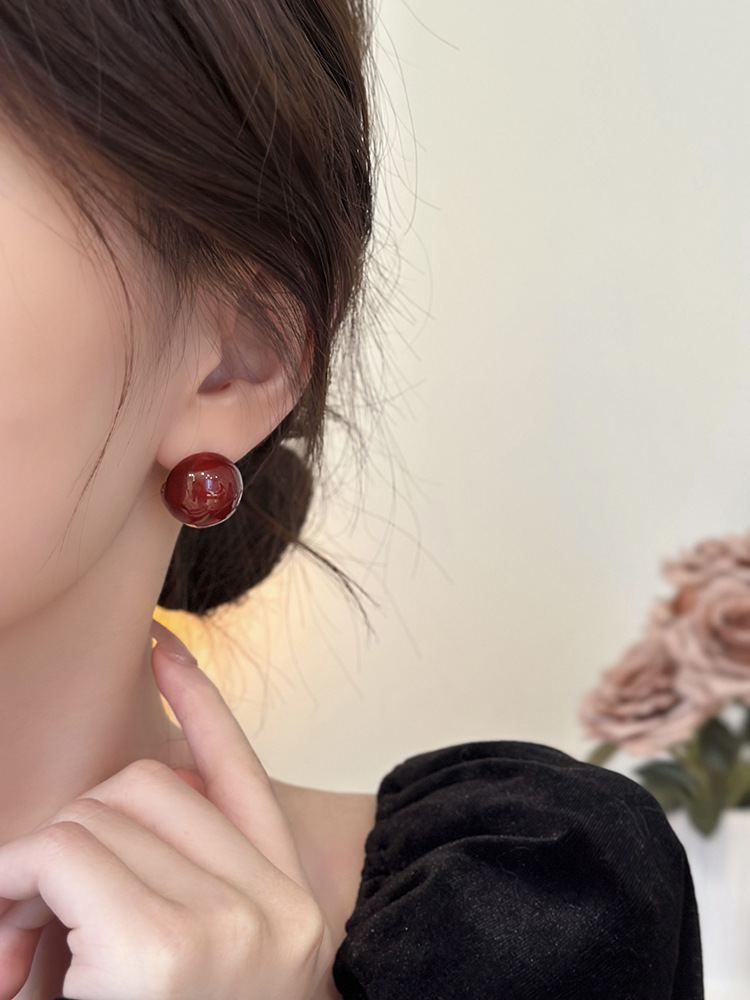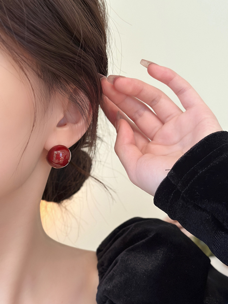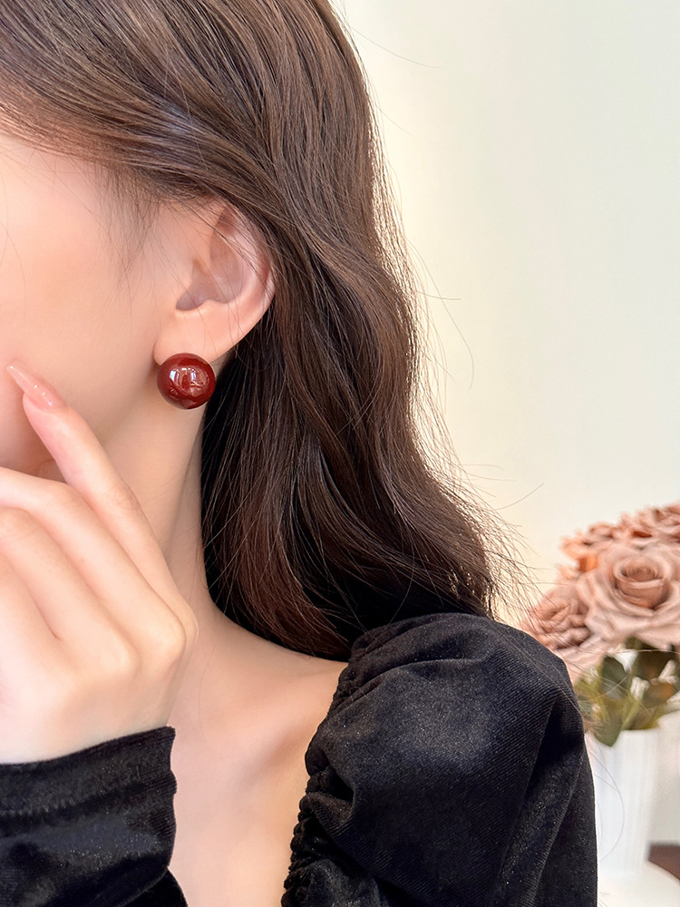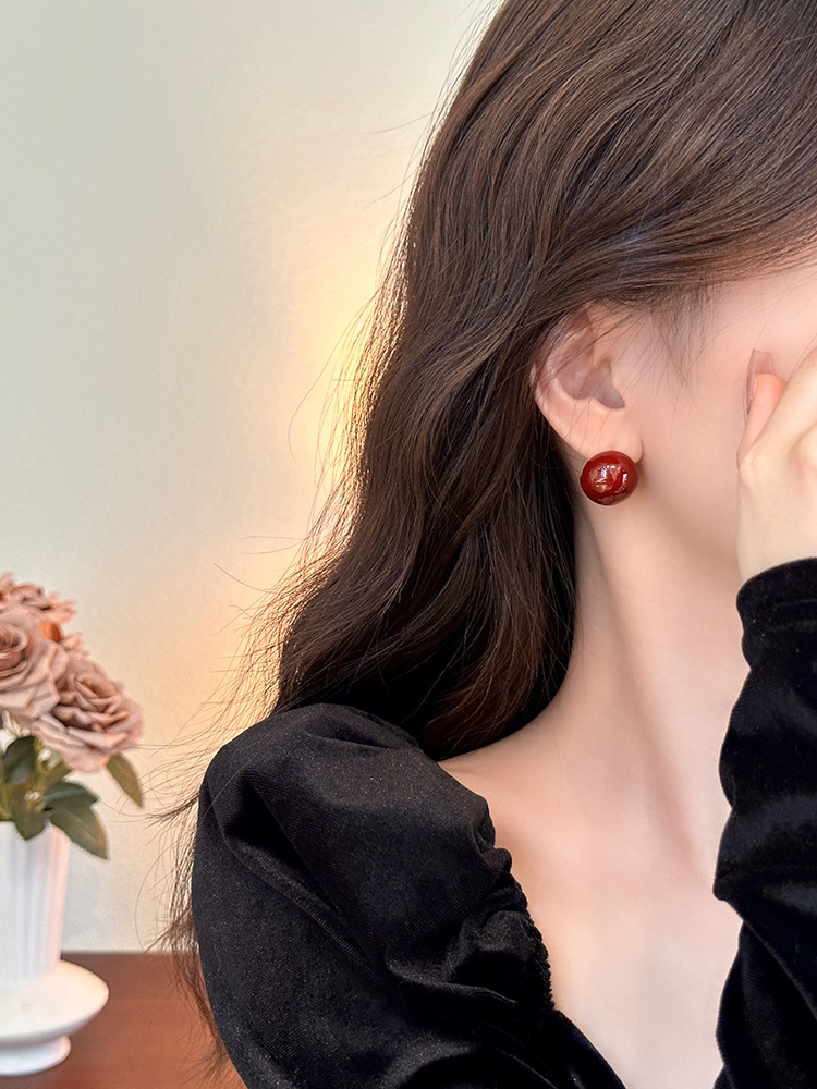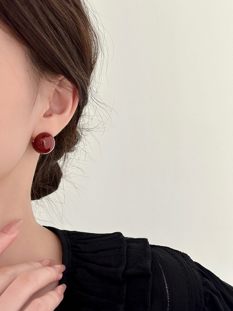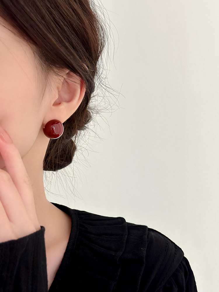 秋冬新年红色耳钉S925银针勃艮第红色滴油高级耳钉耳饰气质耳环
