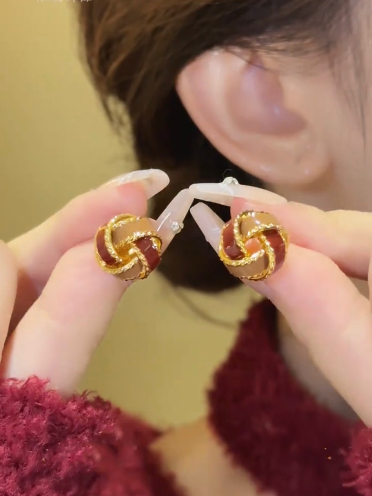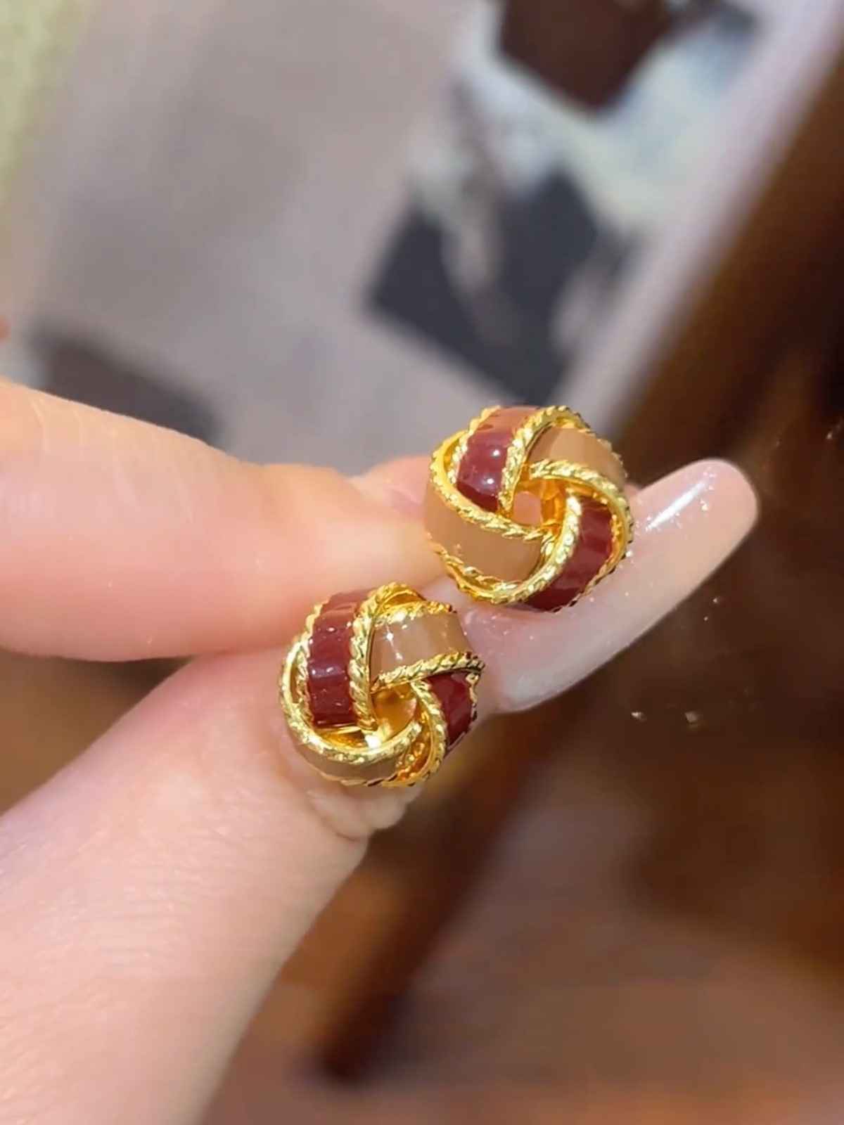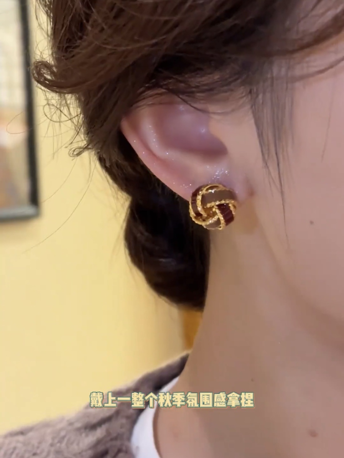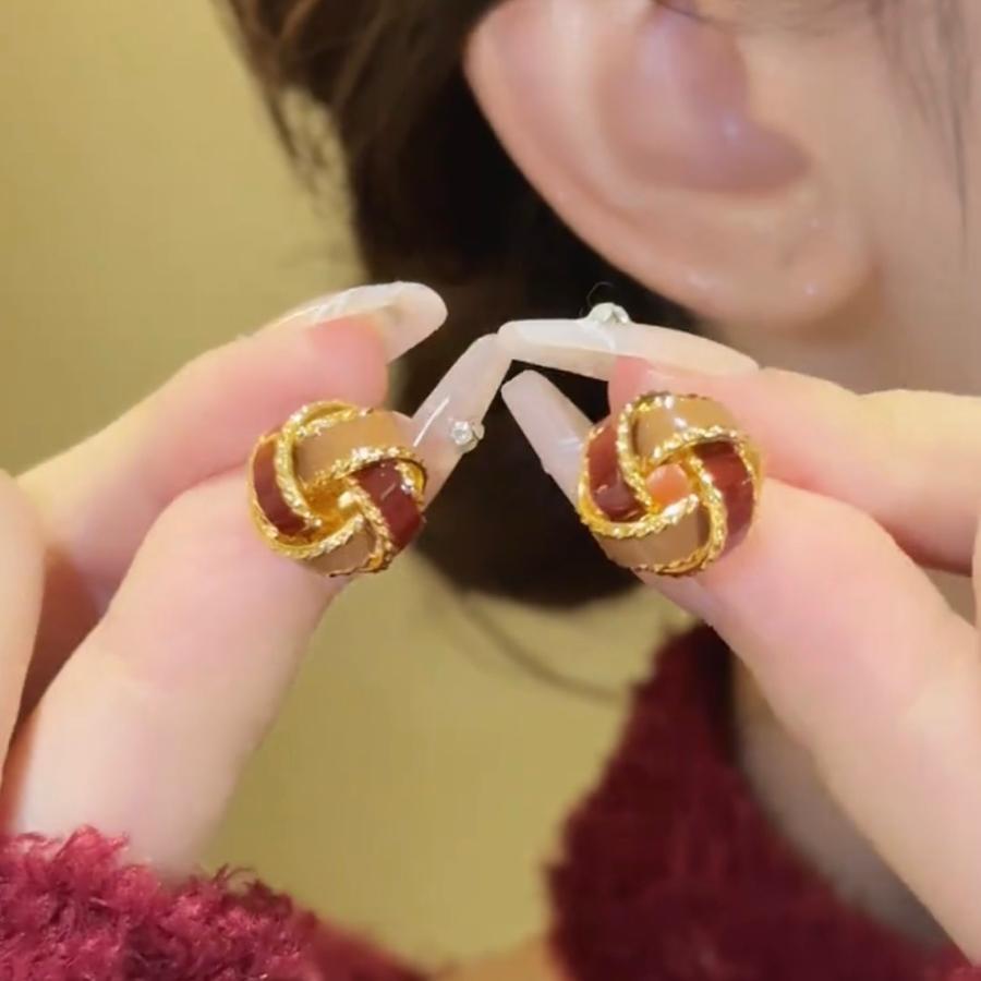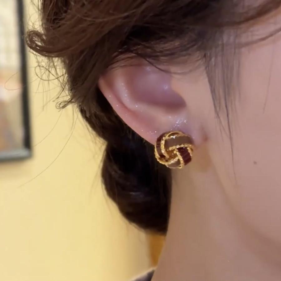 咖红拼色同心结耳钉女S925银针小众设计感耳环轻奢耳饰秋冬美拉德