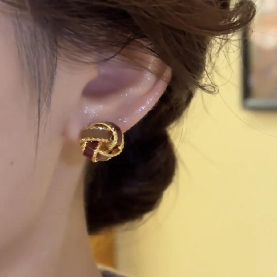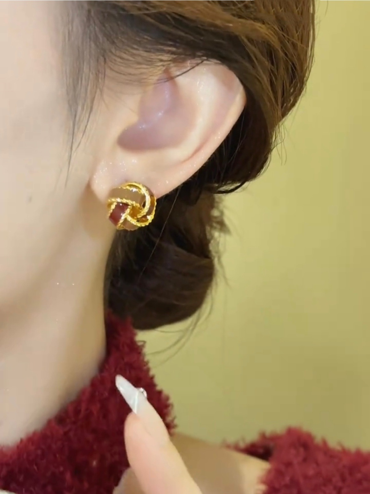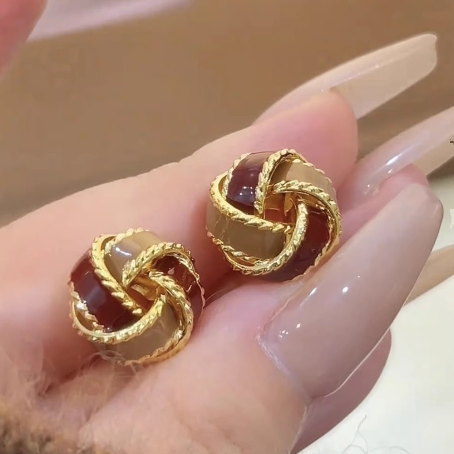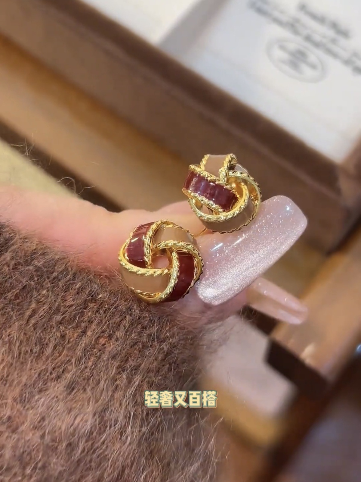 咖红拼色同心结耳钉女S925银针小众设计感耳环轻奢耳饰秋冬美拉德