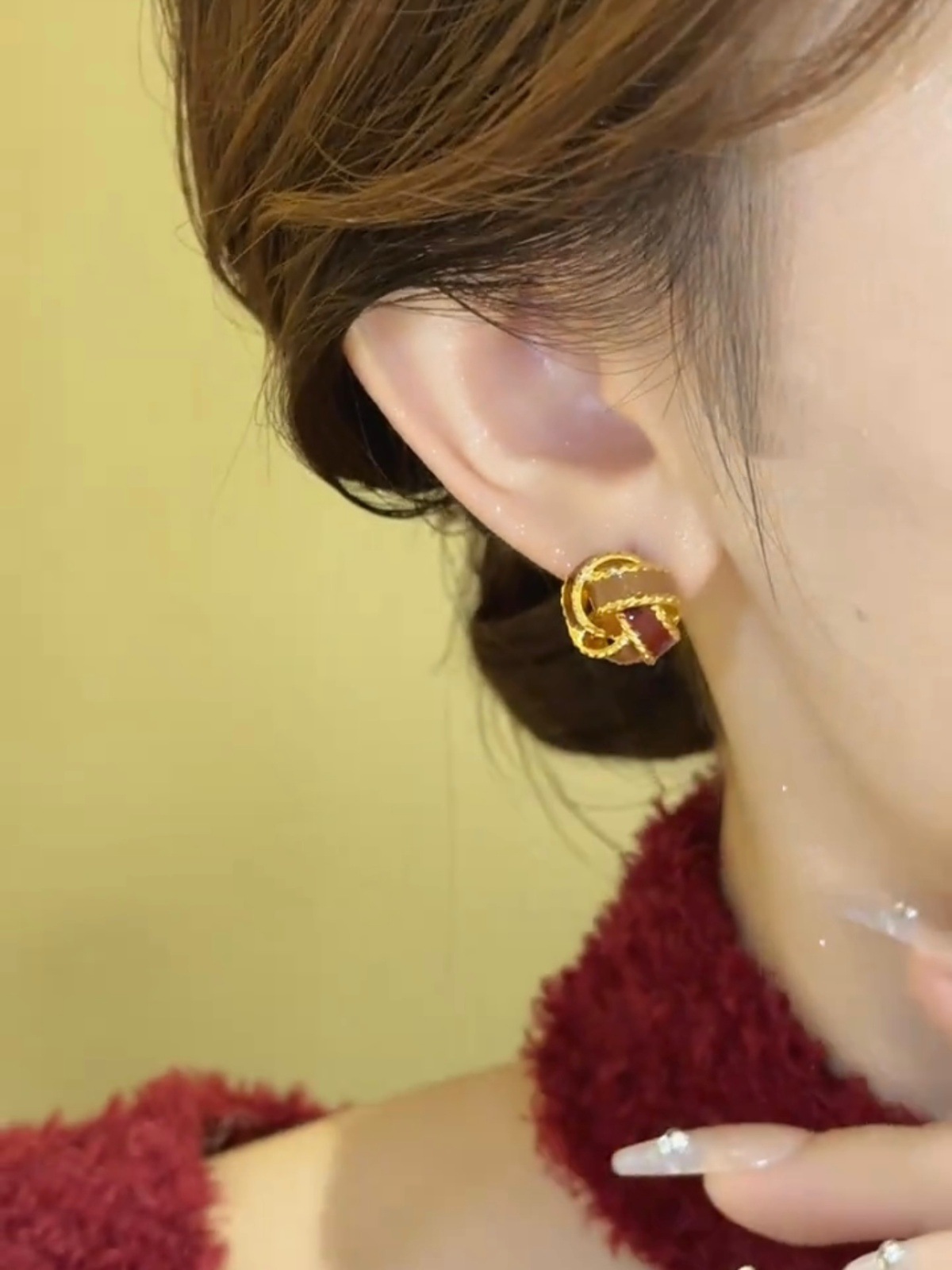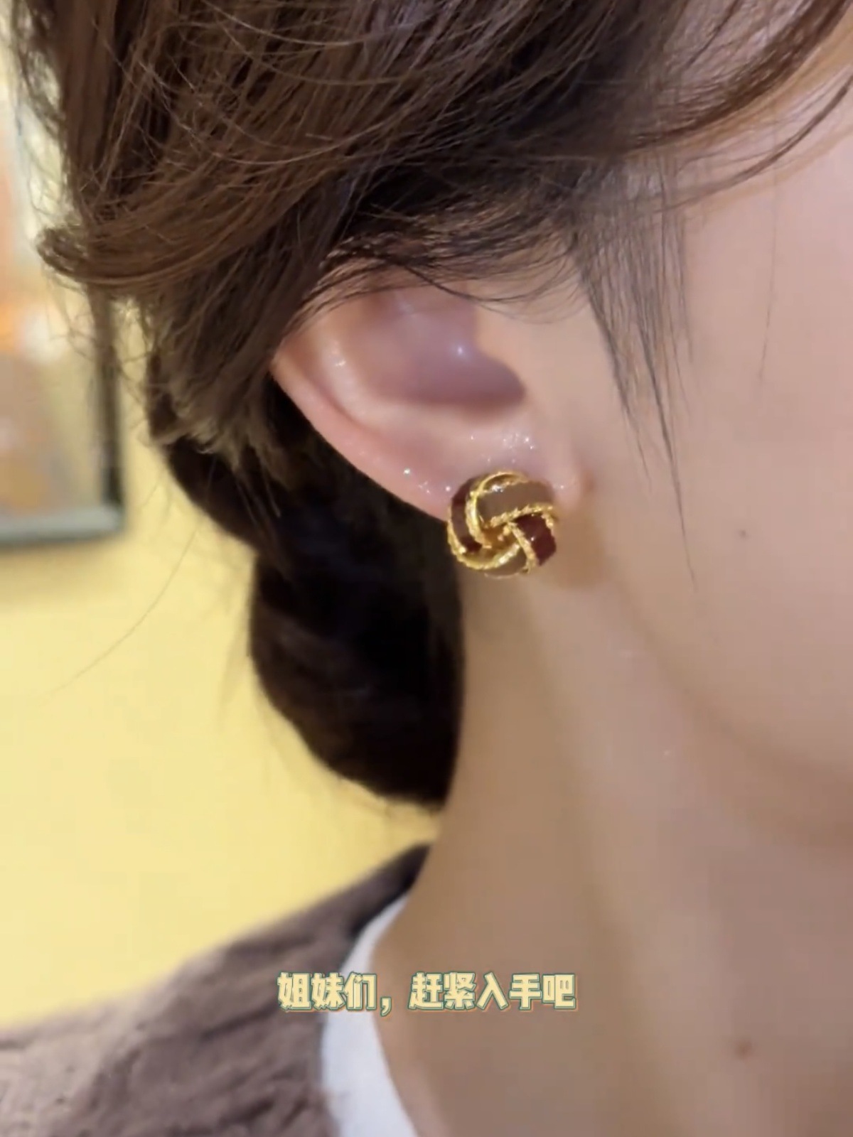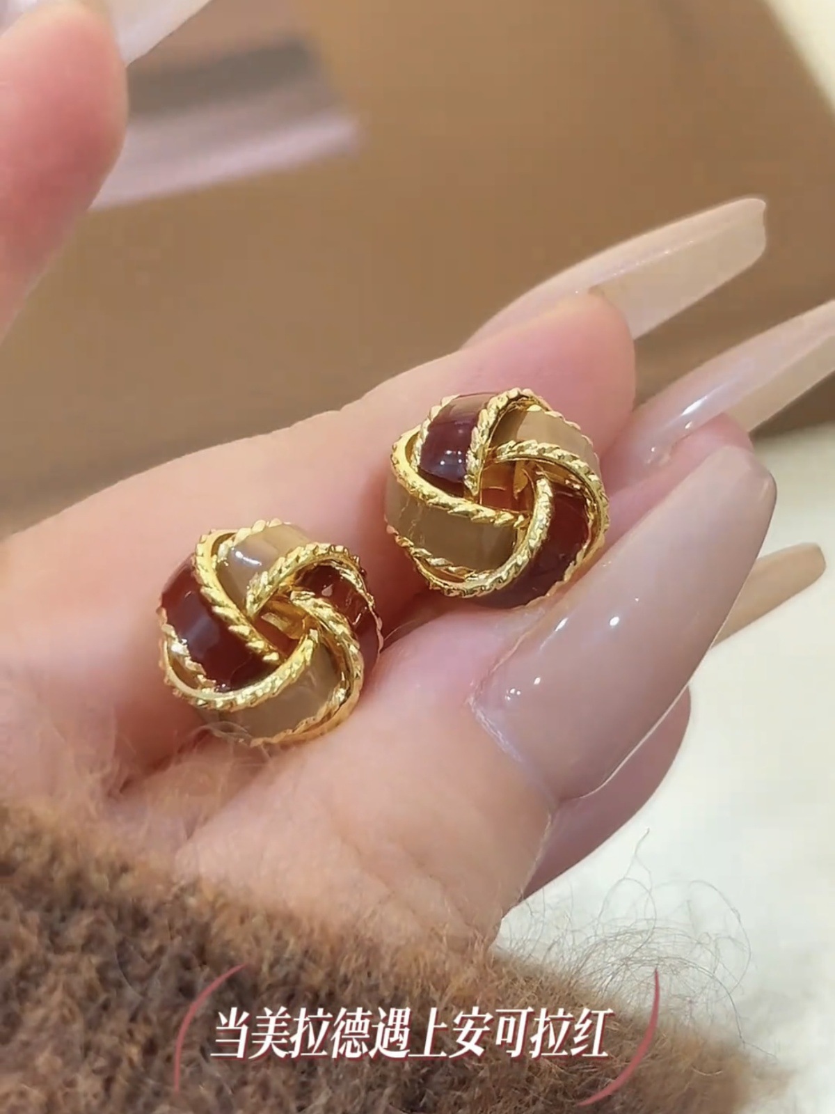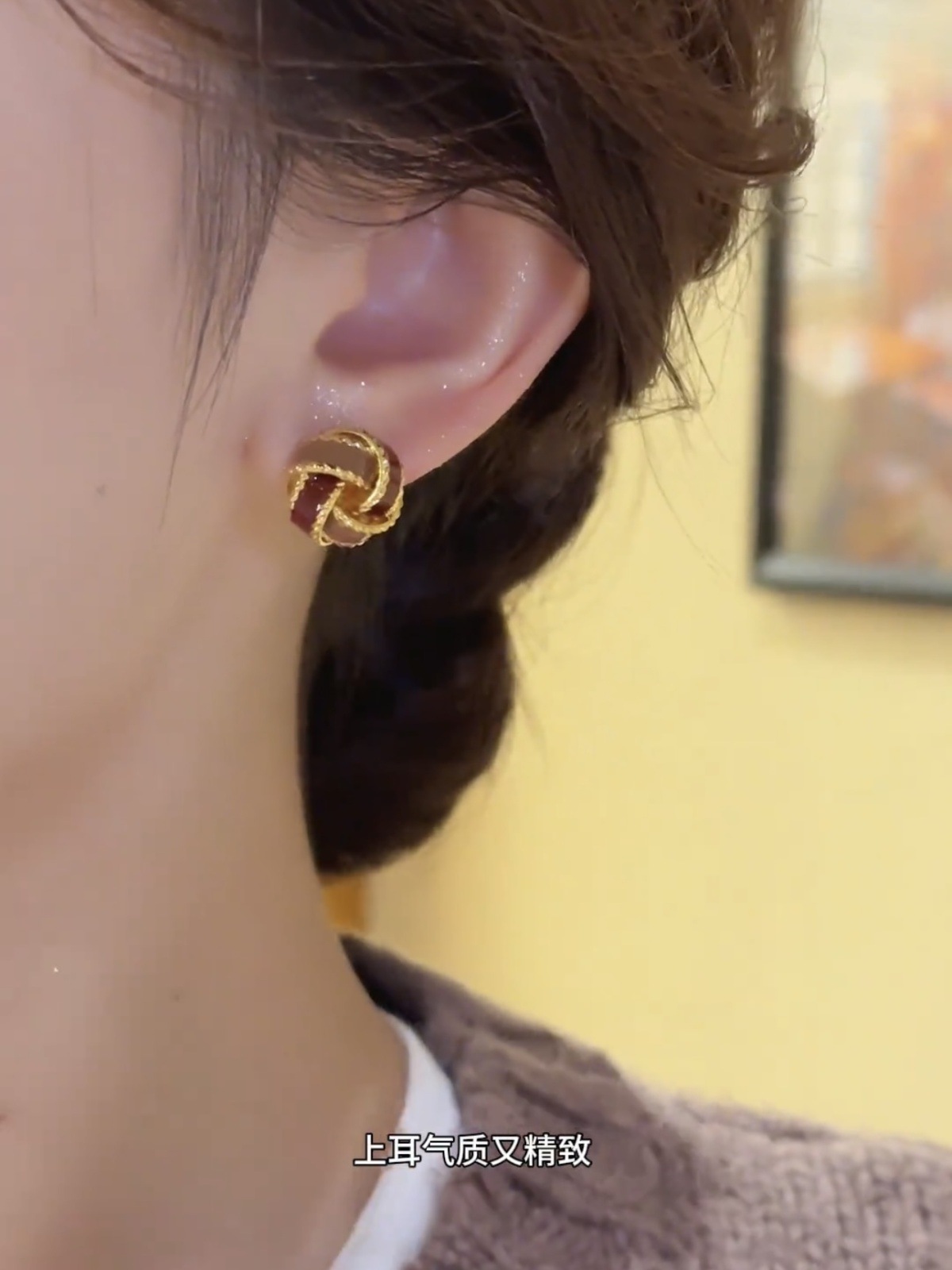 咖红拼色同心结耳钉女S925银针小众设计感耳环轻奢耳饰秋冬美拉德