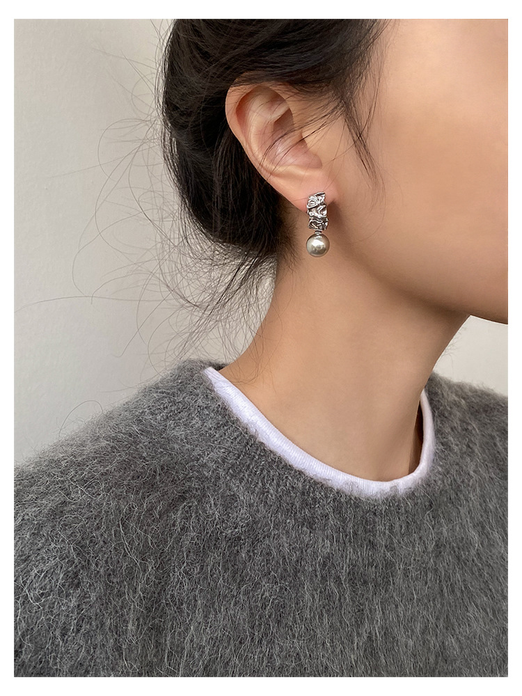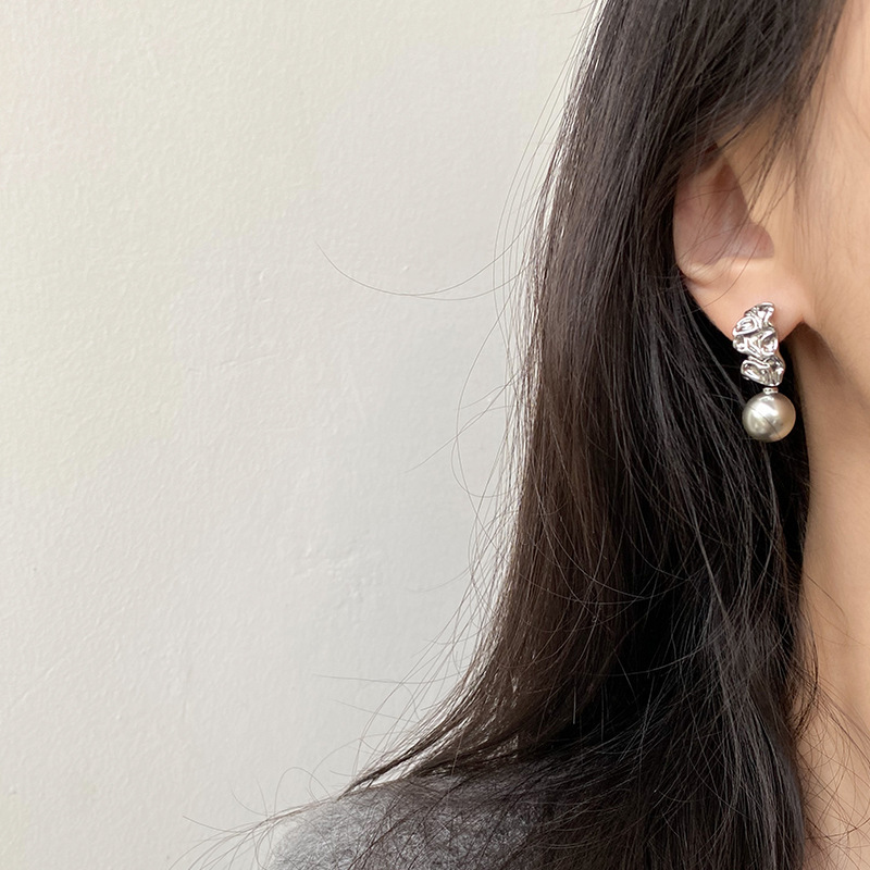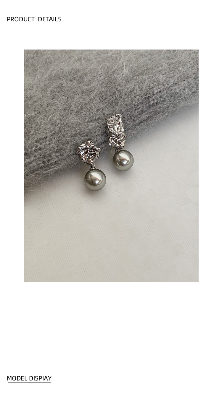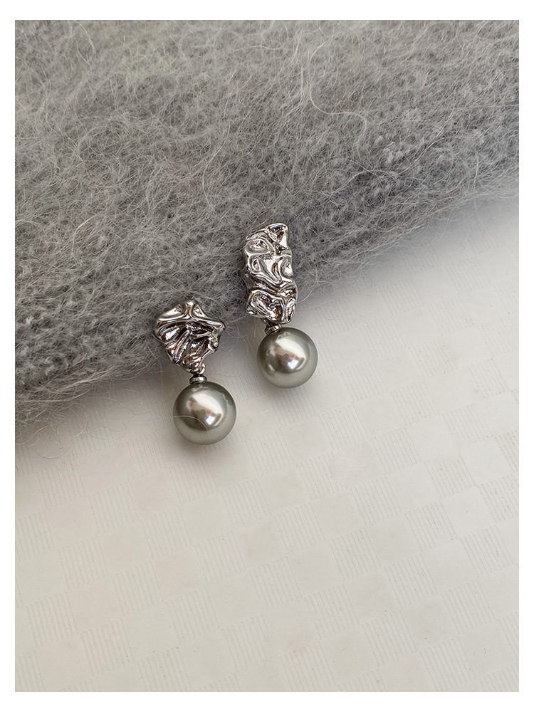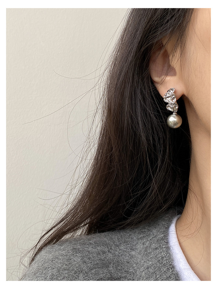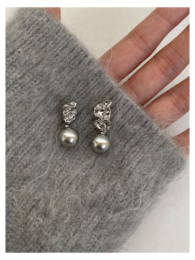 不规则纹理灰珍珠灰岩浆925银针熔岩肌理灰色珍珠耳环高级感耳钉