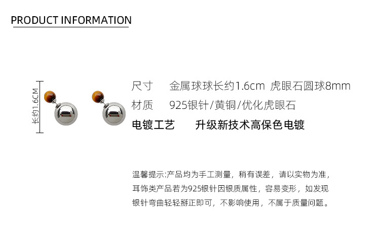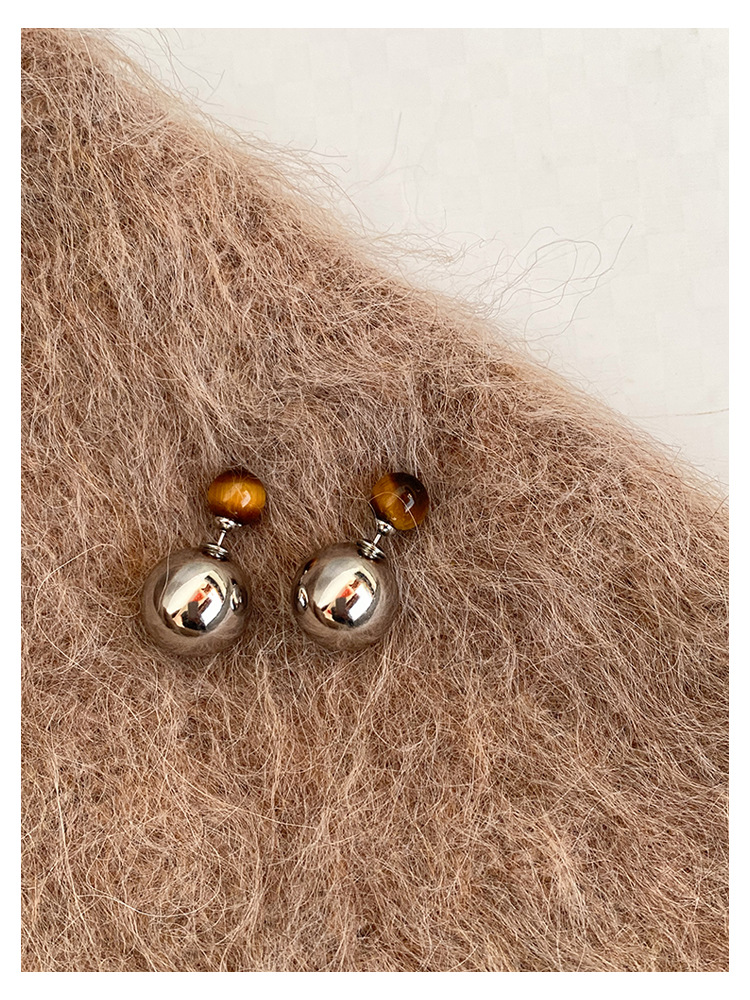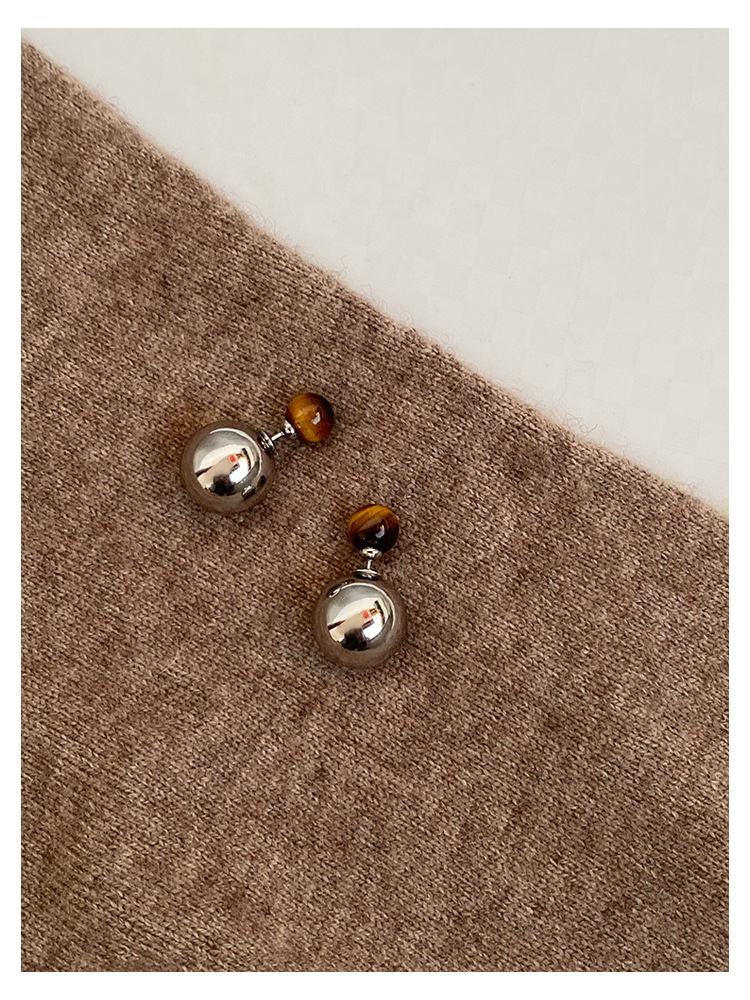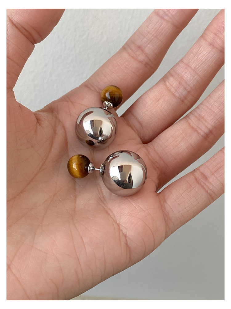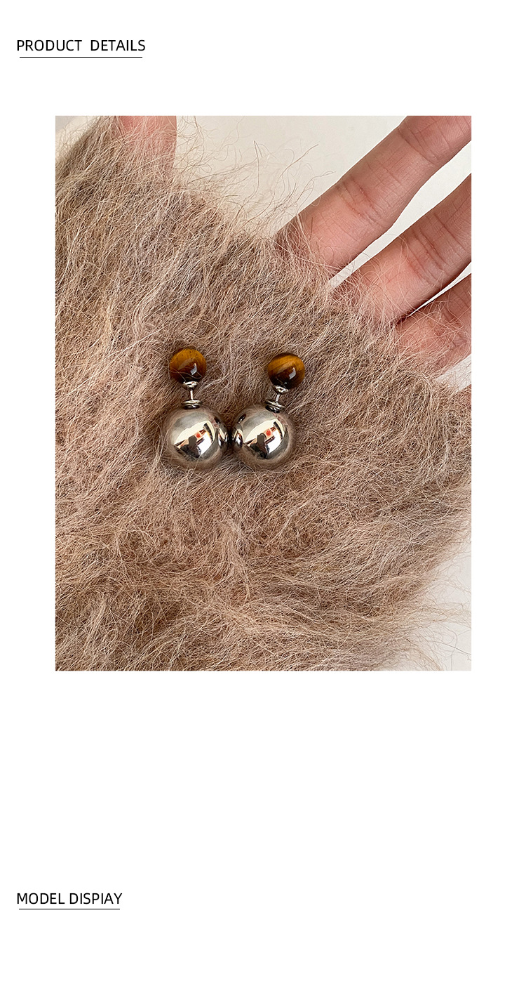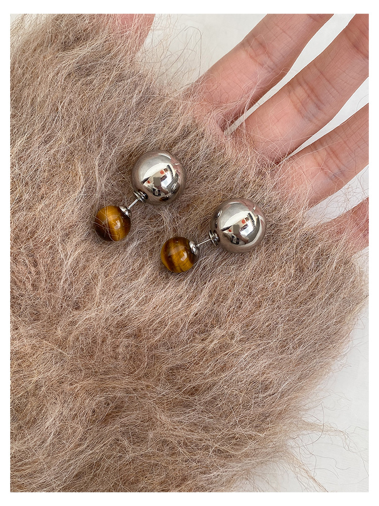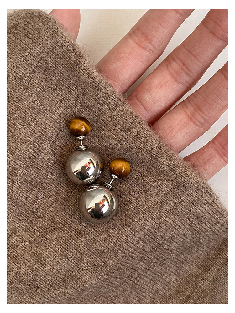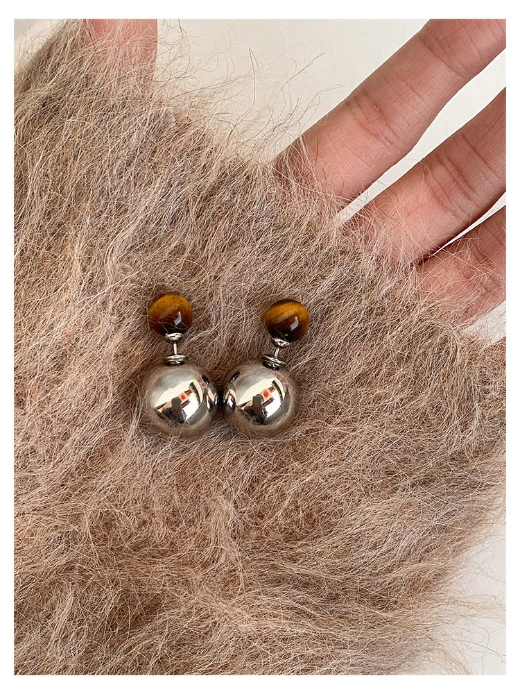 秋冬美拉德虎眼石S925银针双球质感金属球虎眼石耳钉通勤百搭耳环
