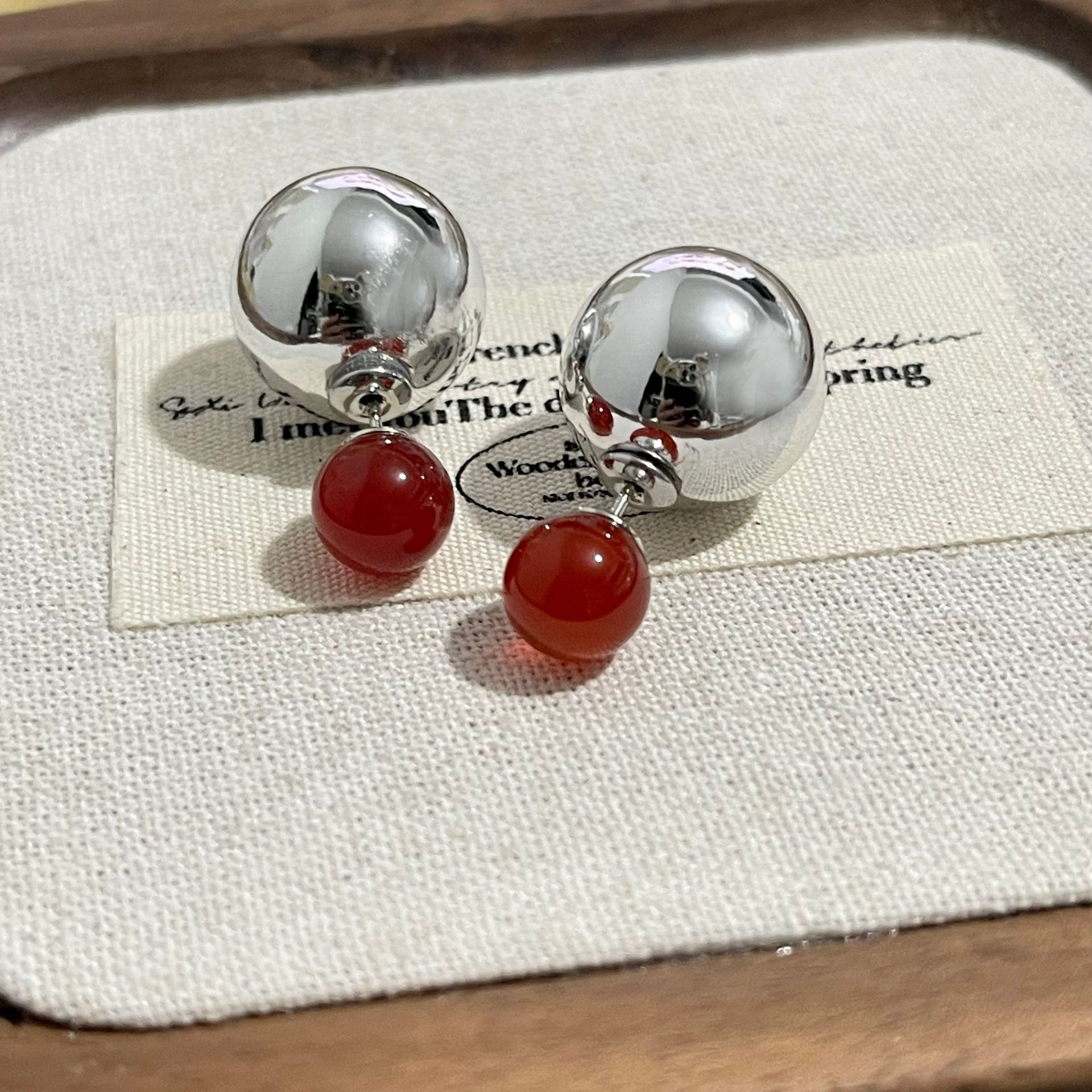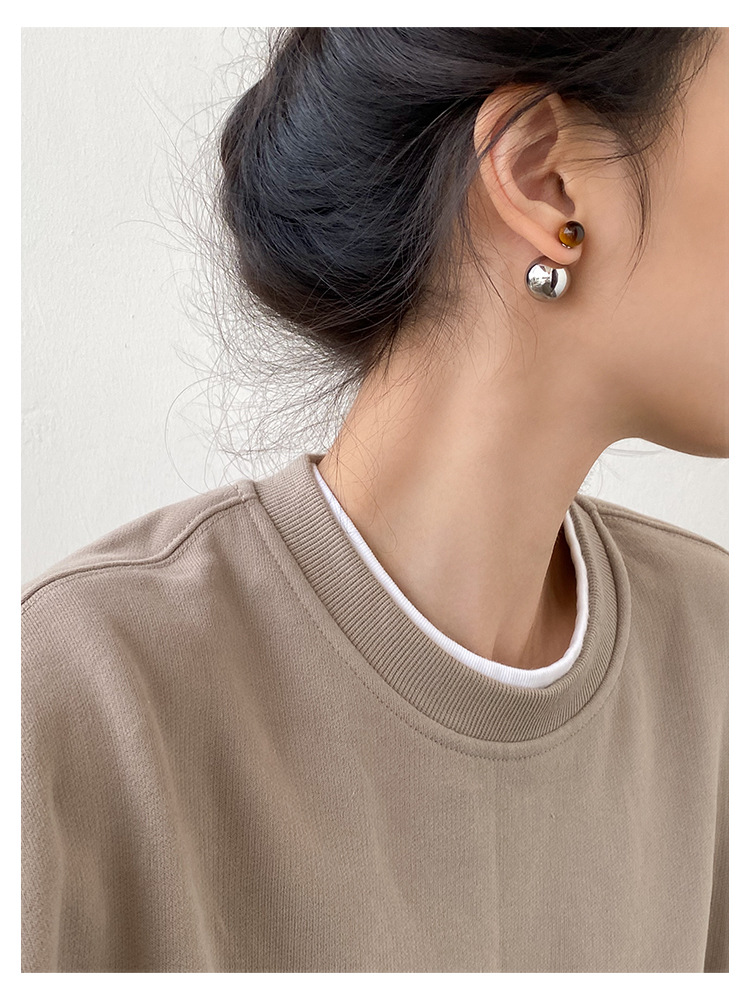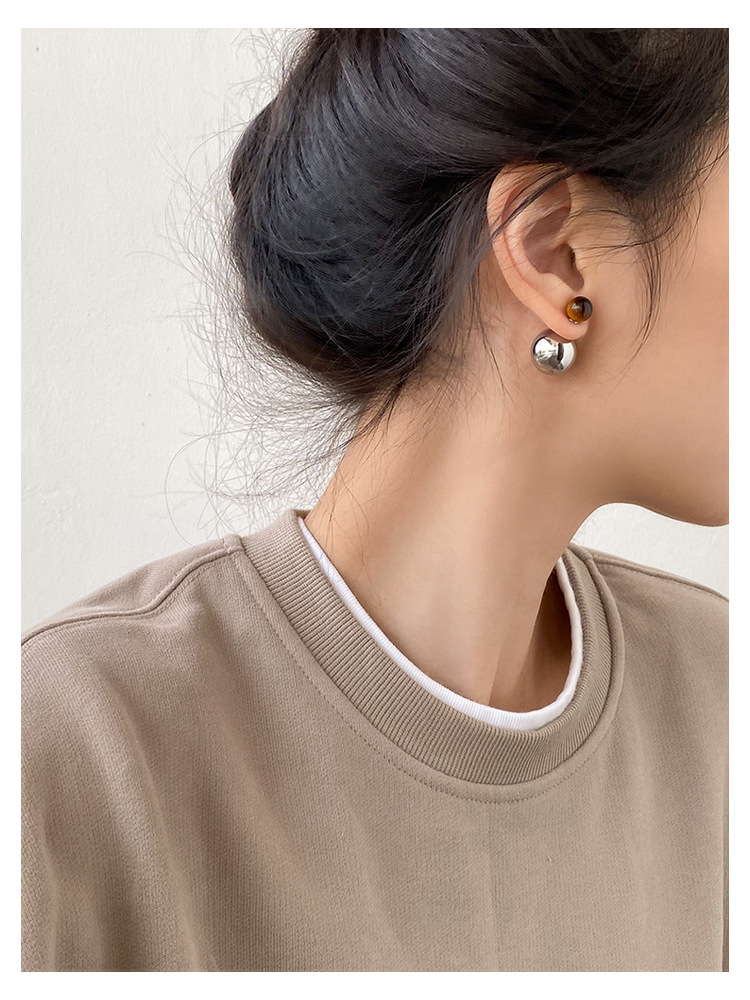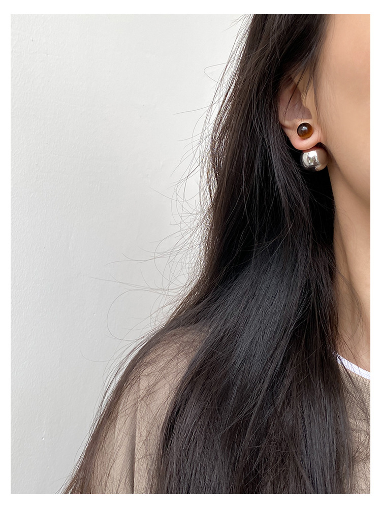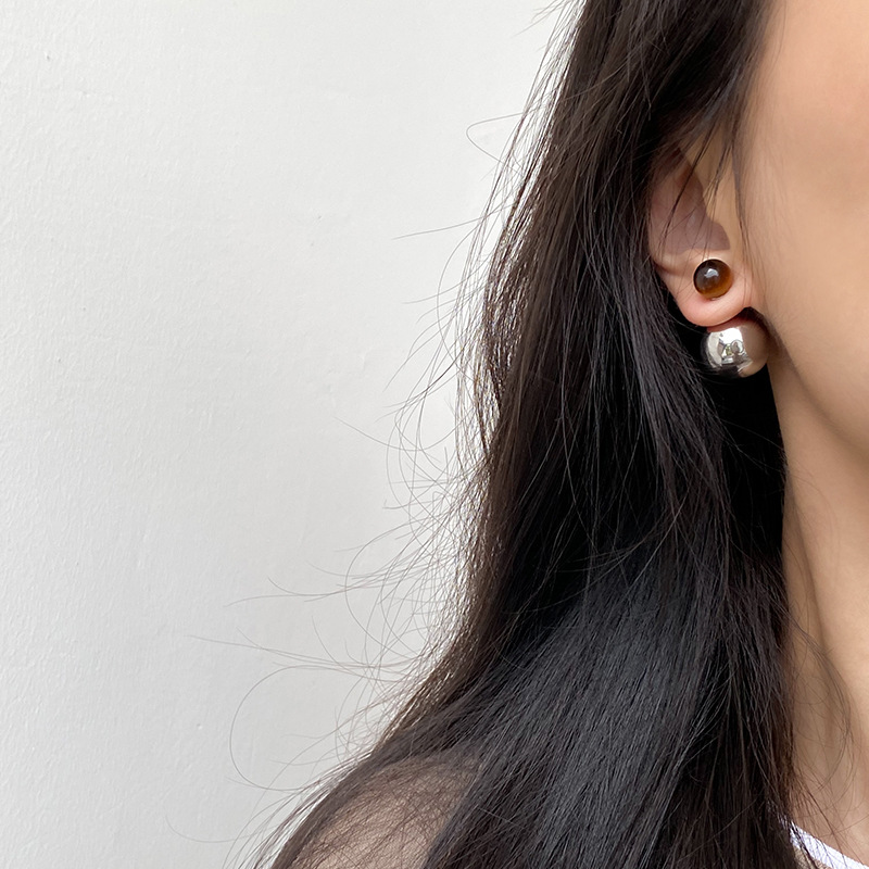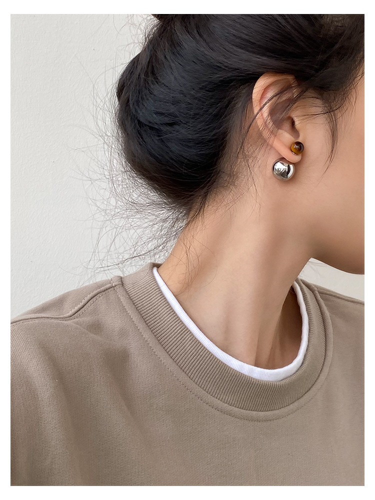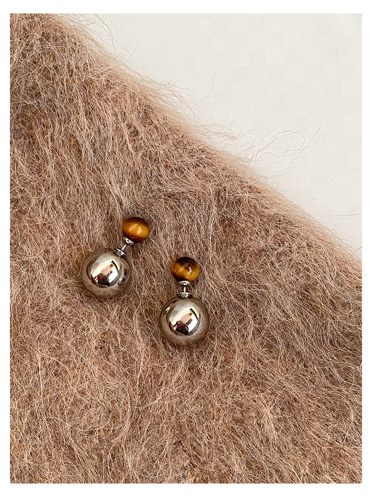 秋冬美拉德虎眼石S925银针双球质感金属球虎眼石耳钉通勤百搭耳环