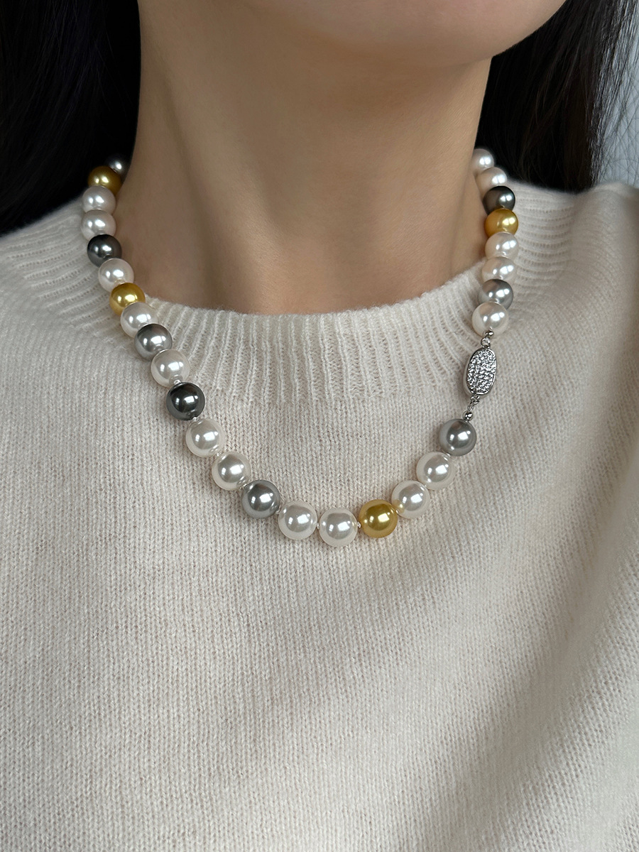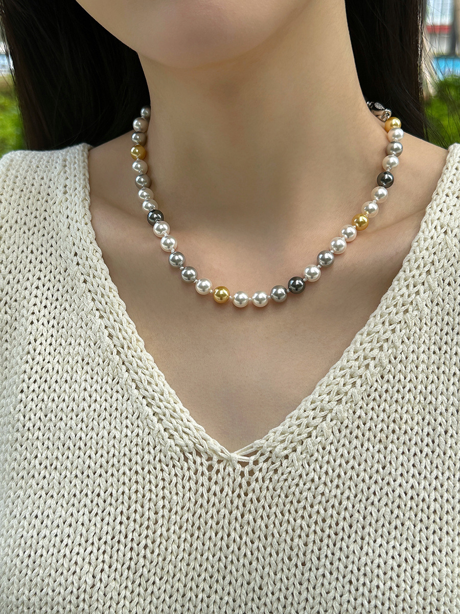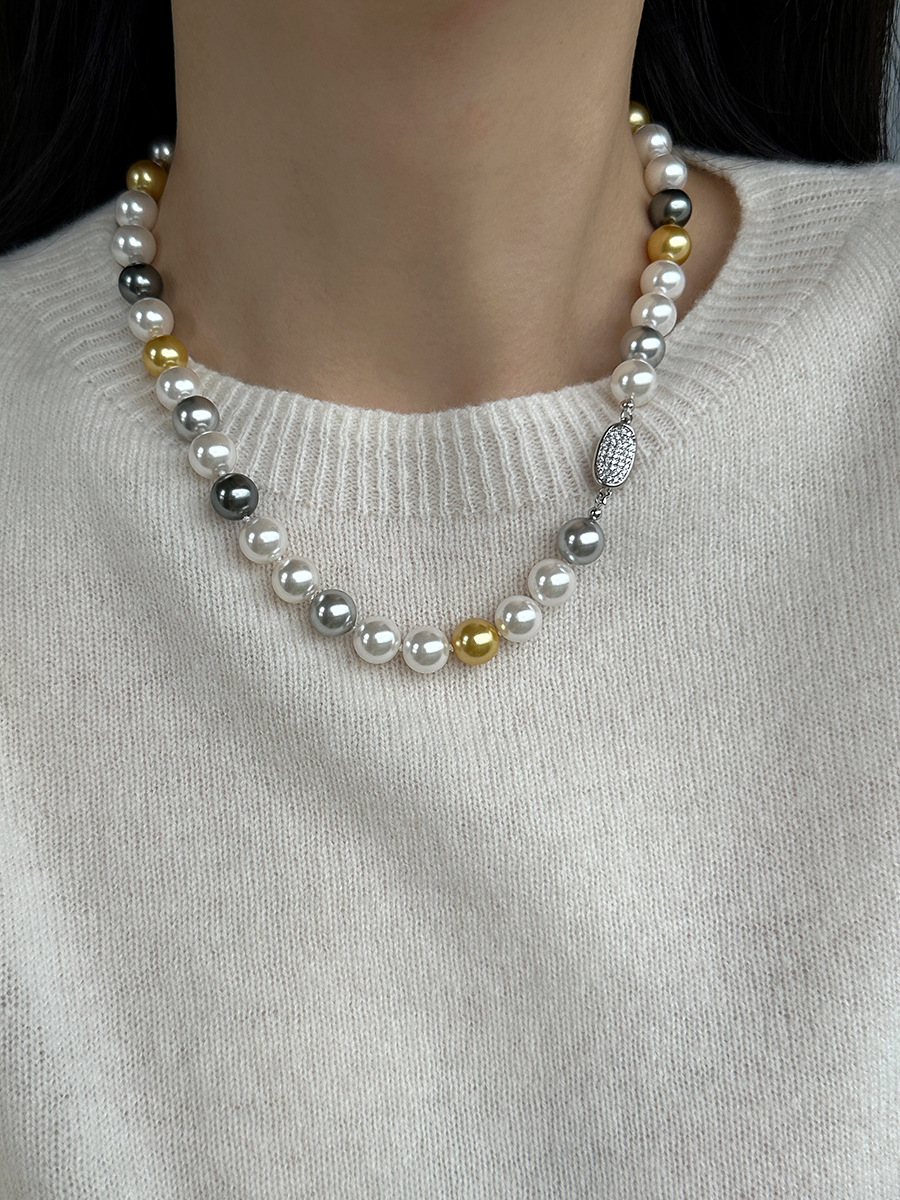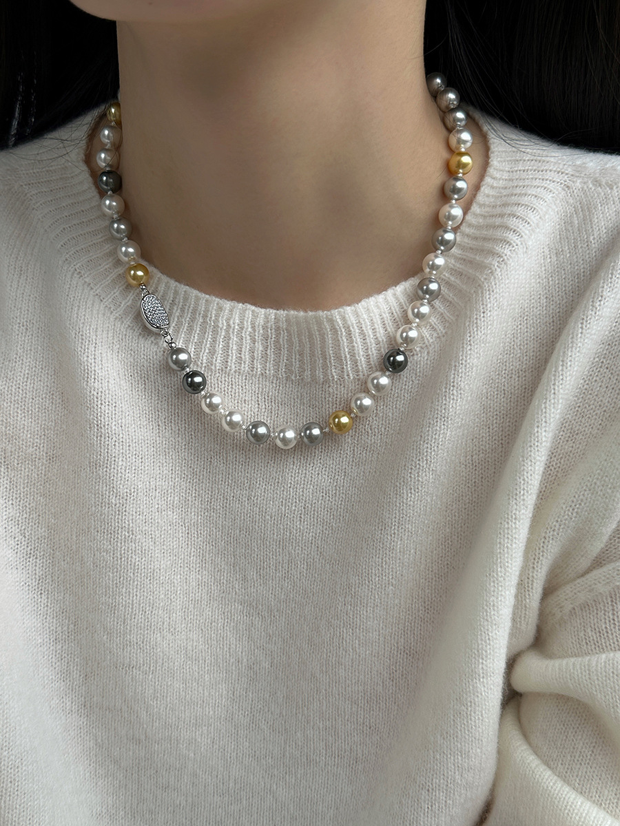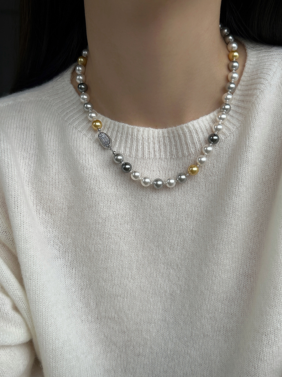 微镶元宝扣糖果色混彩施家珍珠项链女小众设计颈链时尚秋冬毛衣链