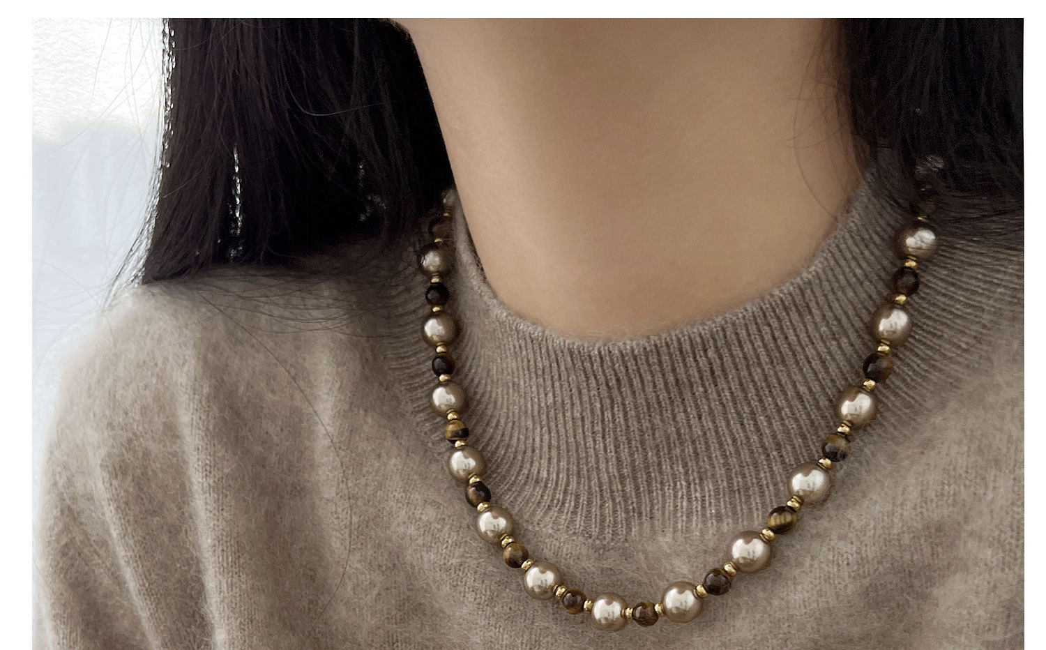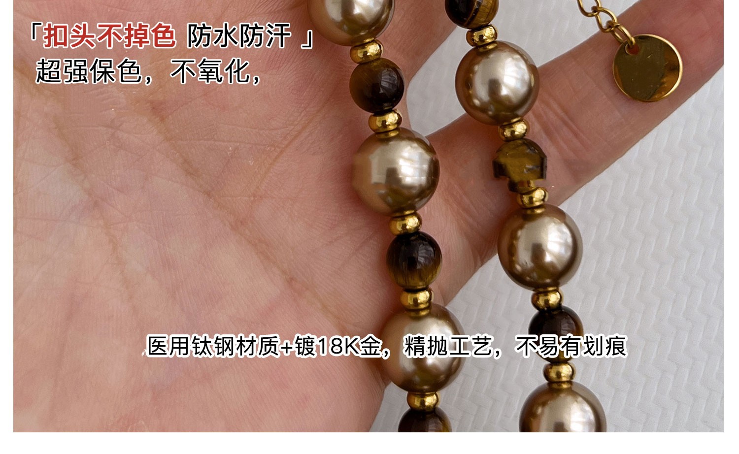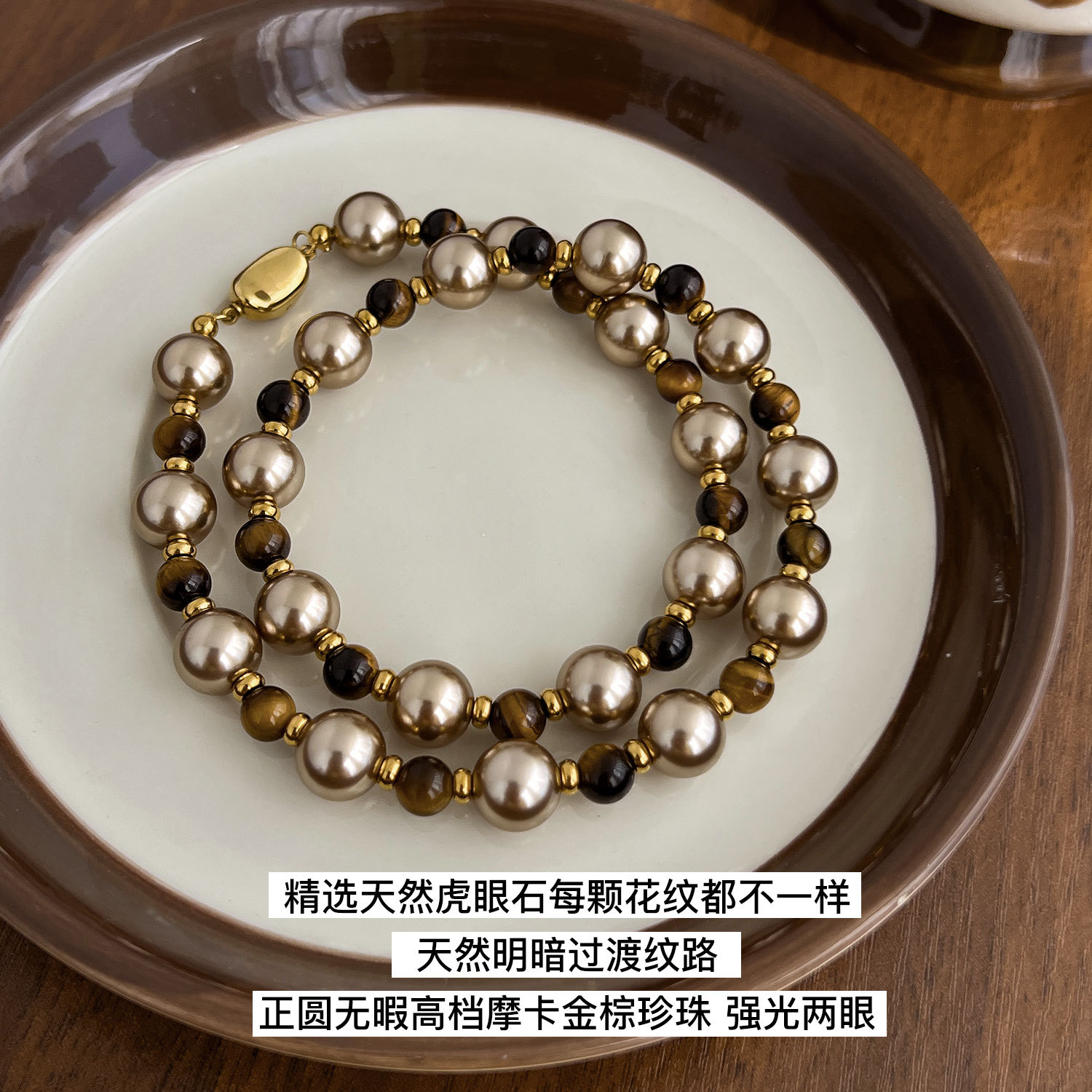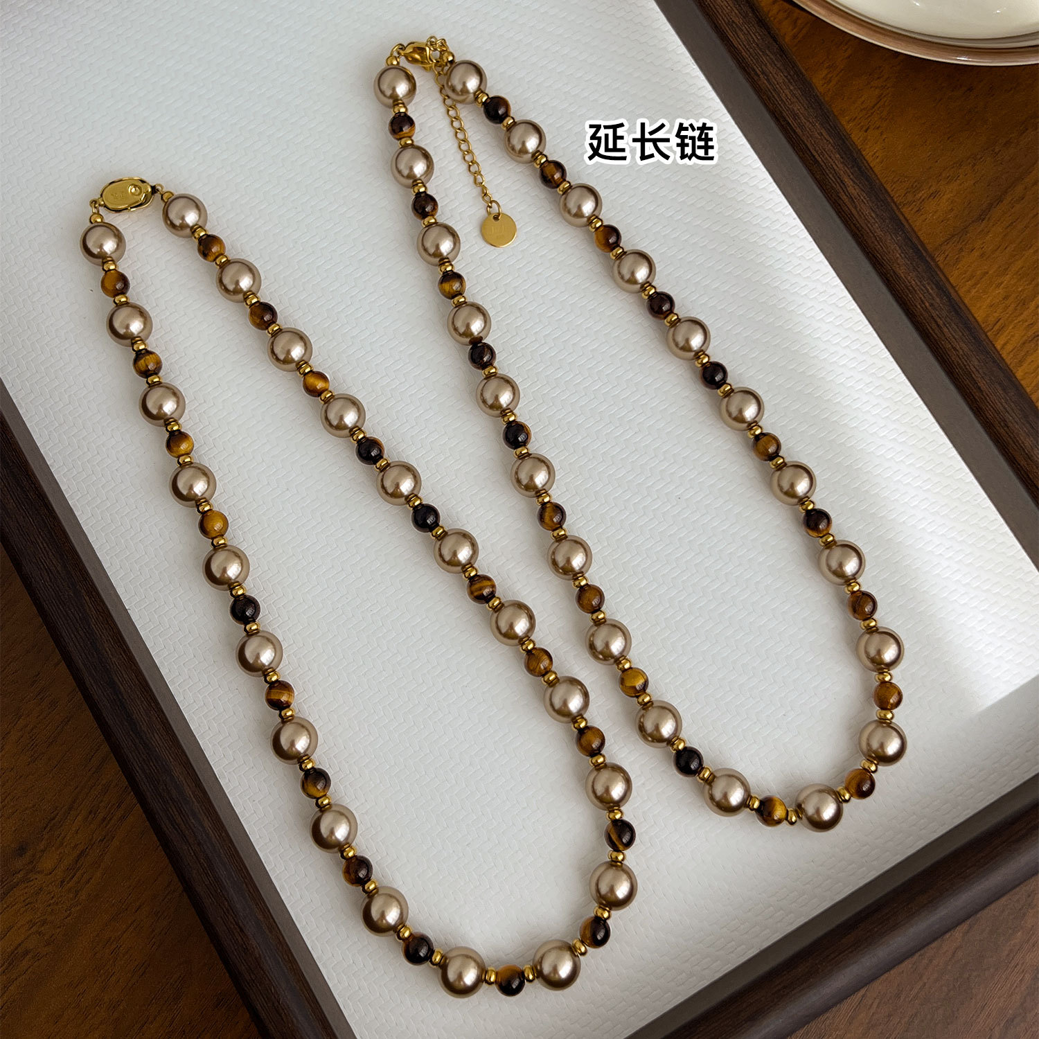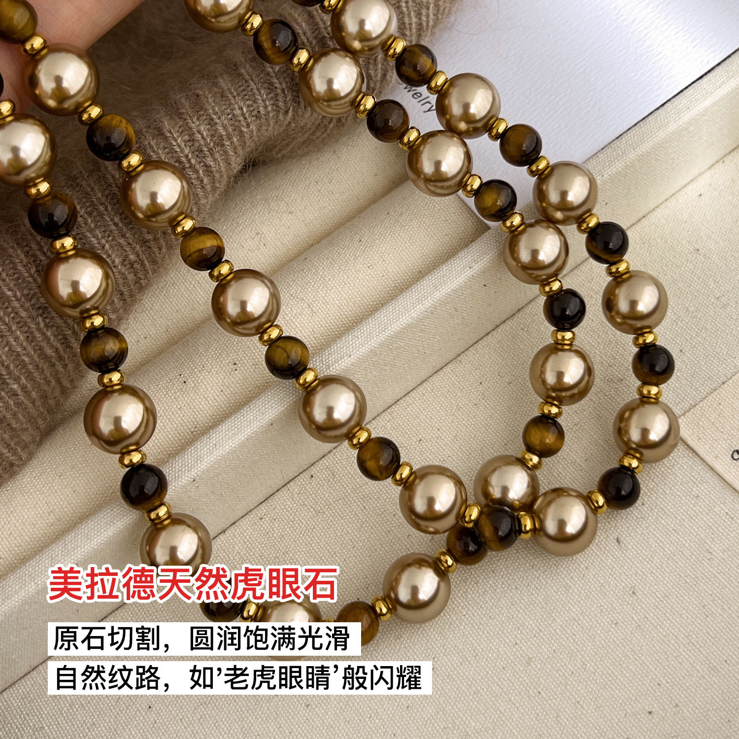 秋冬天然虎眼石项链毛衣链串珠锁骨链摩卡金棕珍珠混彩美拉德颈链