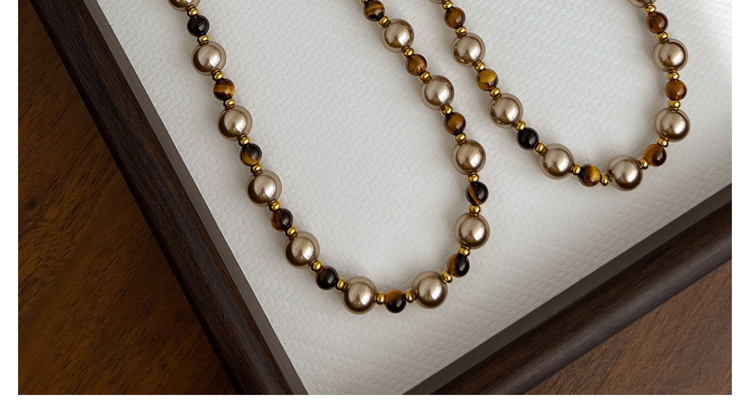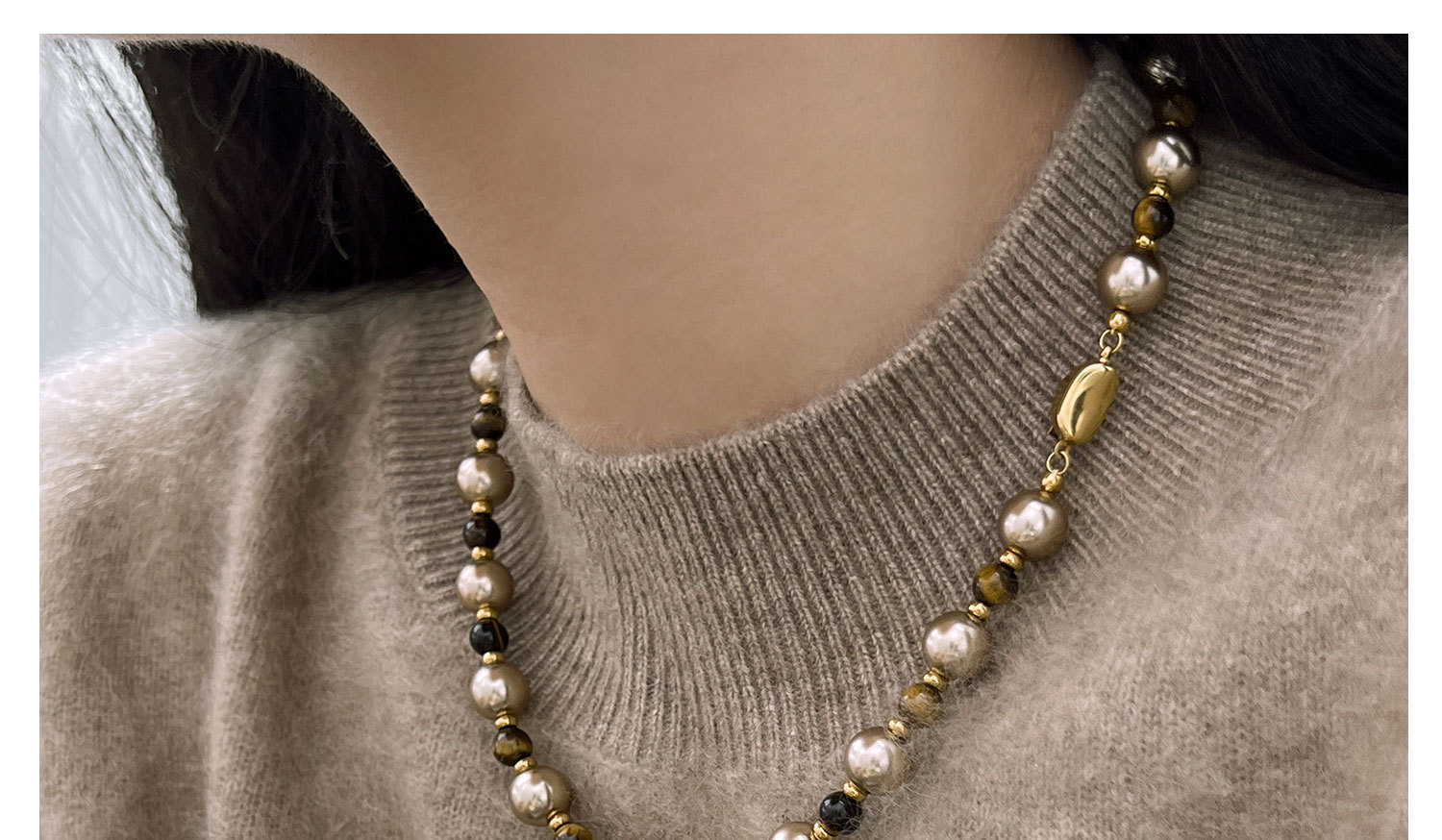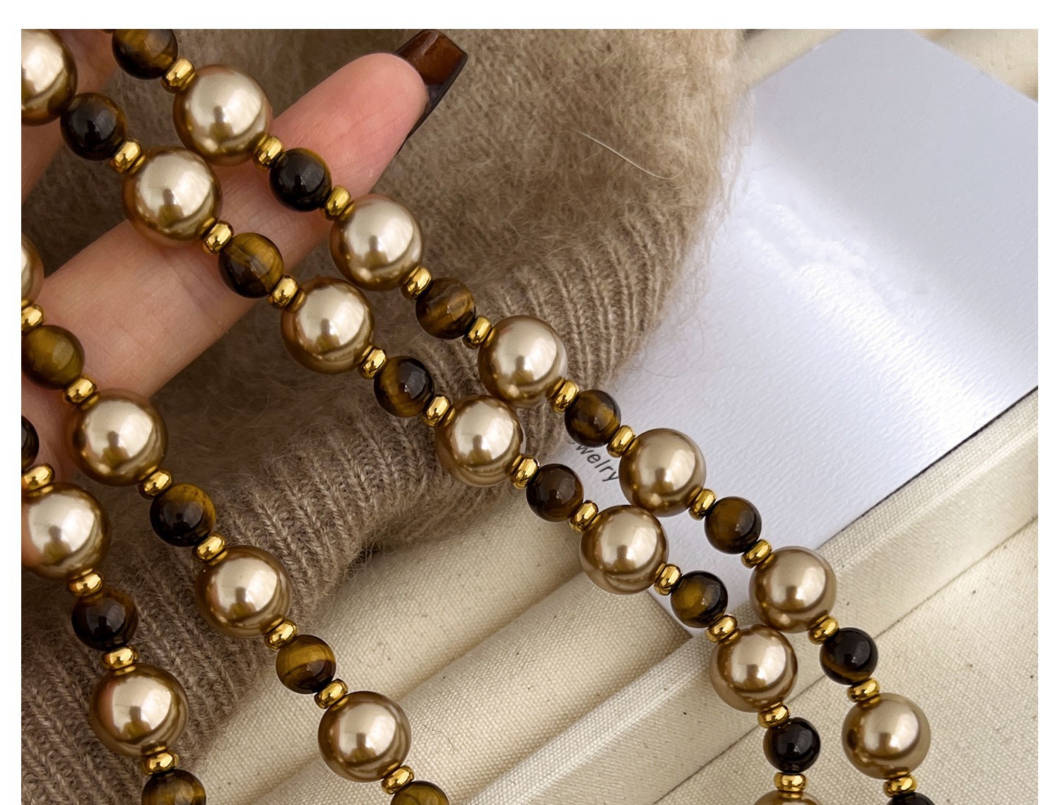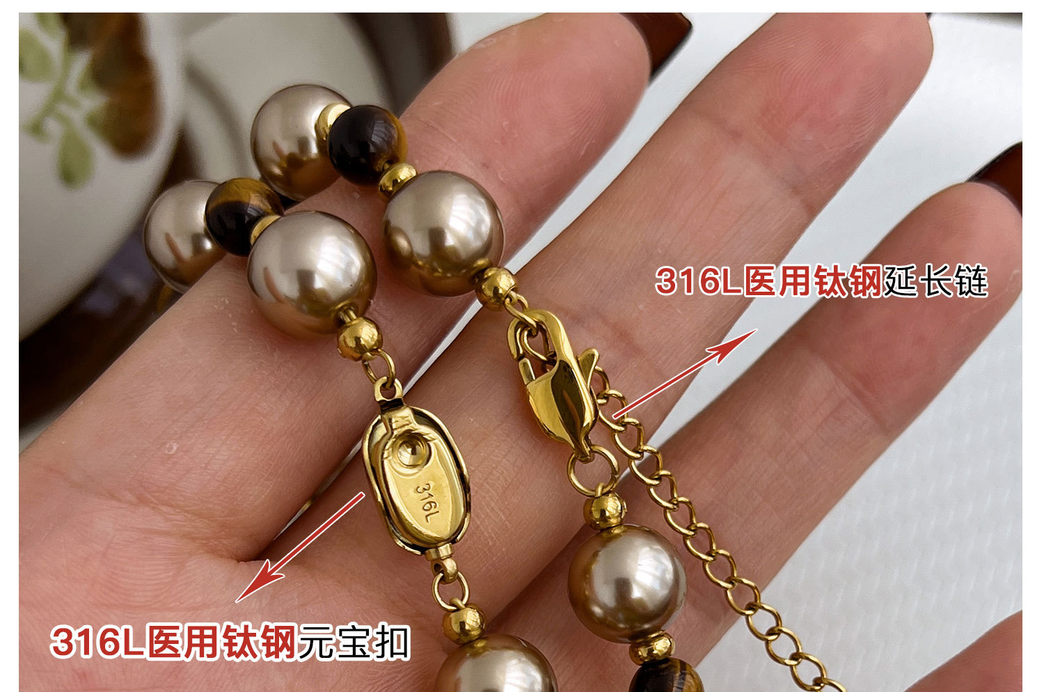 秋冬天然虎眼石项链毛衣链串珠锁骨链摩卡金棕珍珠混彩美拉德颈链