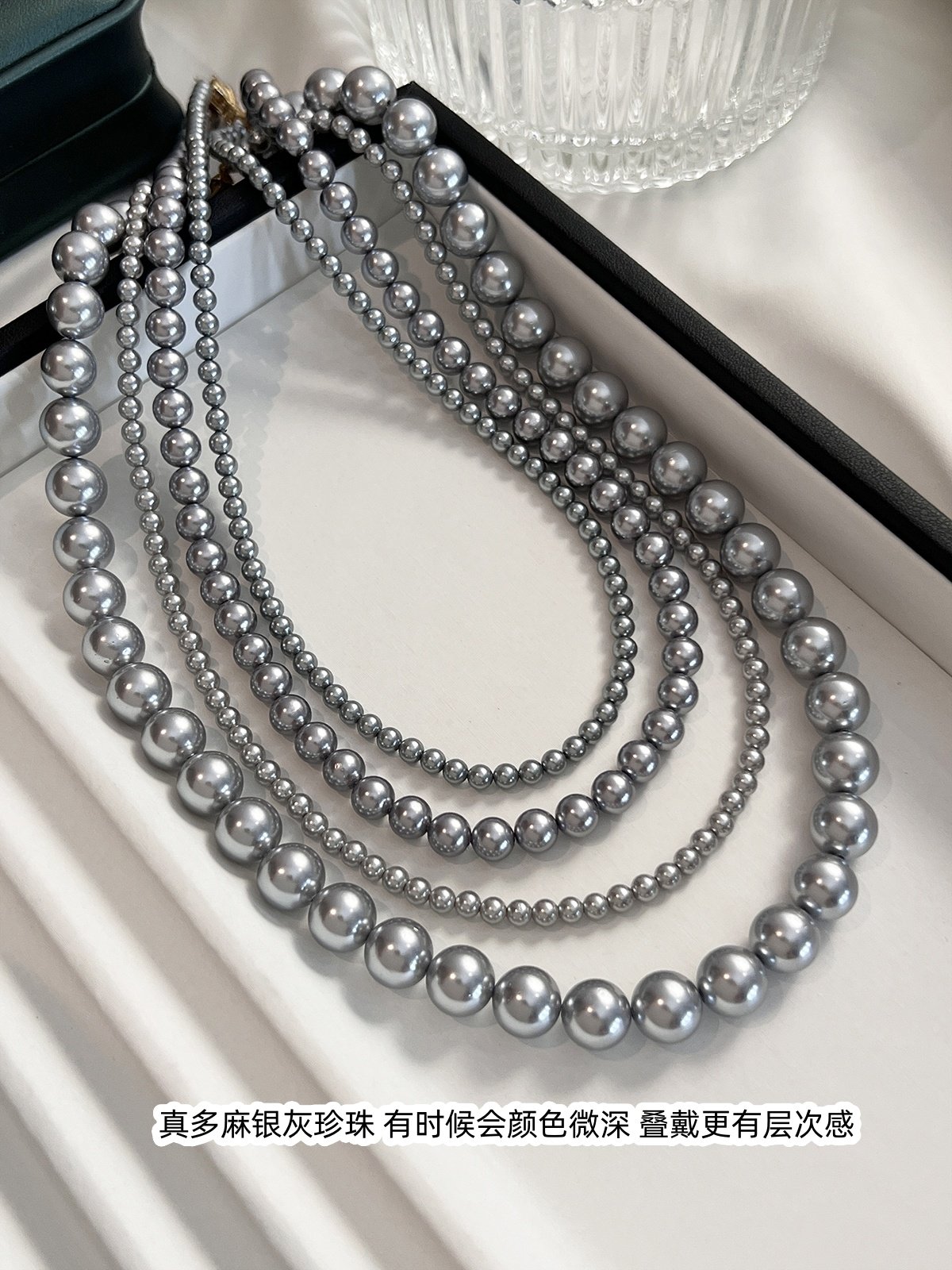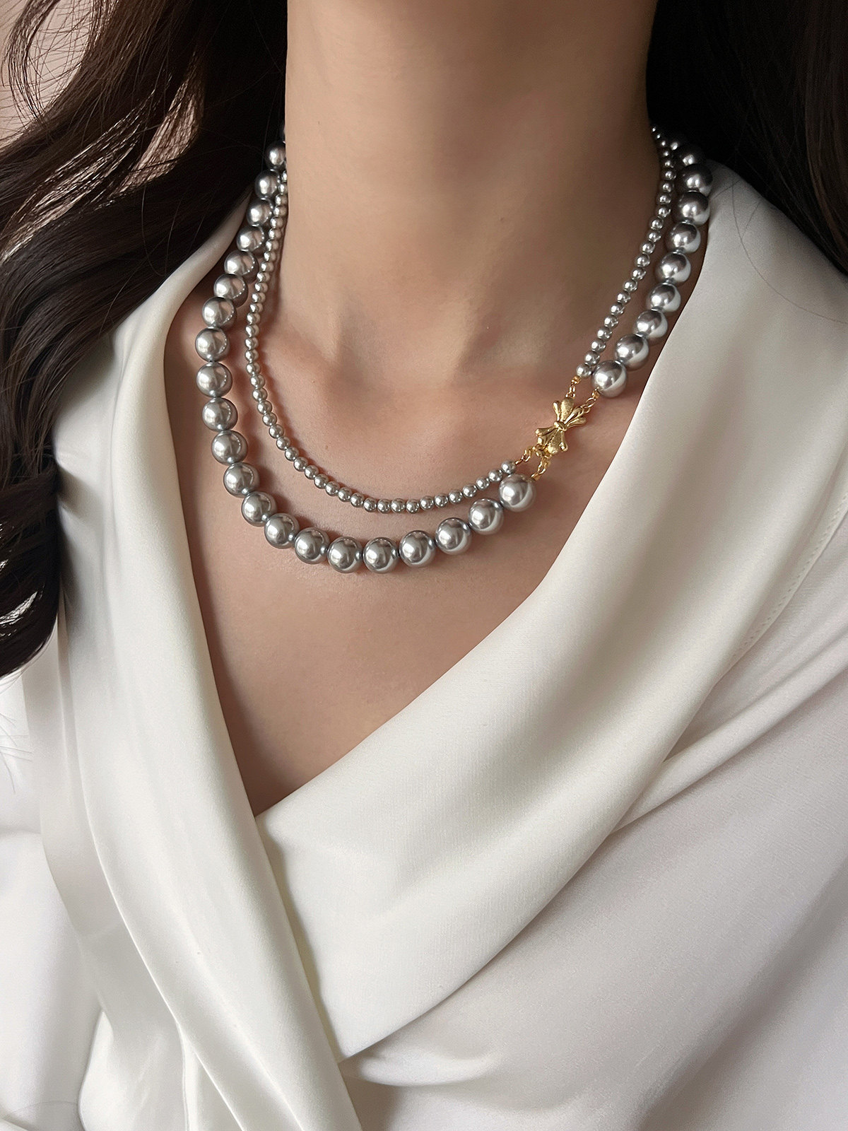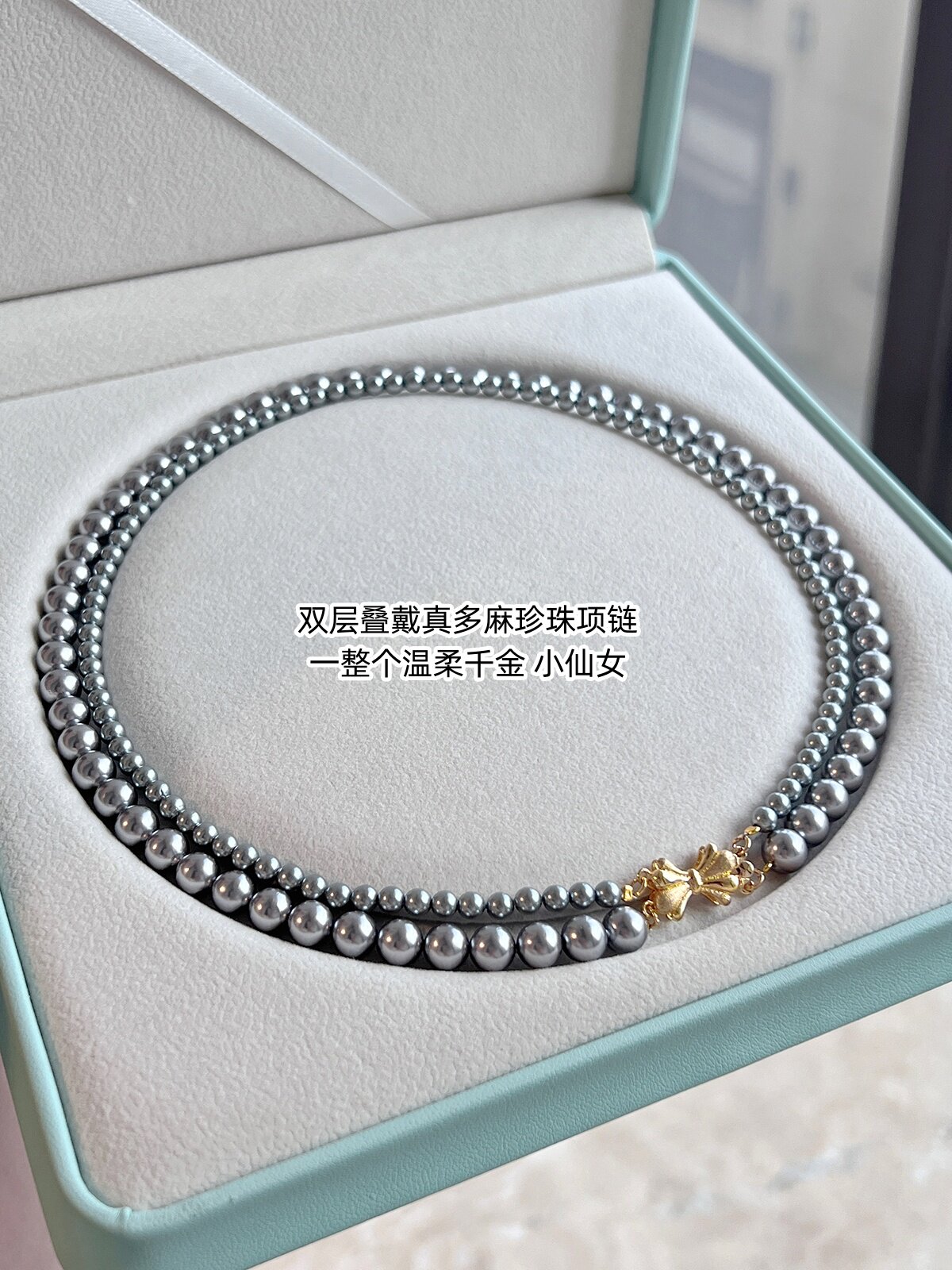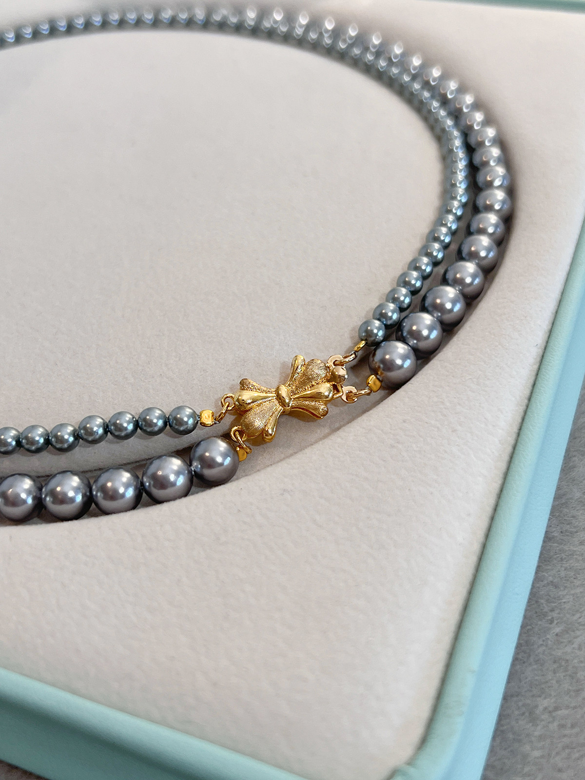 蝴蝶结真多麻珍珠项链叠戴双层毛衣链秋冬2025新款爆款灰色锁骨链