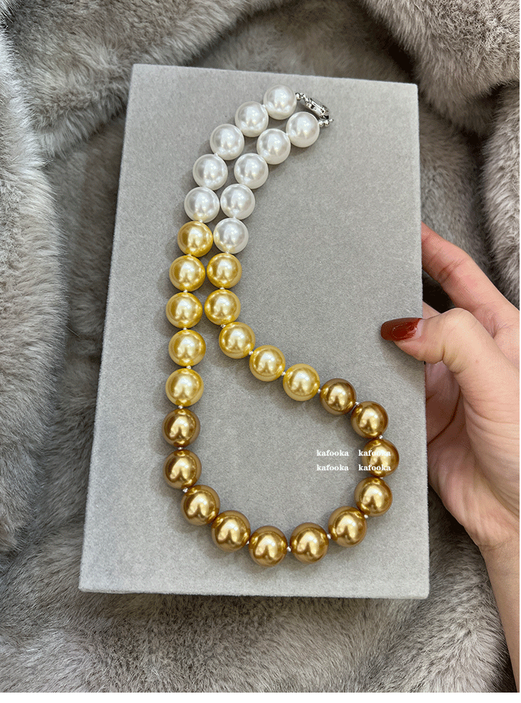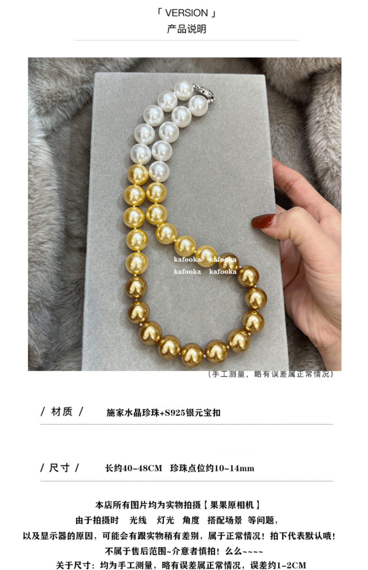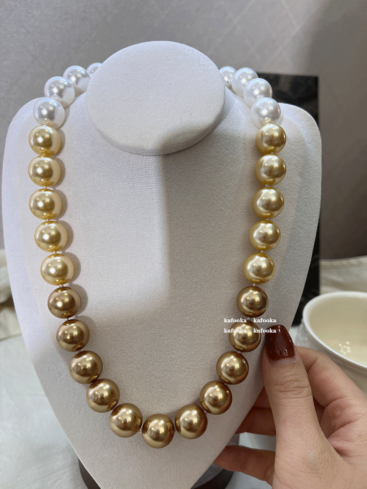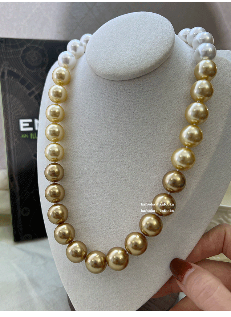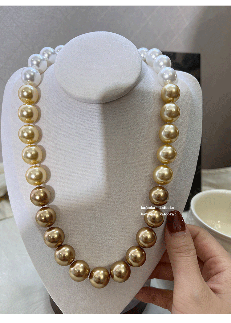 奢华霸气14mm大点位茶金色澳白渐变色仿海水珍珠项链女法式打结款