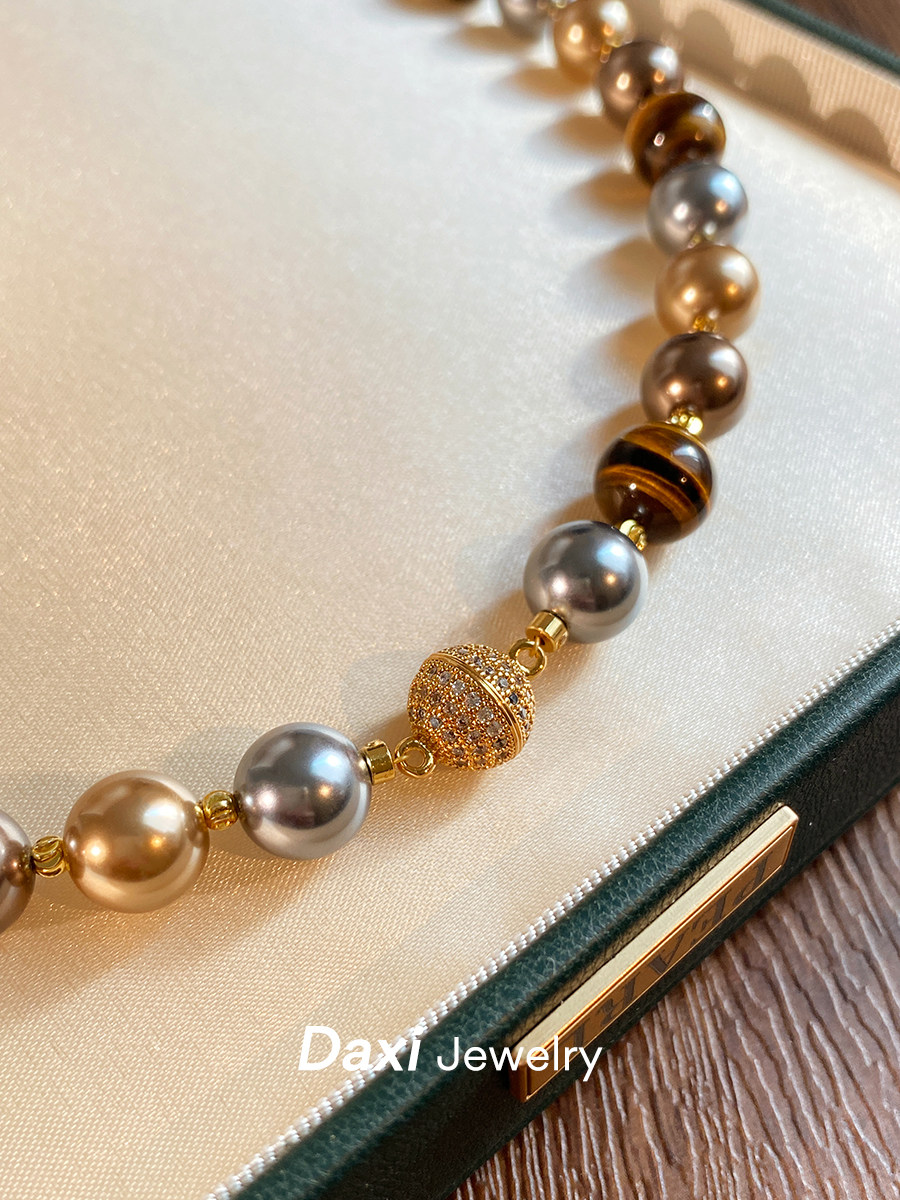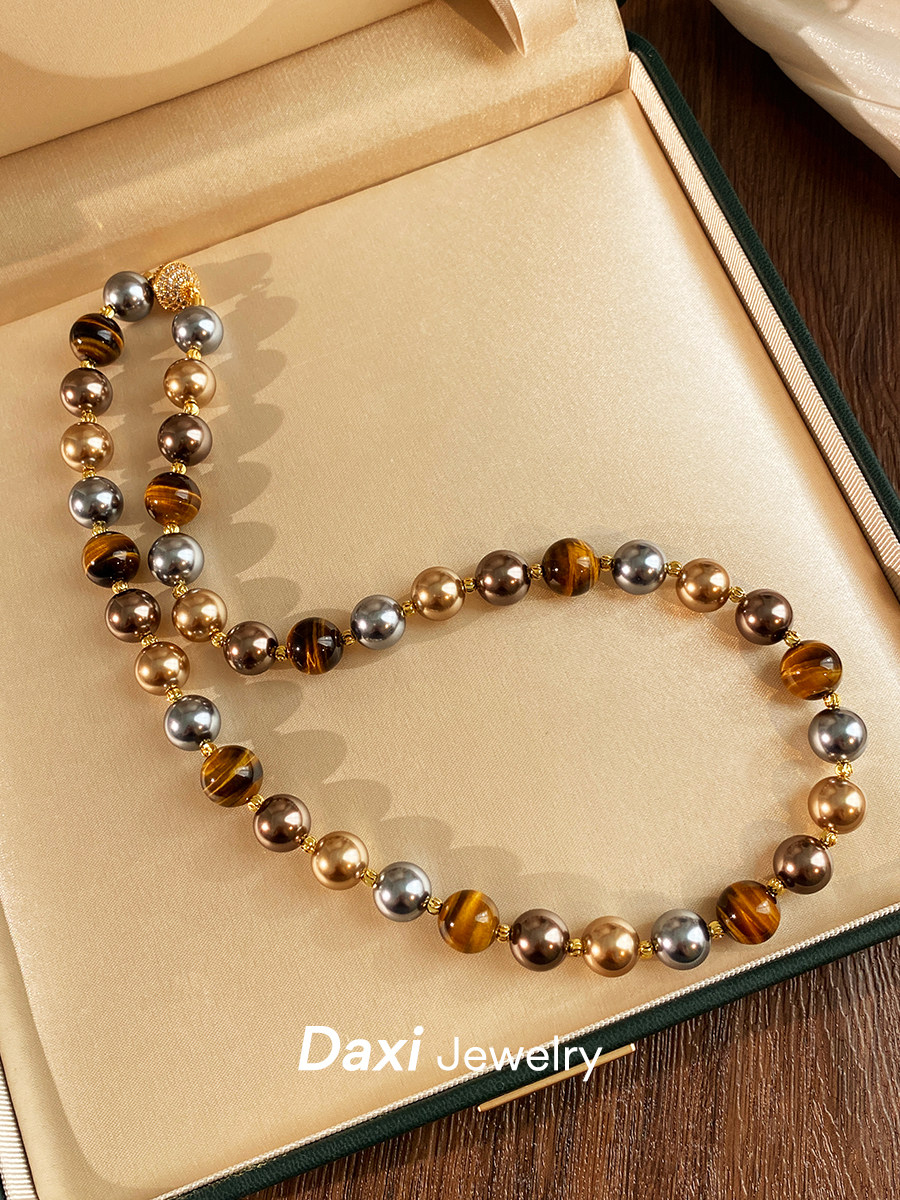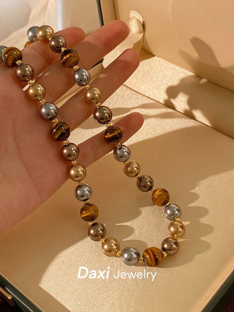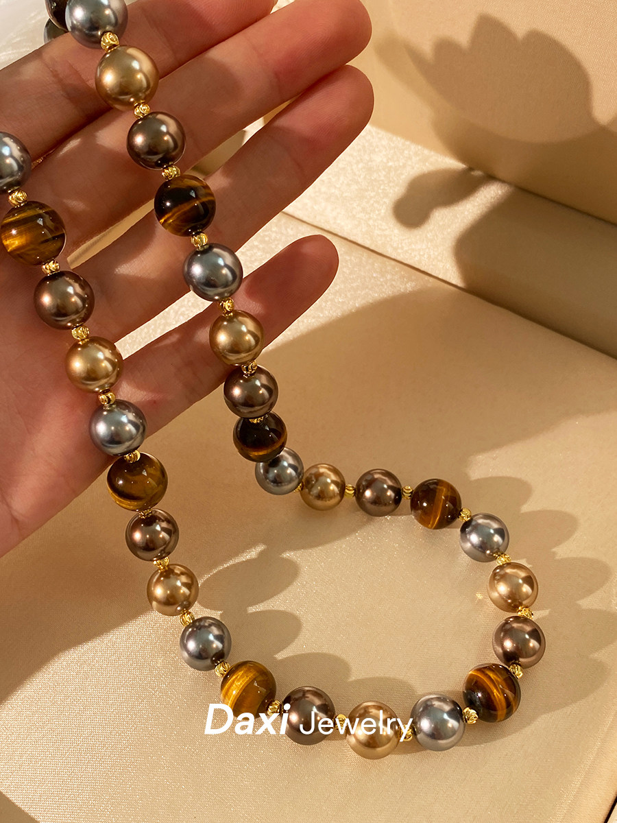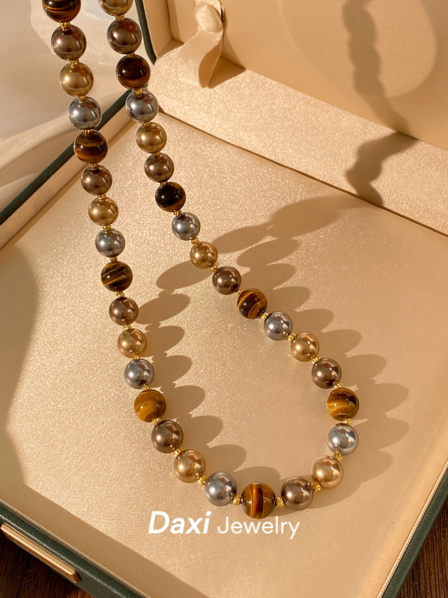 天然虎眼石珍珠项链女秋冬新款美拉德轻奢小众设计感金棕毛衣颈链