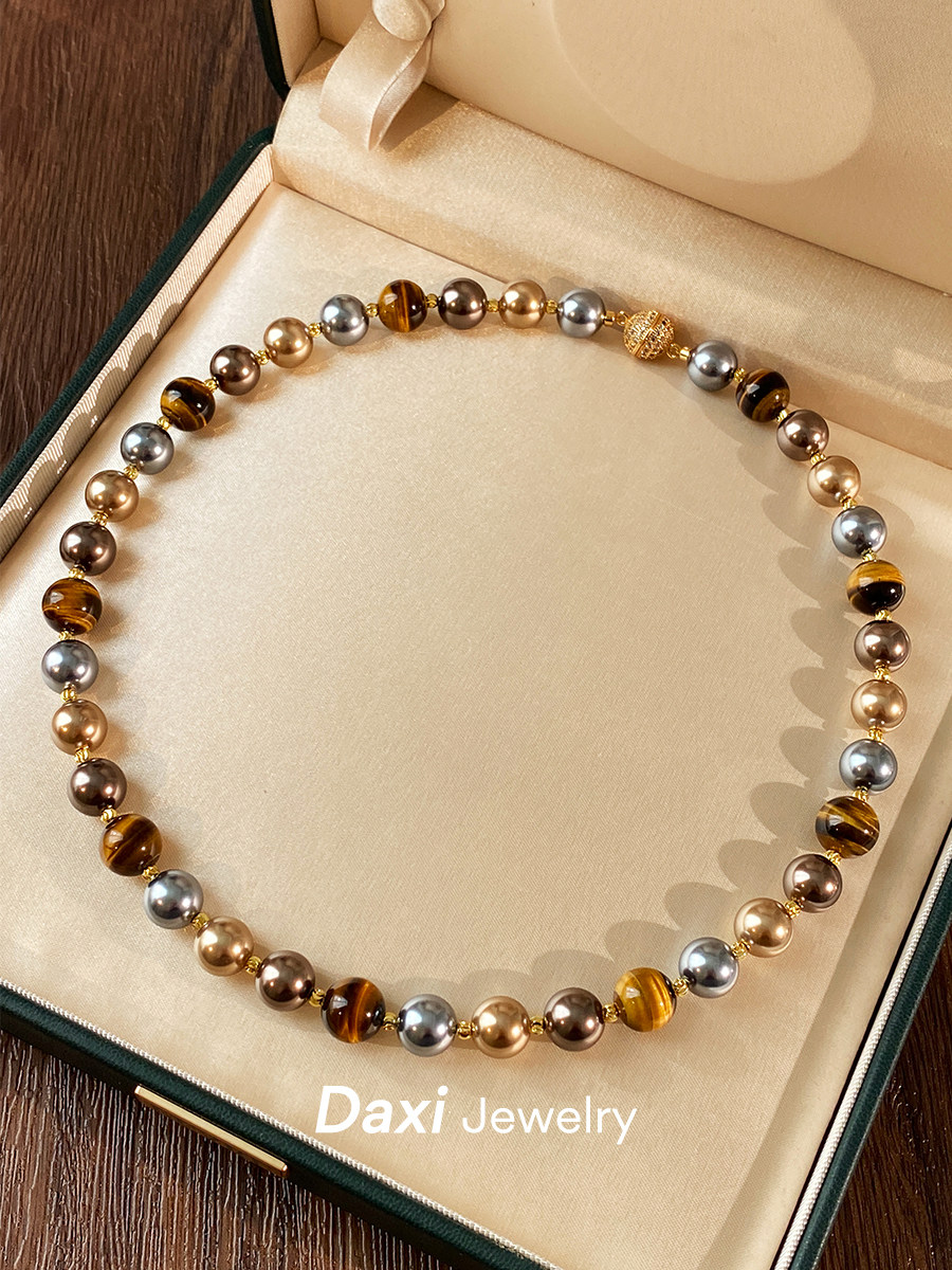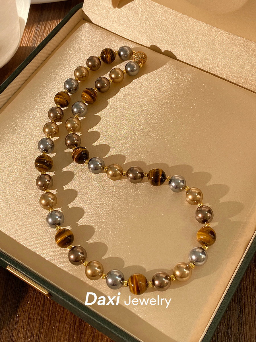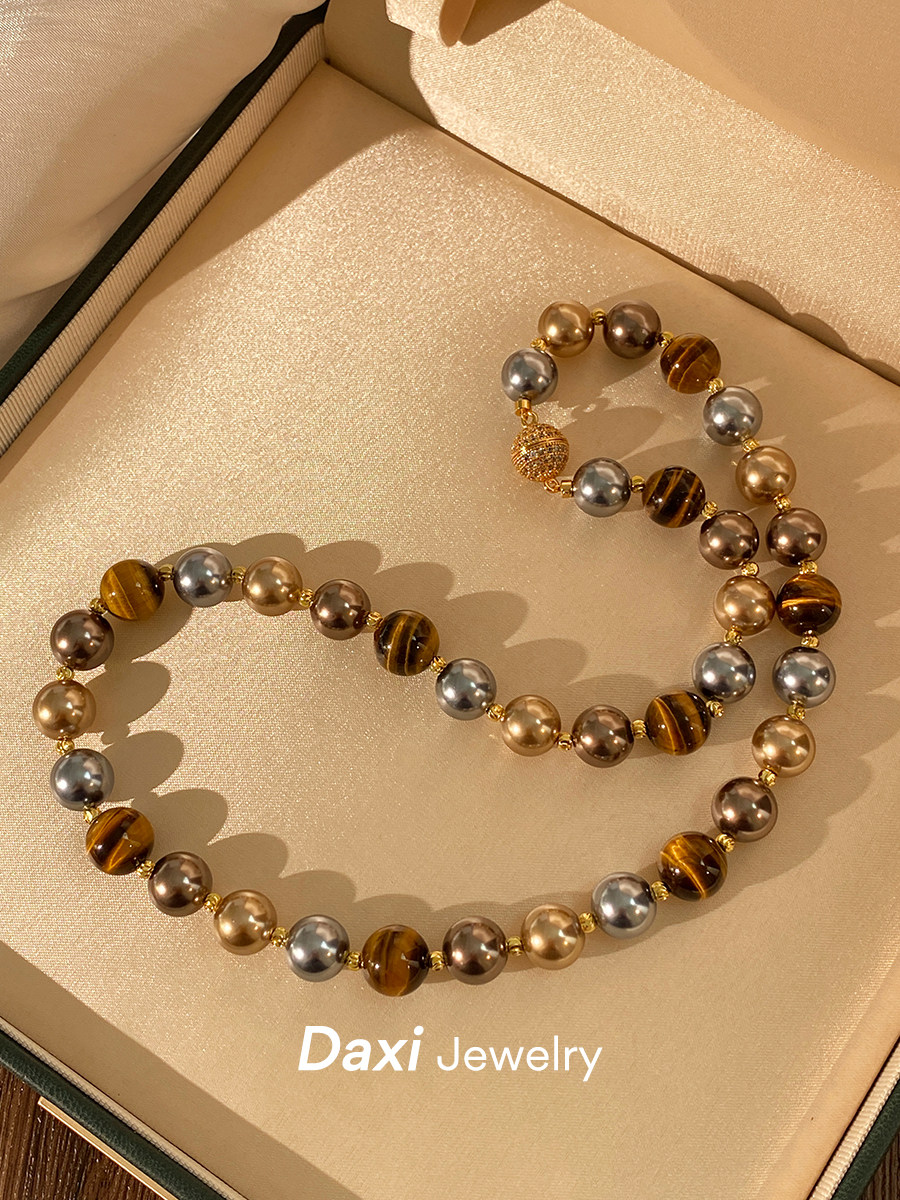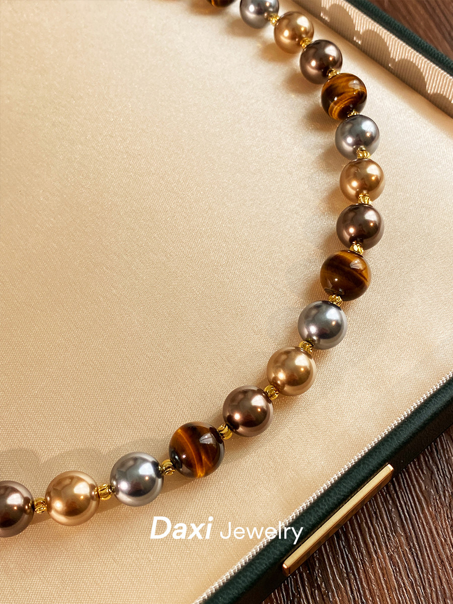 天然虎眼石珍珠项链女秋冬新款美拉德轻奢小众设计感金棕毛衣颈链