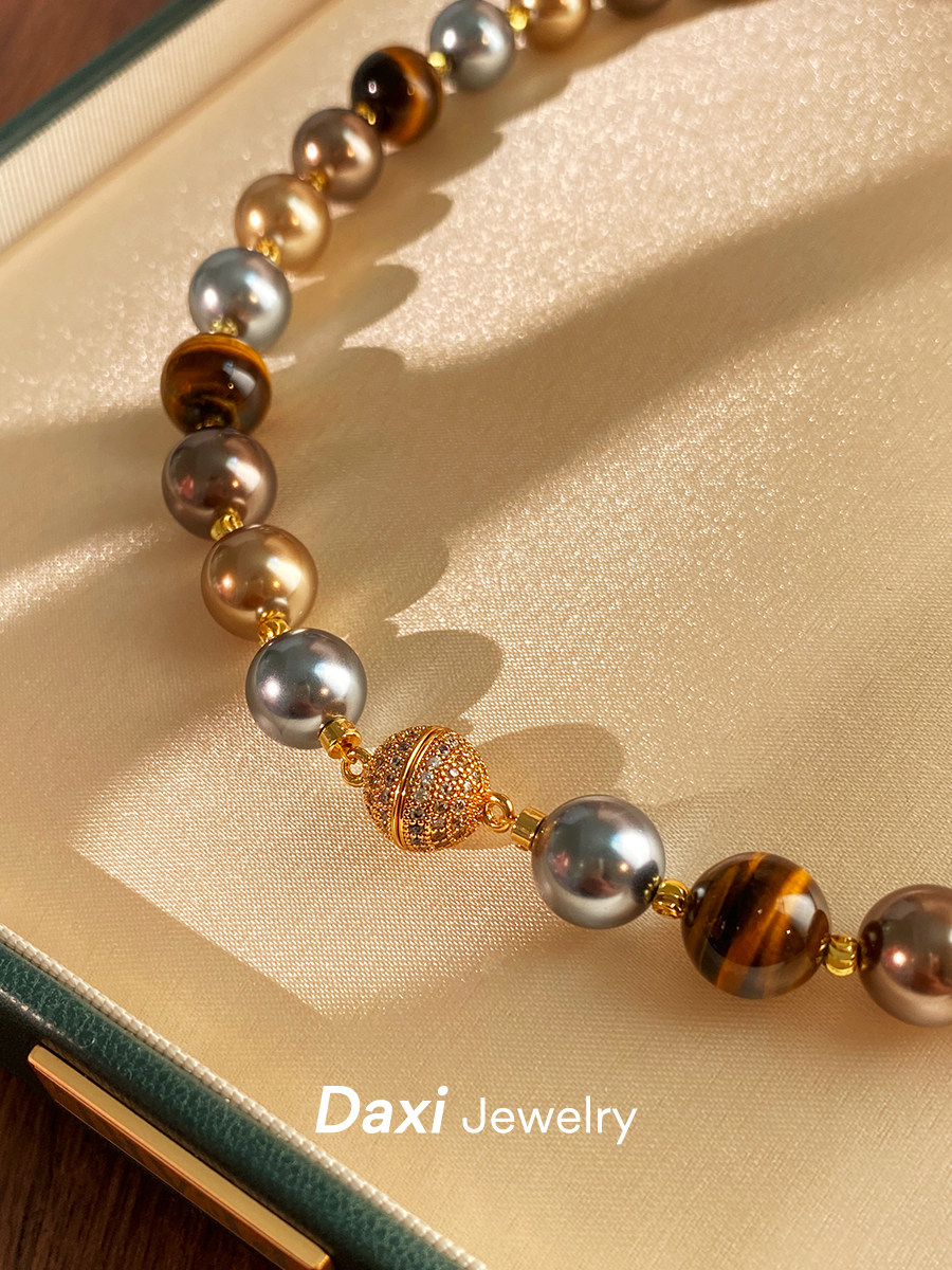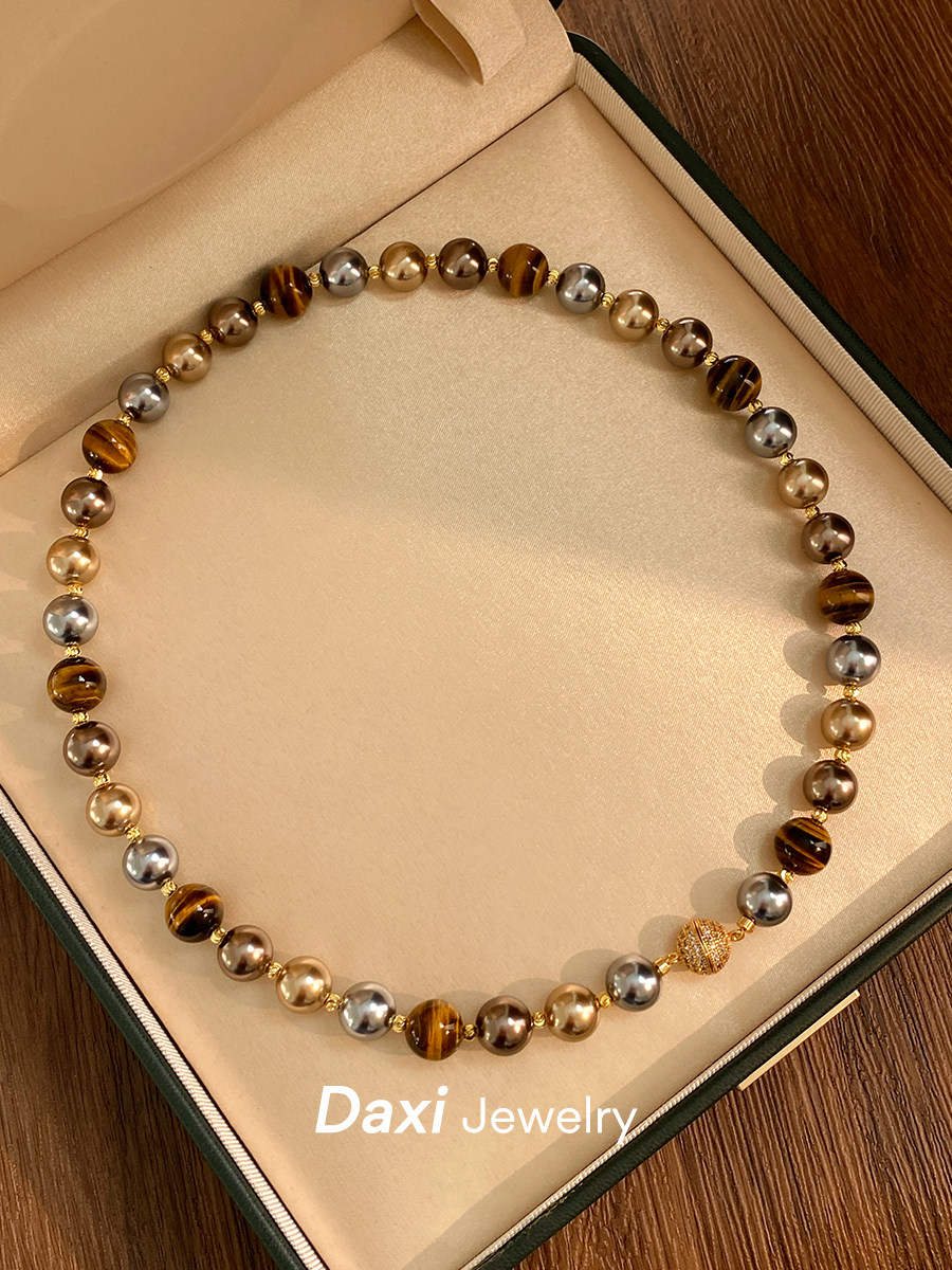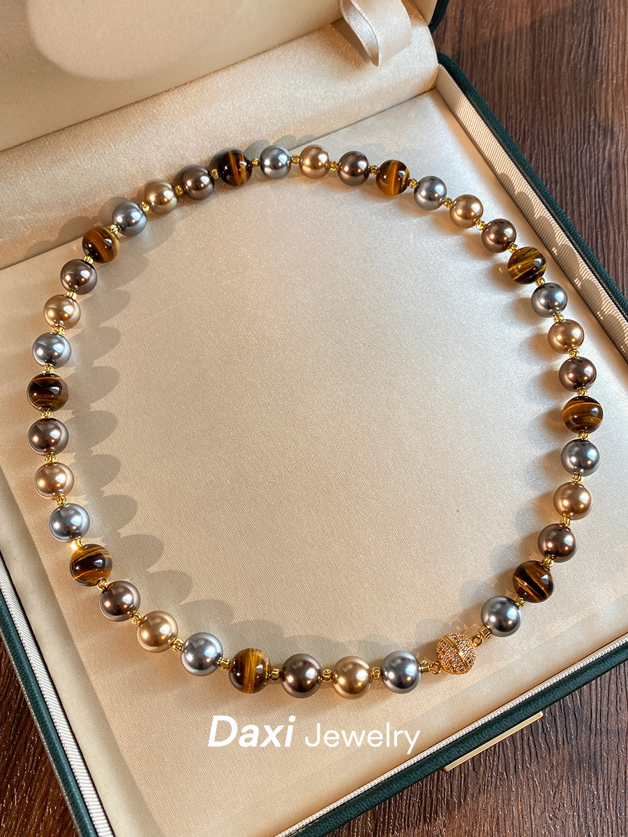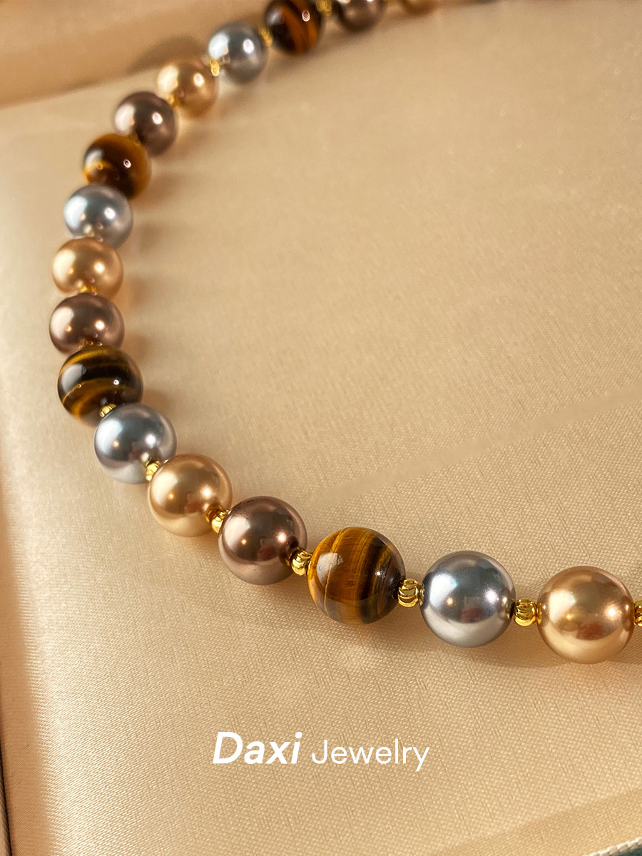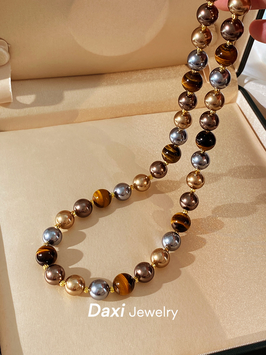 天然虎眼石珍珠项链女秋冬新款美拉德轻奢小众设计感金棕毛衣颈链