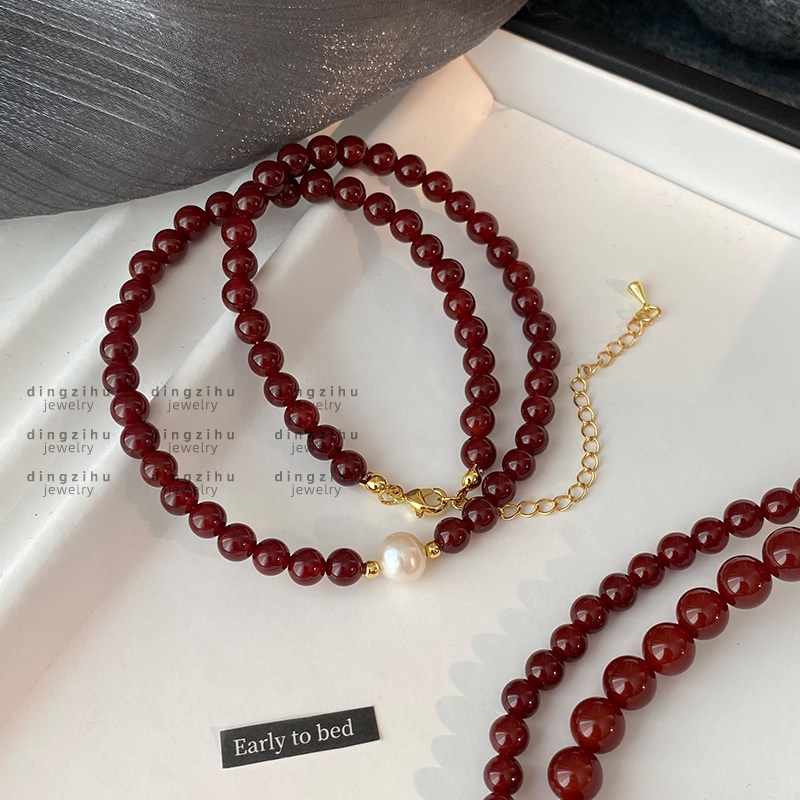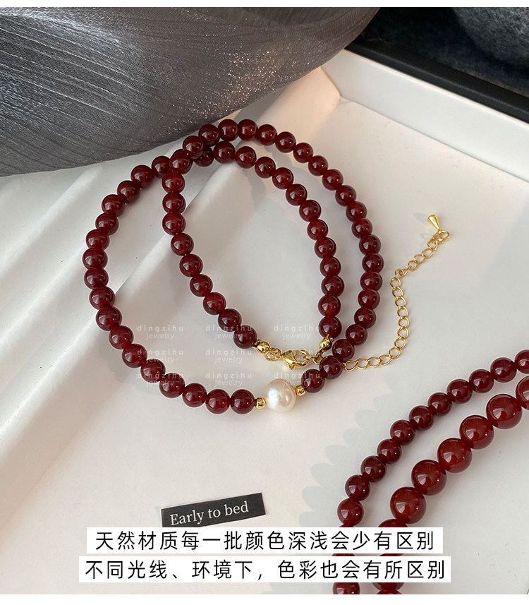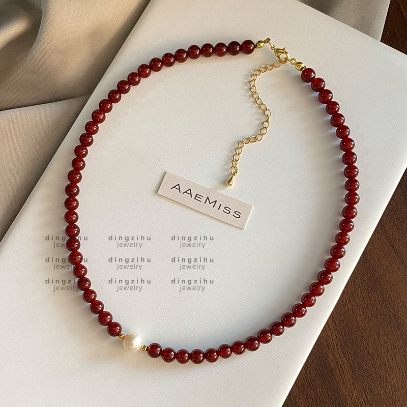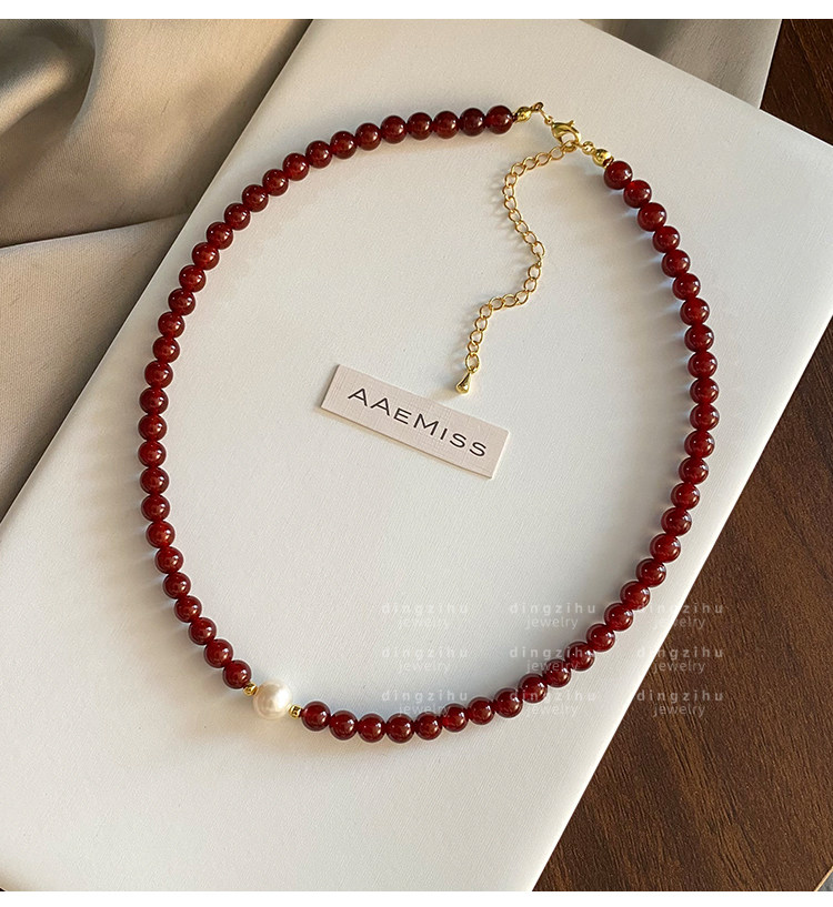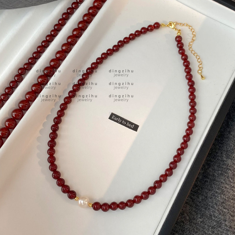 红色串珠珍珠项链女士秋季新中式复古设计高级感锁骨链颈链毛衣链