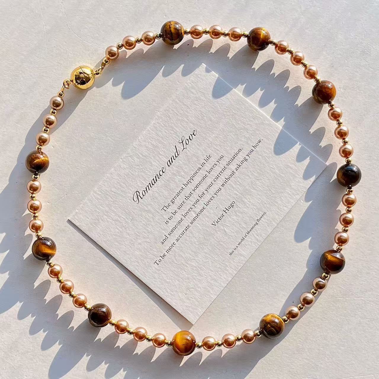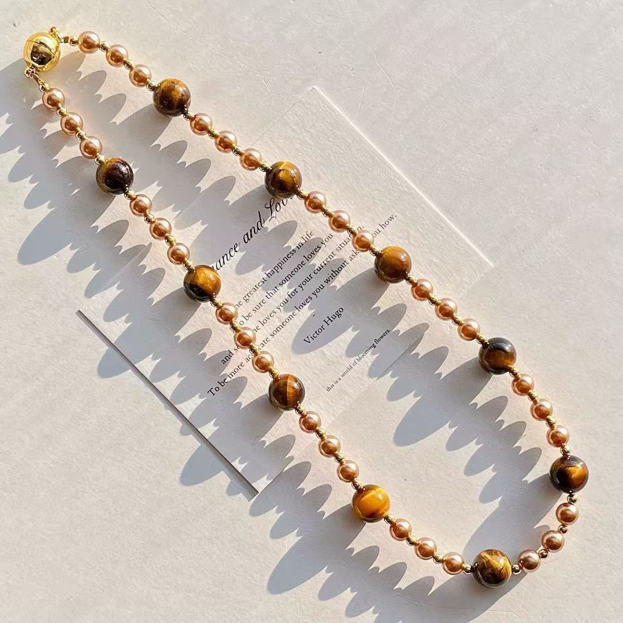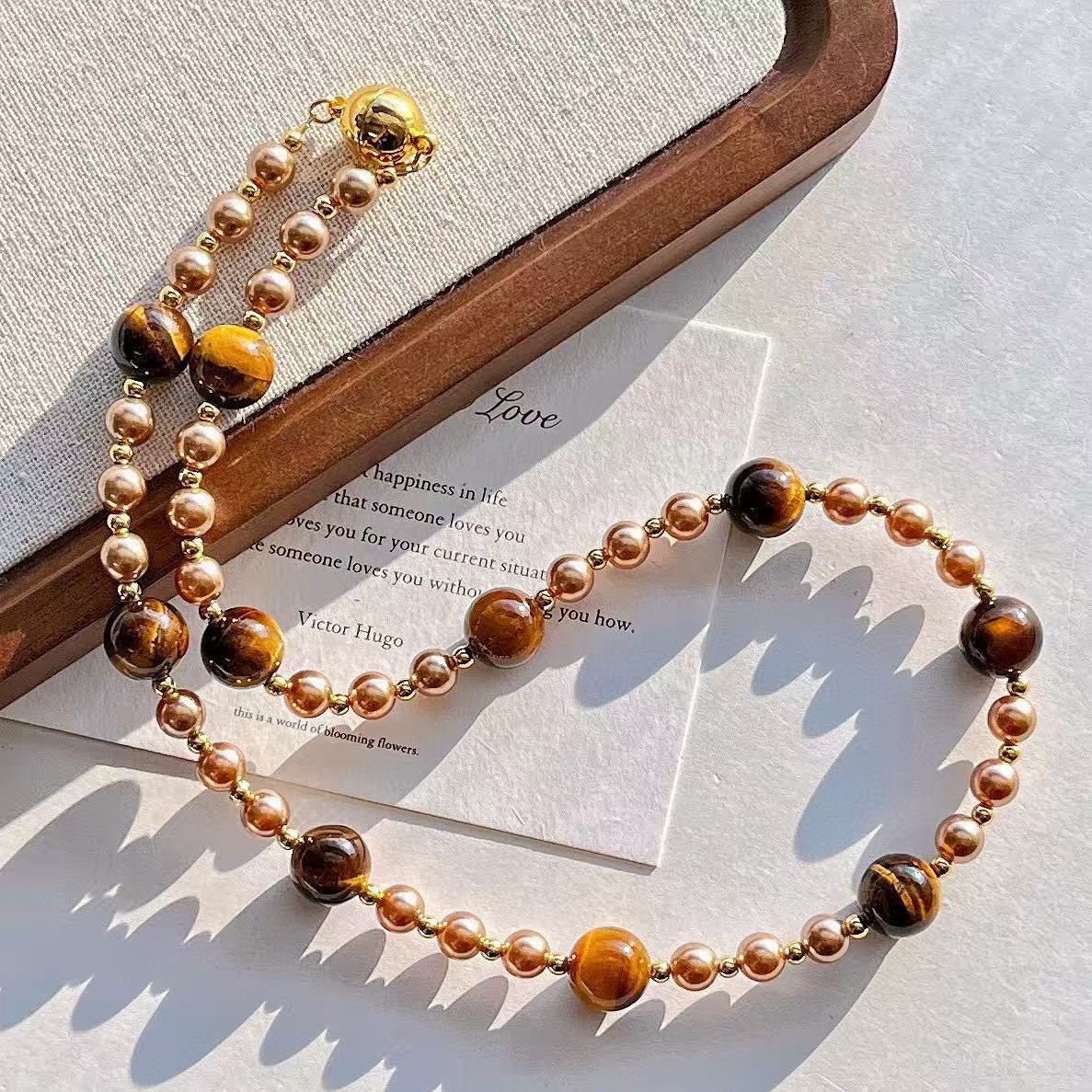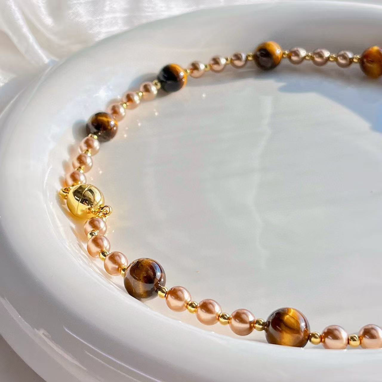 秋冬美拉德风天然精品虎眼石咖啡色仿大溪地珍珠满天星锁骨链项链