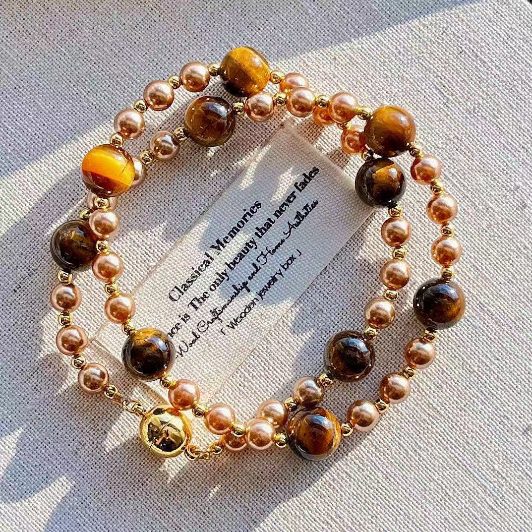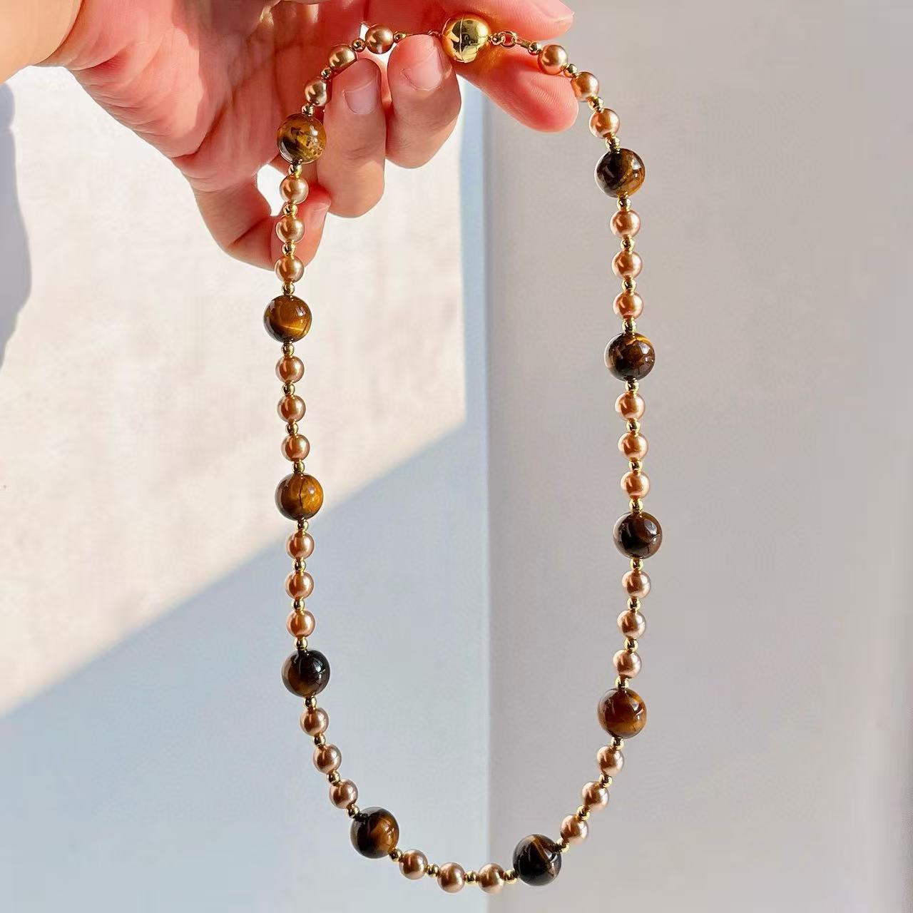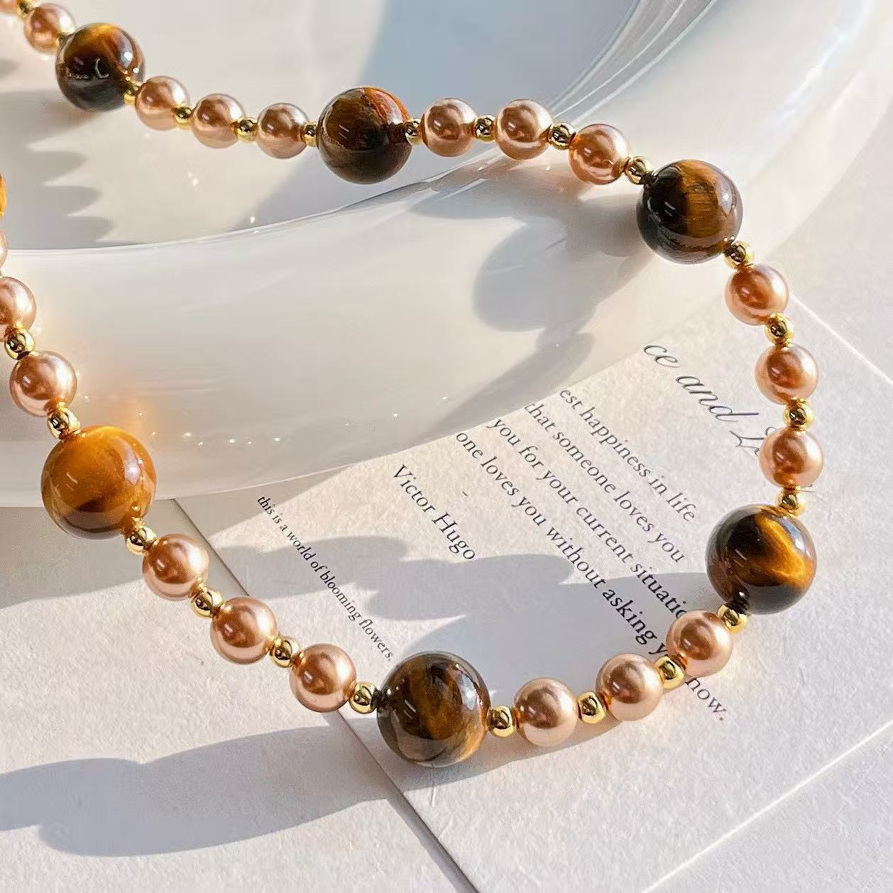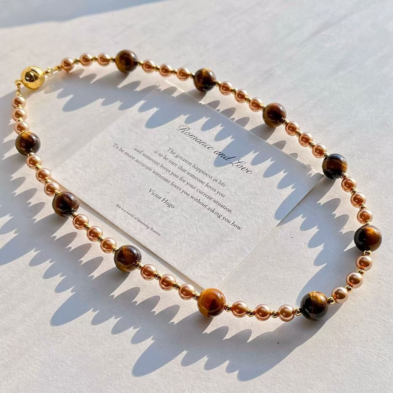 秋冬美拉德风天然精品虎眼石咖啡色仿大溪地珍珠满天星锁骨链项链