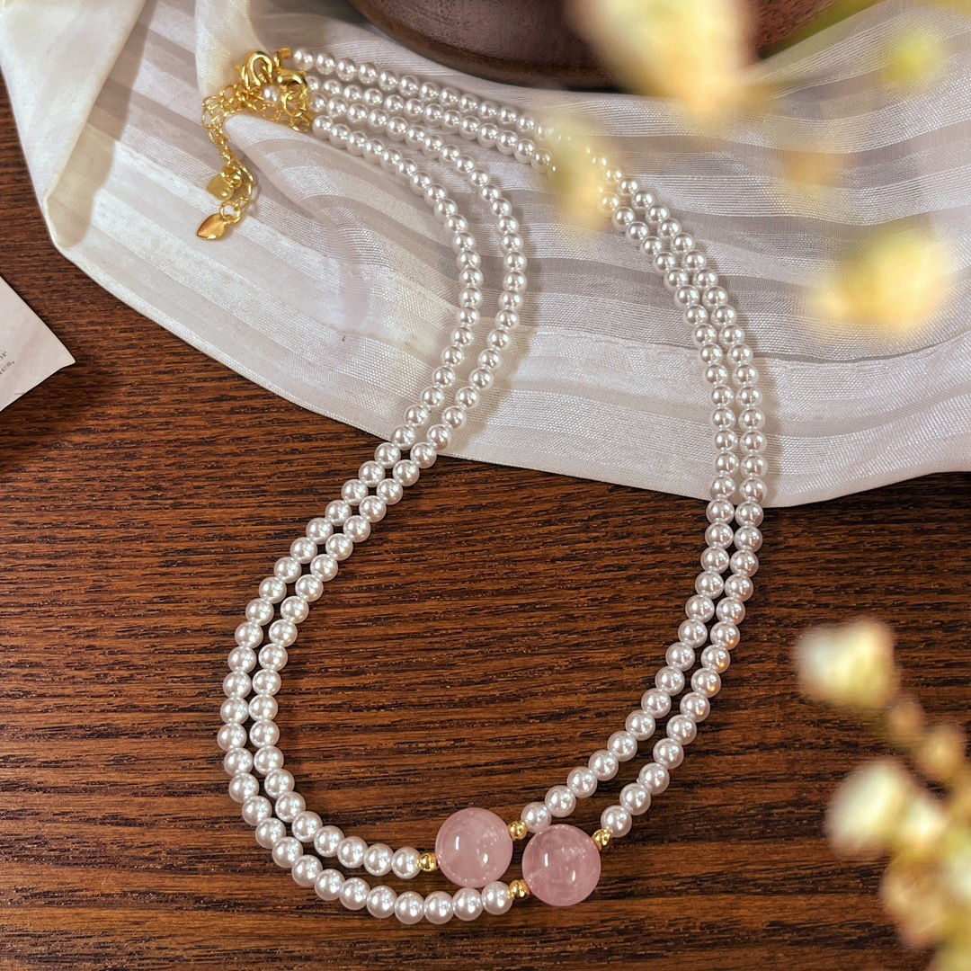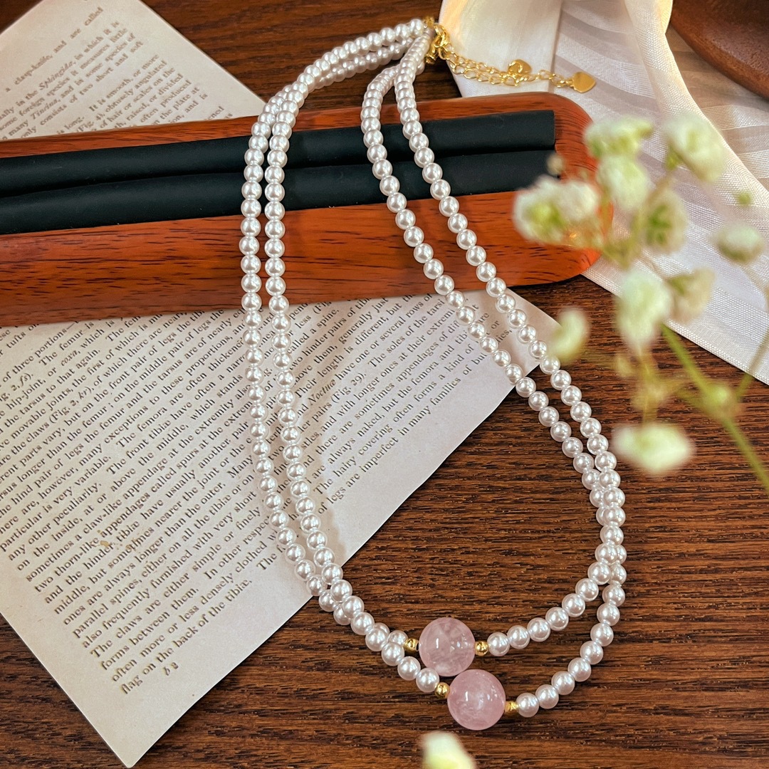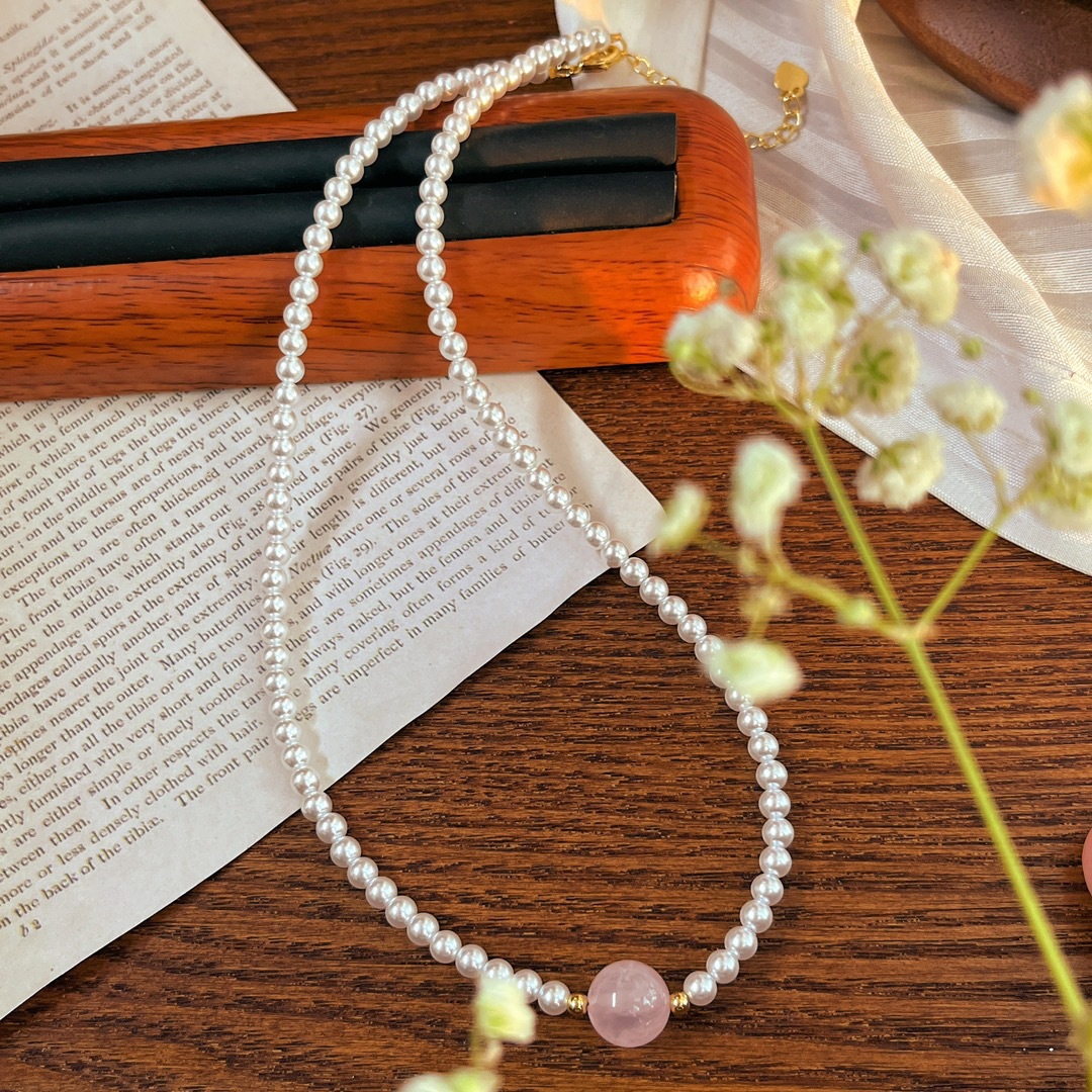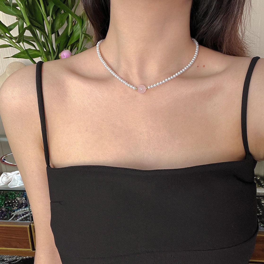 正圆强光仿澳白施家珍珠项链天然粉晶水晶珠锁骨链