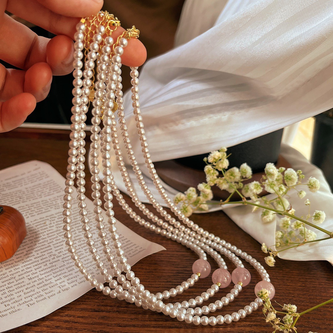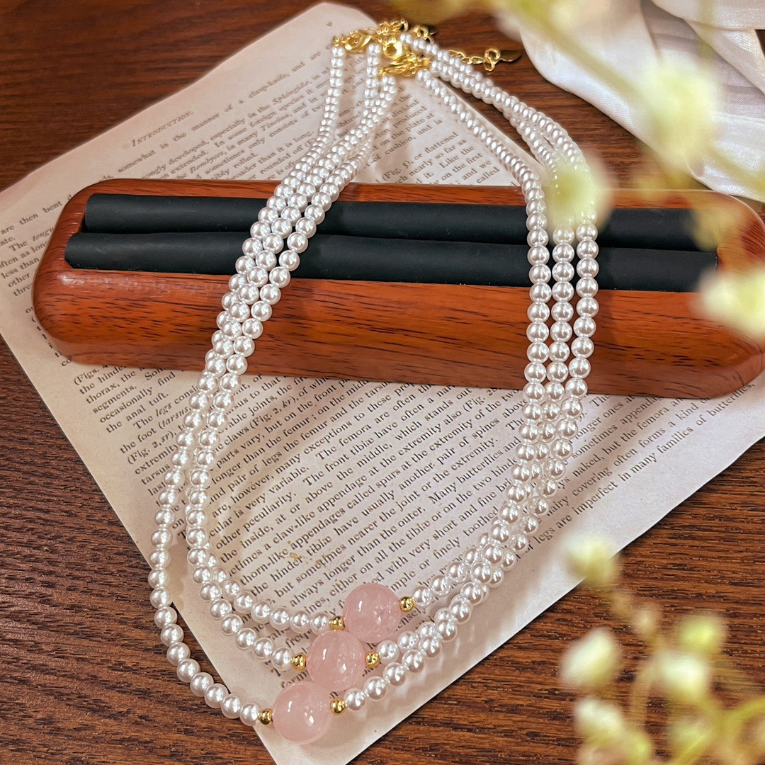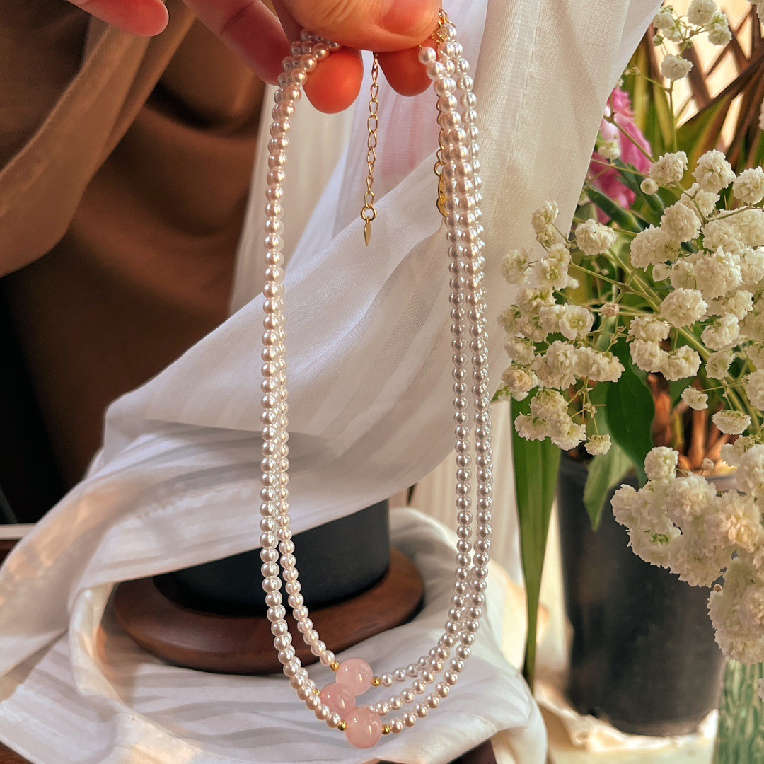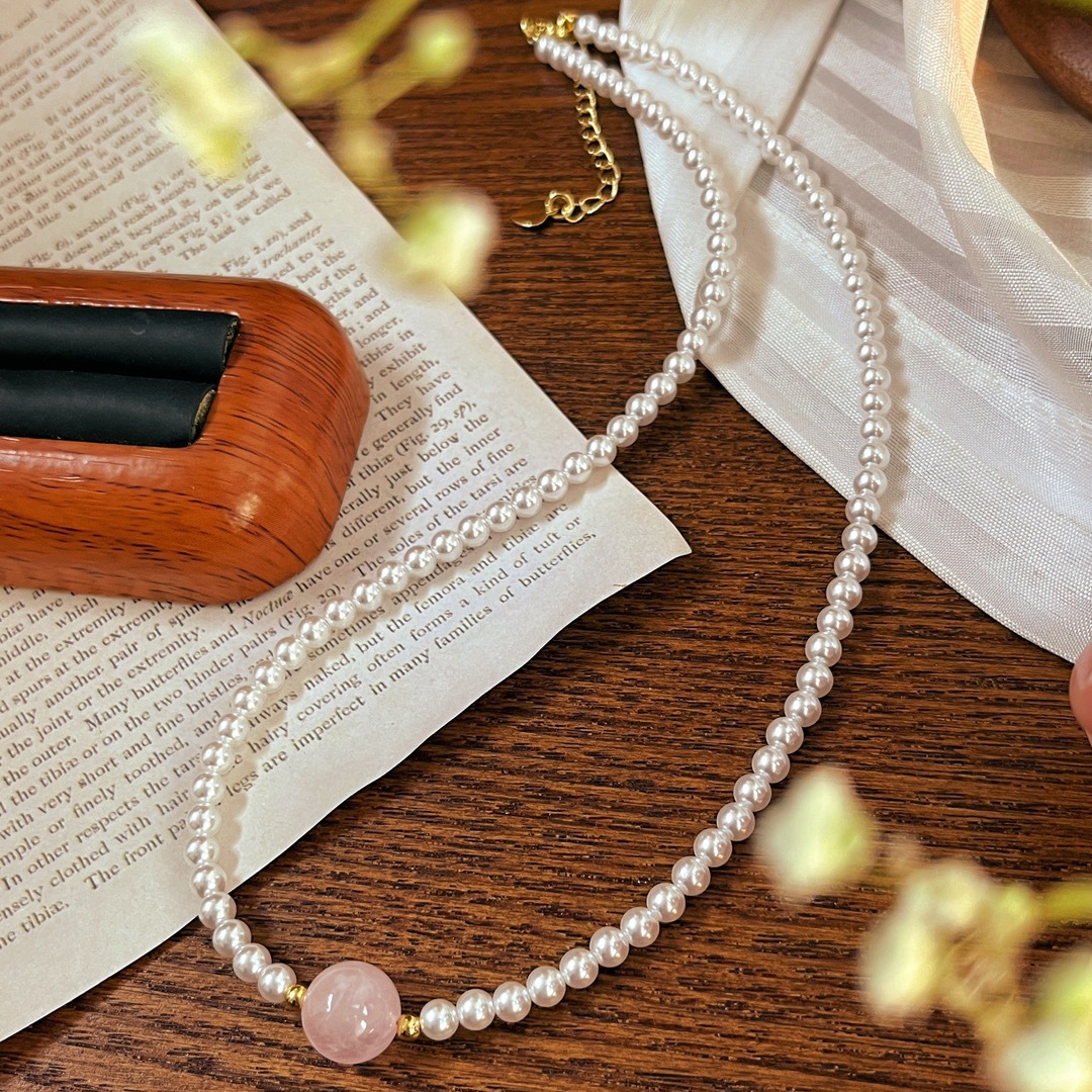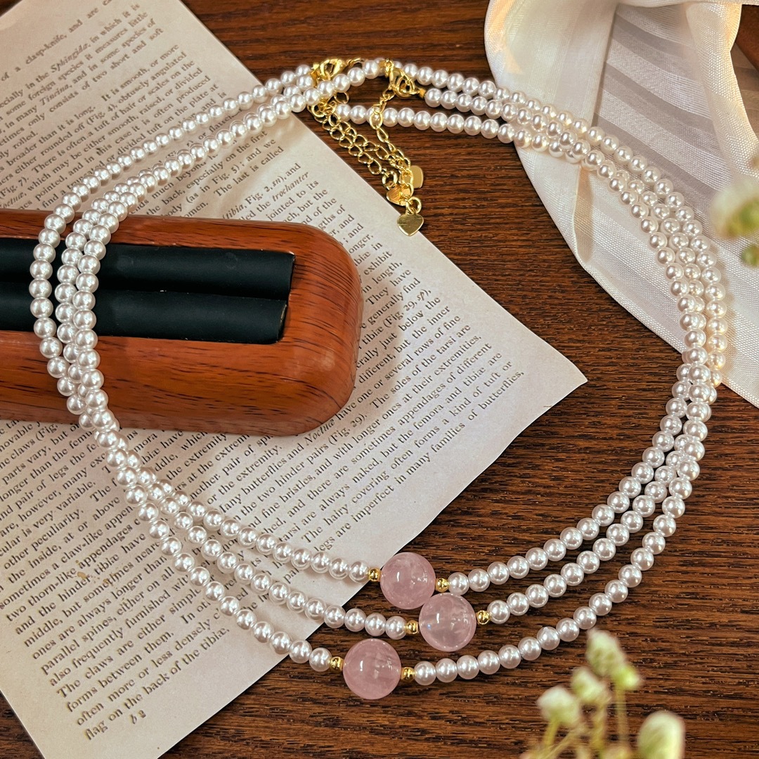 正圆强光仿澳白施家珍珠项链天然粉晶水晶珠锁骨链