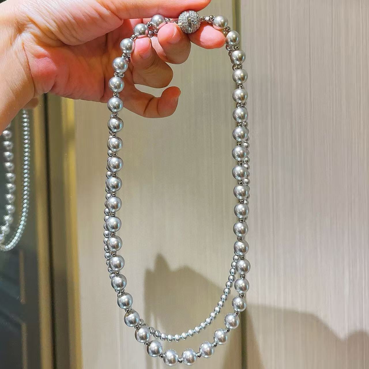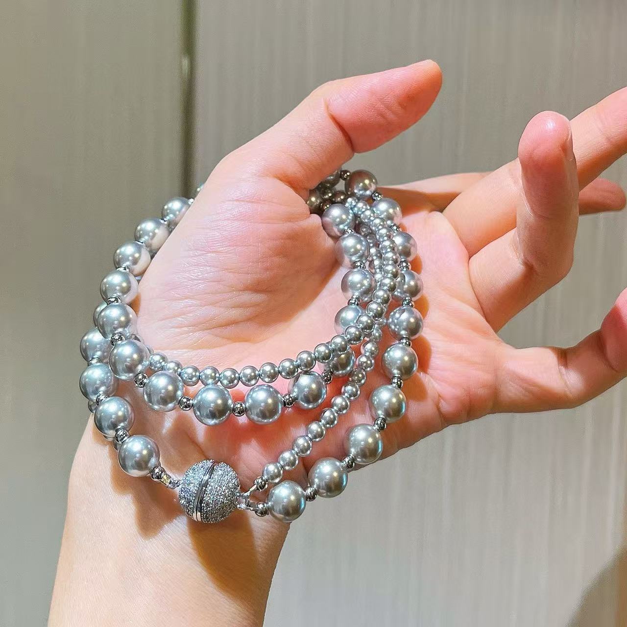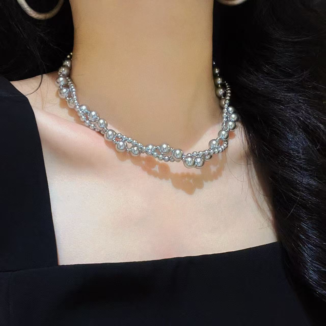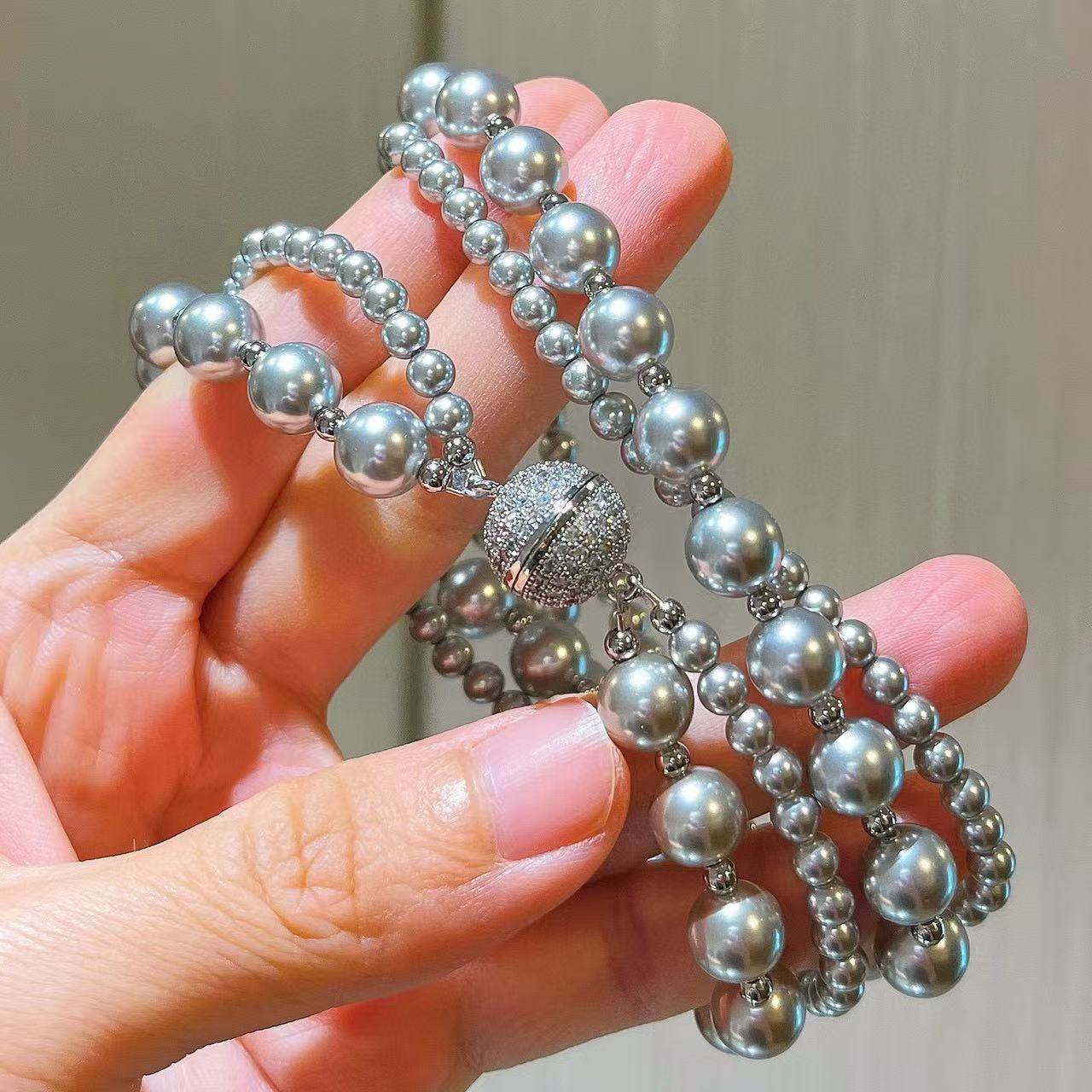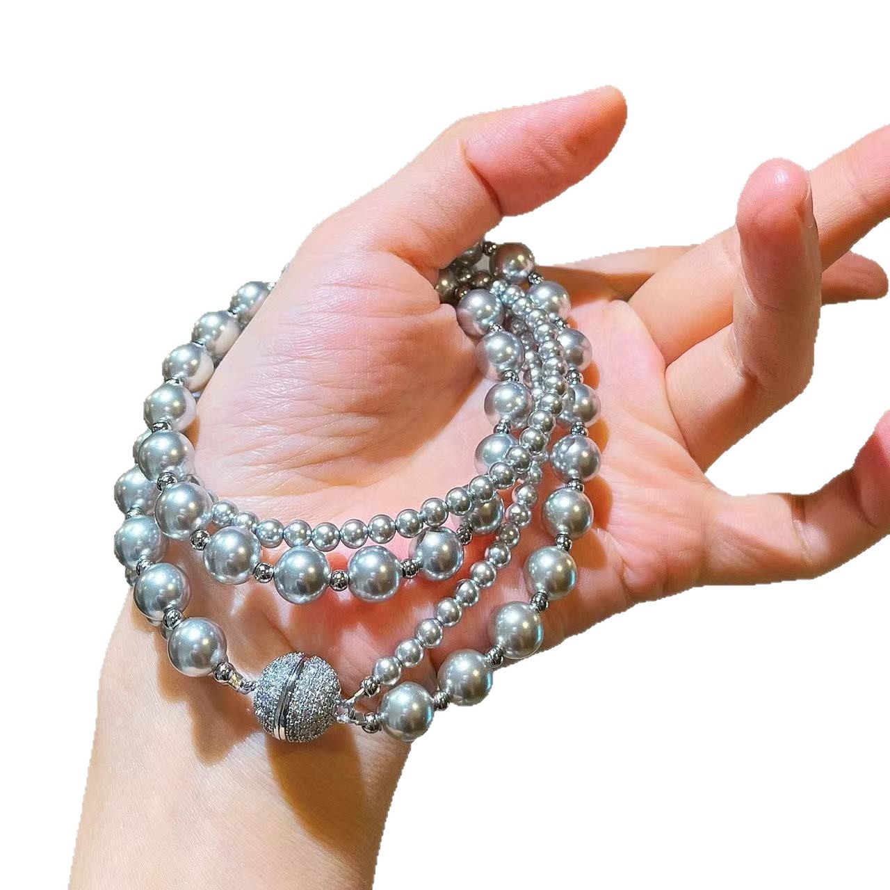 秋冬复古高品质人造水晶仿施家正圆强光珍珠锁骨链双层缠绕颈链
