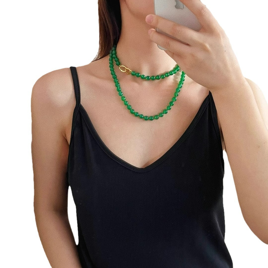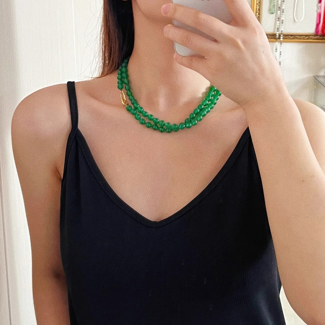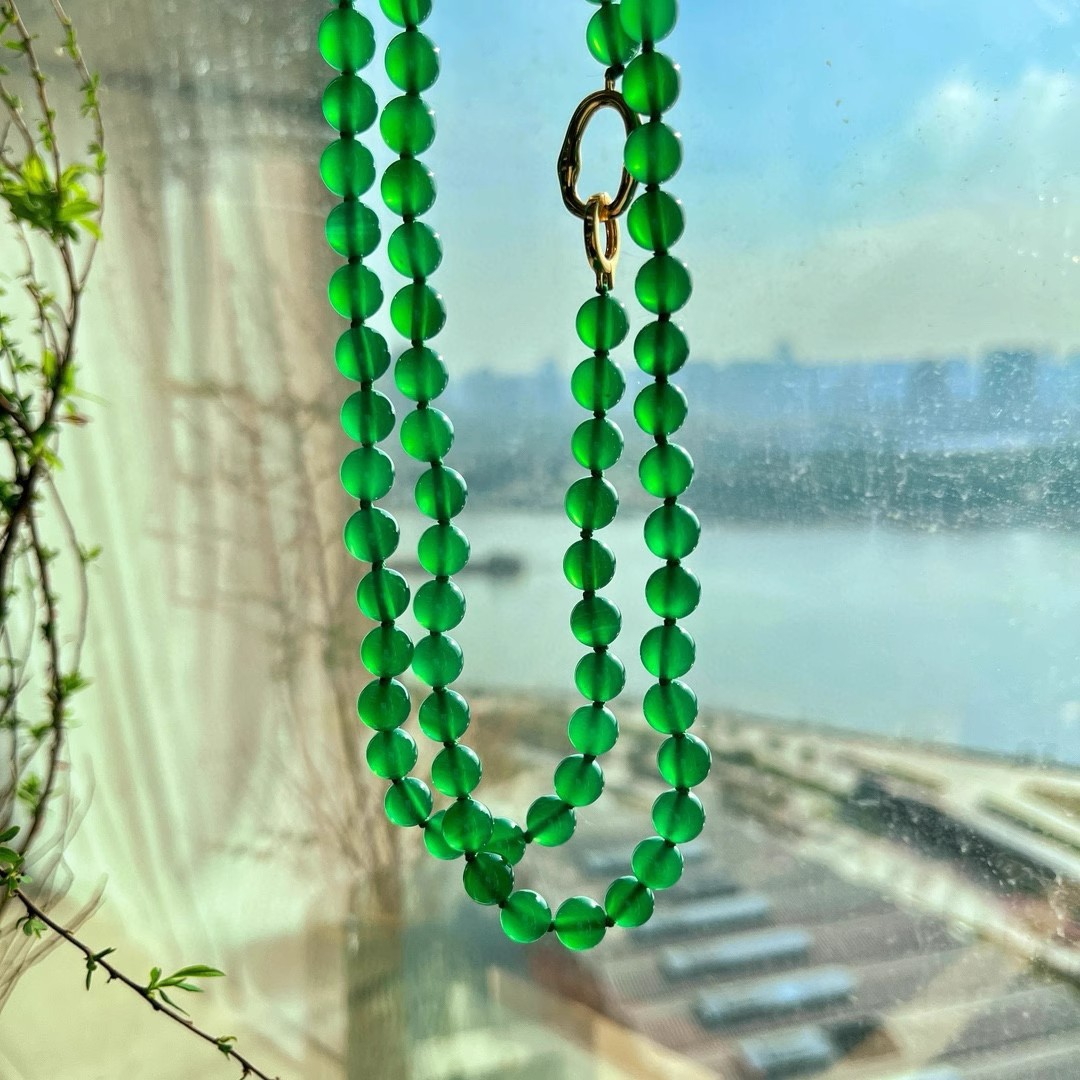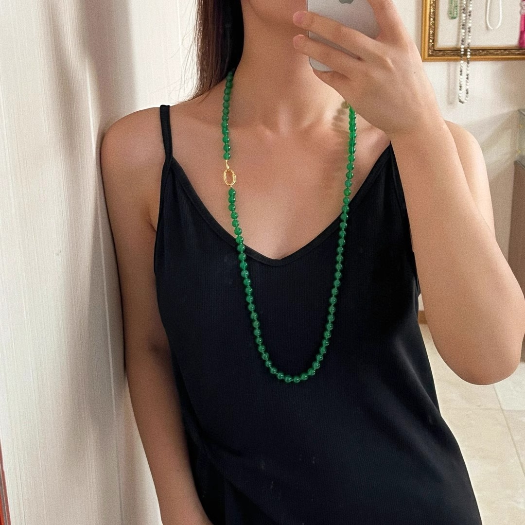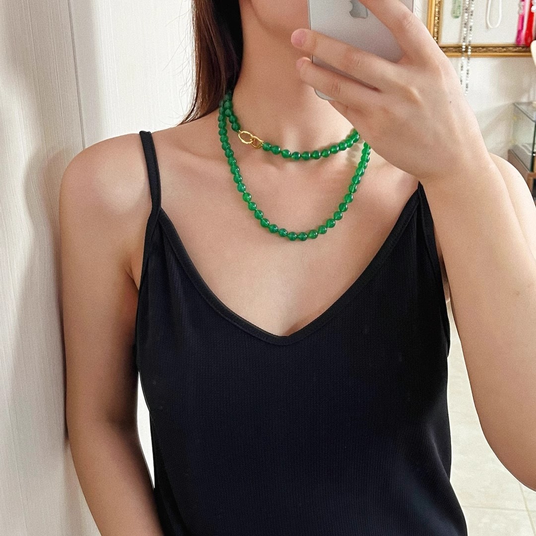 925银镀金扣 8mm6A起光天然绿玉髓项链 毛衣链 可叠戴 可当毛衣链
