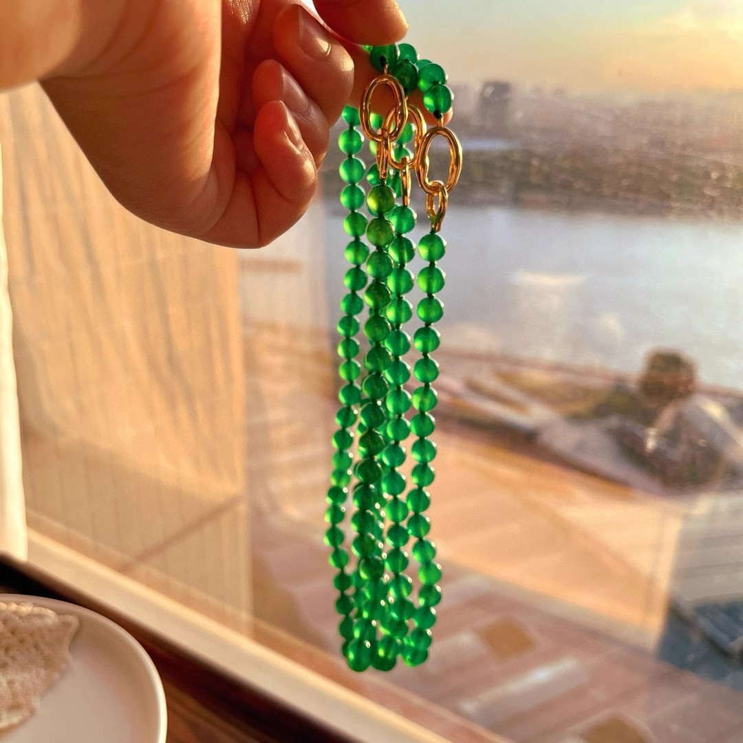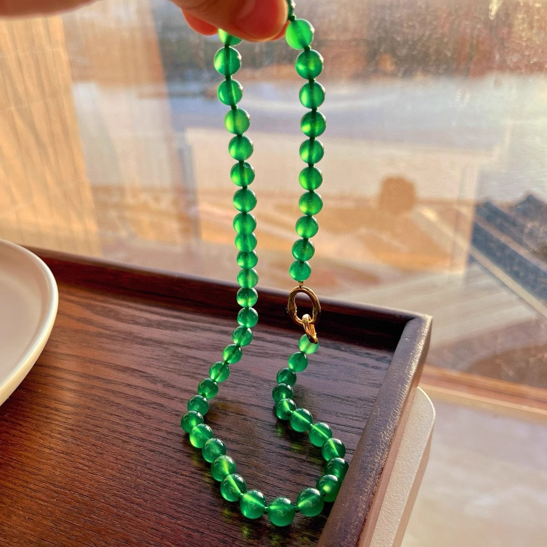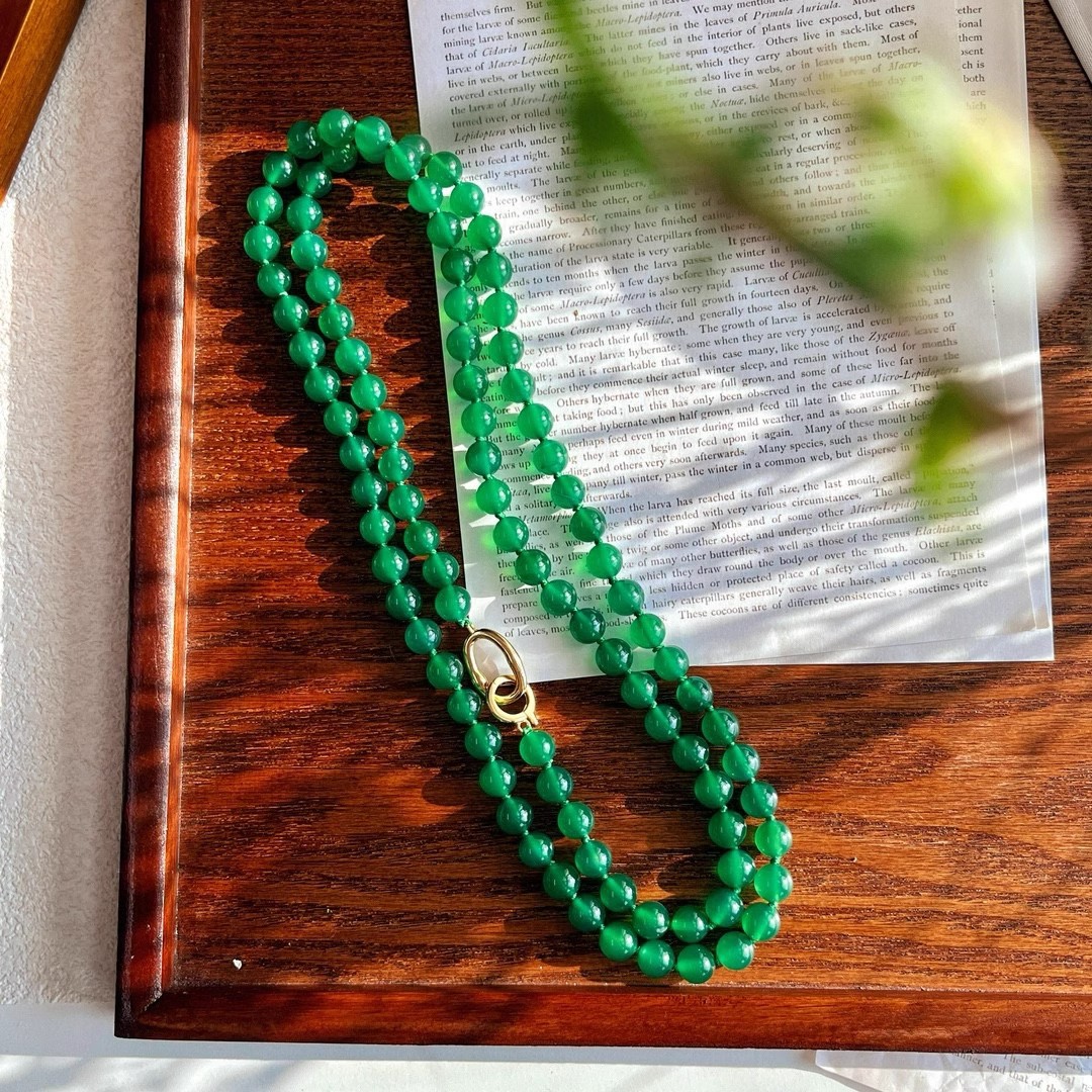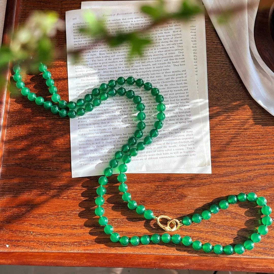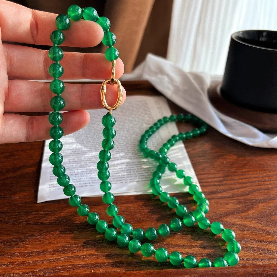 925银镀金扣 8mm6A起光天然绿玉髓项链 毛衣链 可叠戴 可当毛衣链