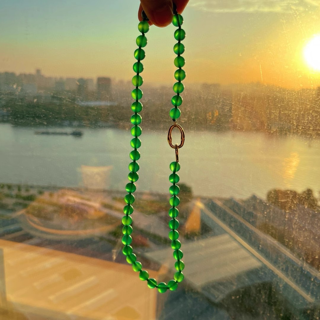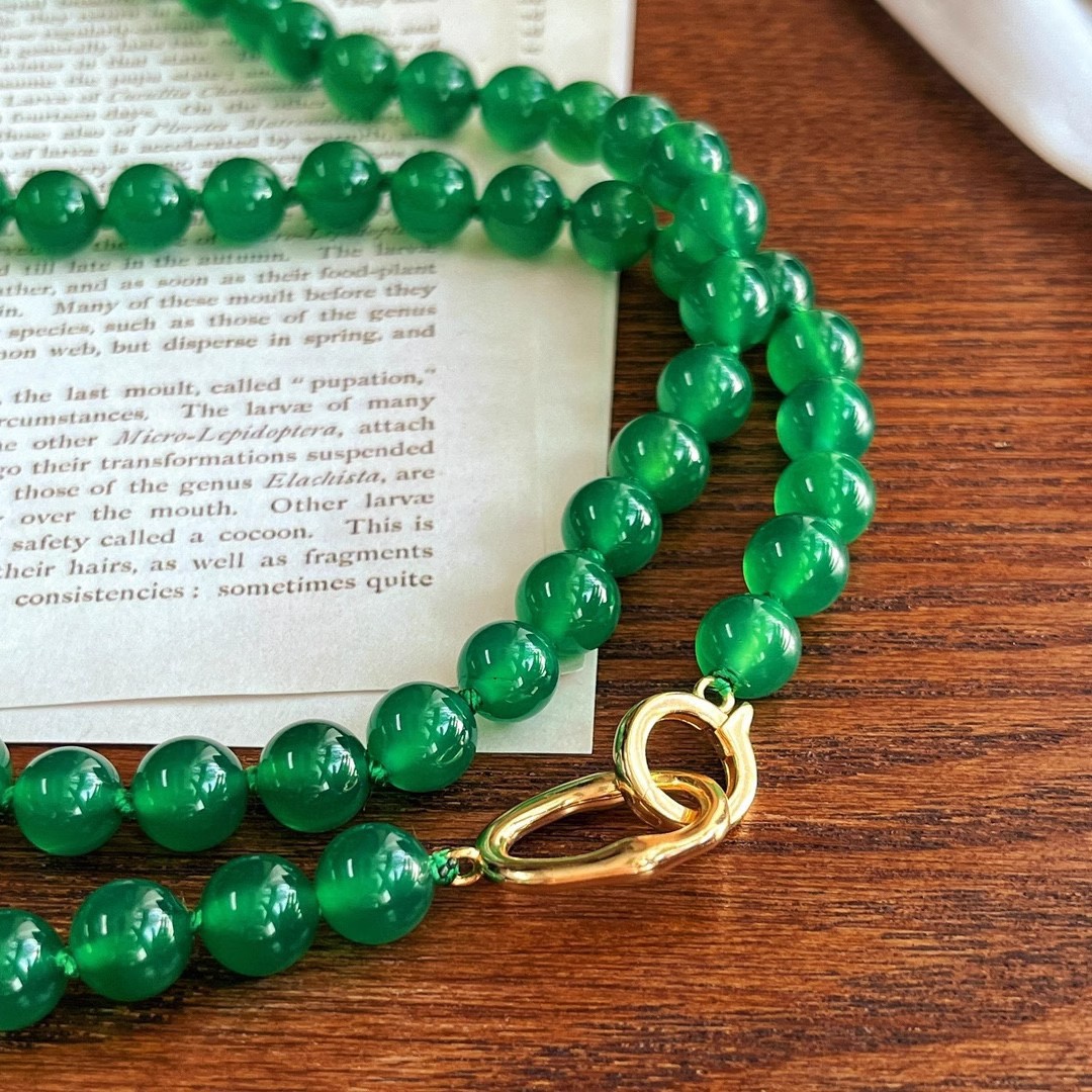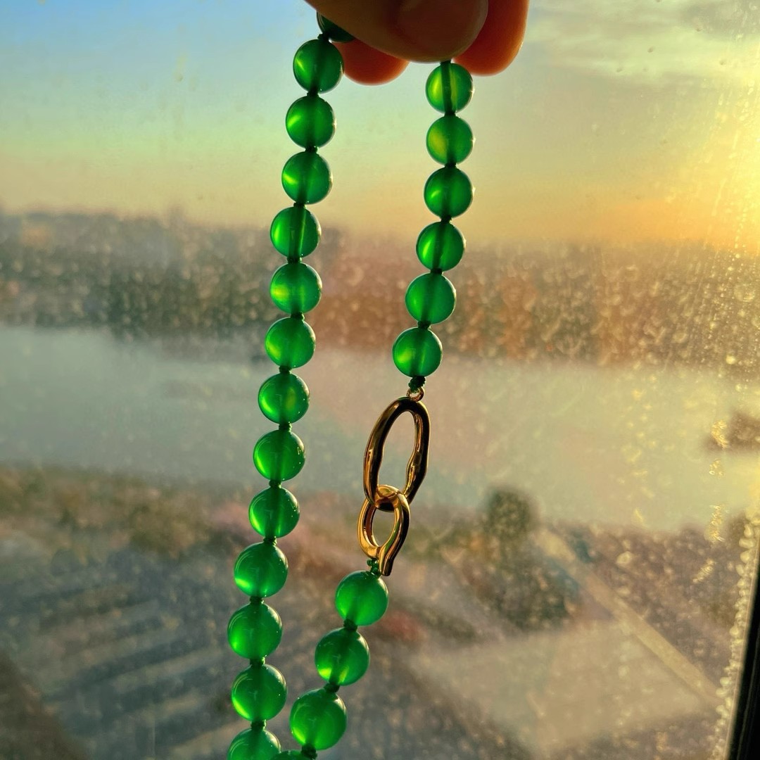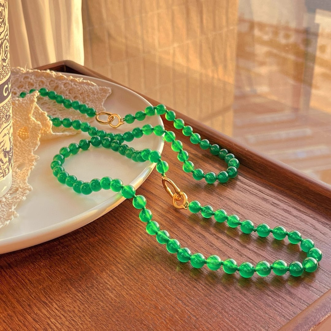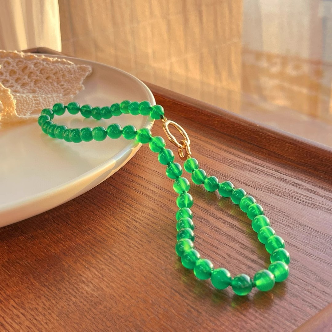 925银镀金扣 8mm6A起光天然绿玉髓项链 毛衣链 可叠戴 可当毛衣链