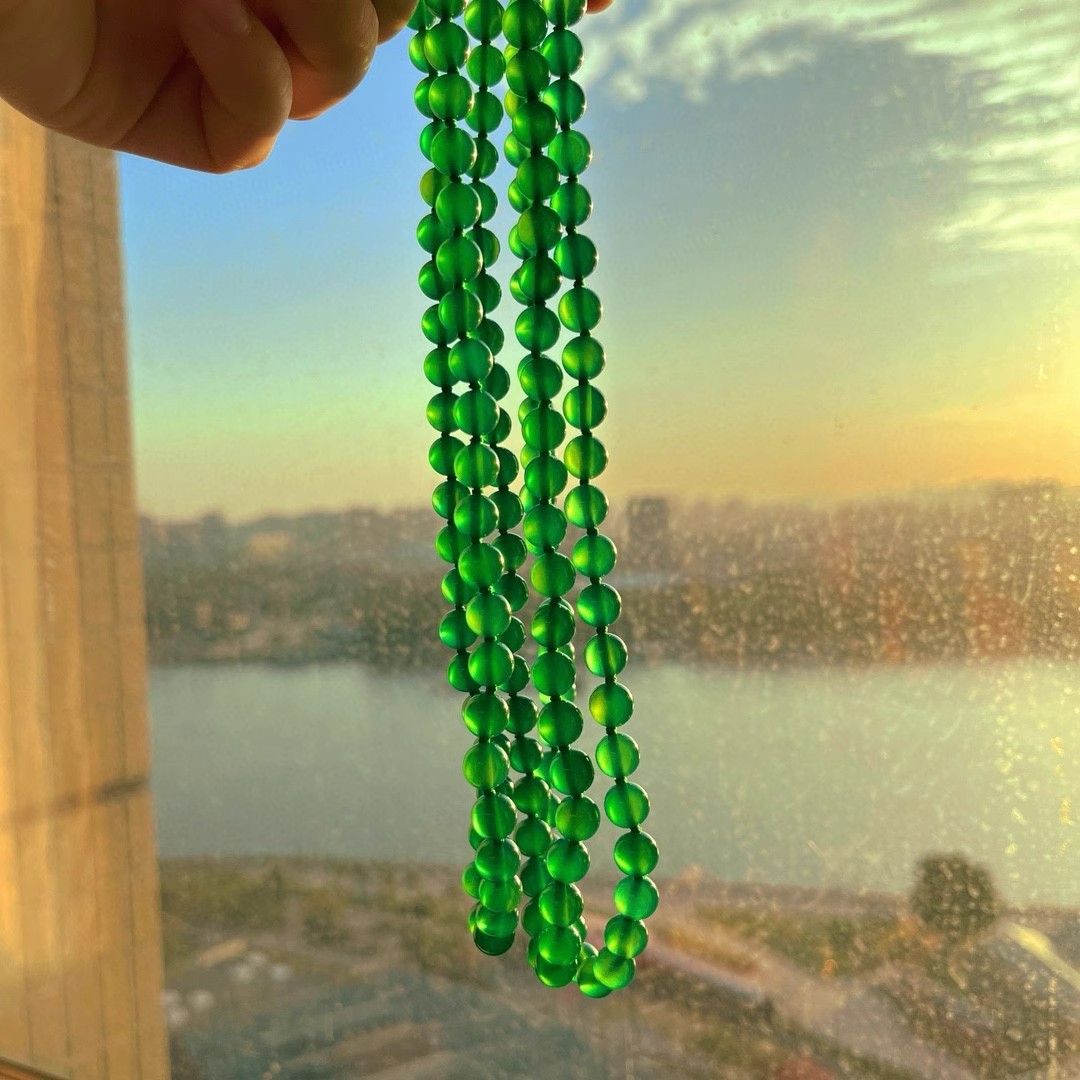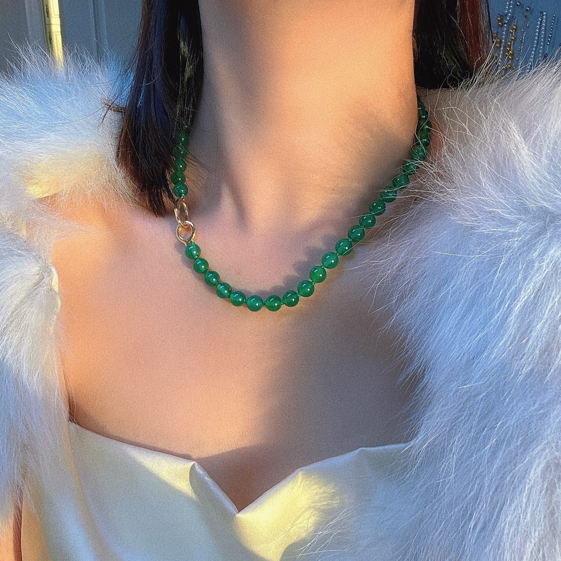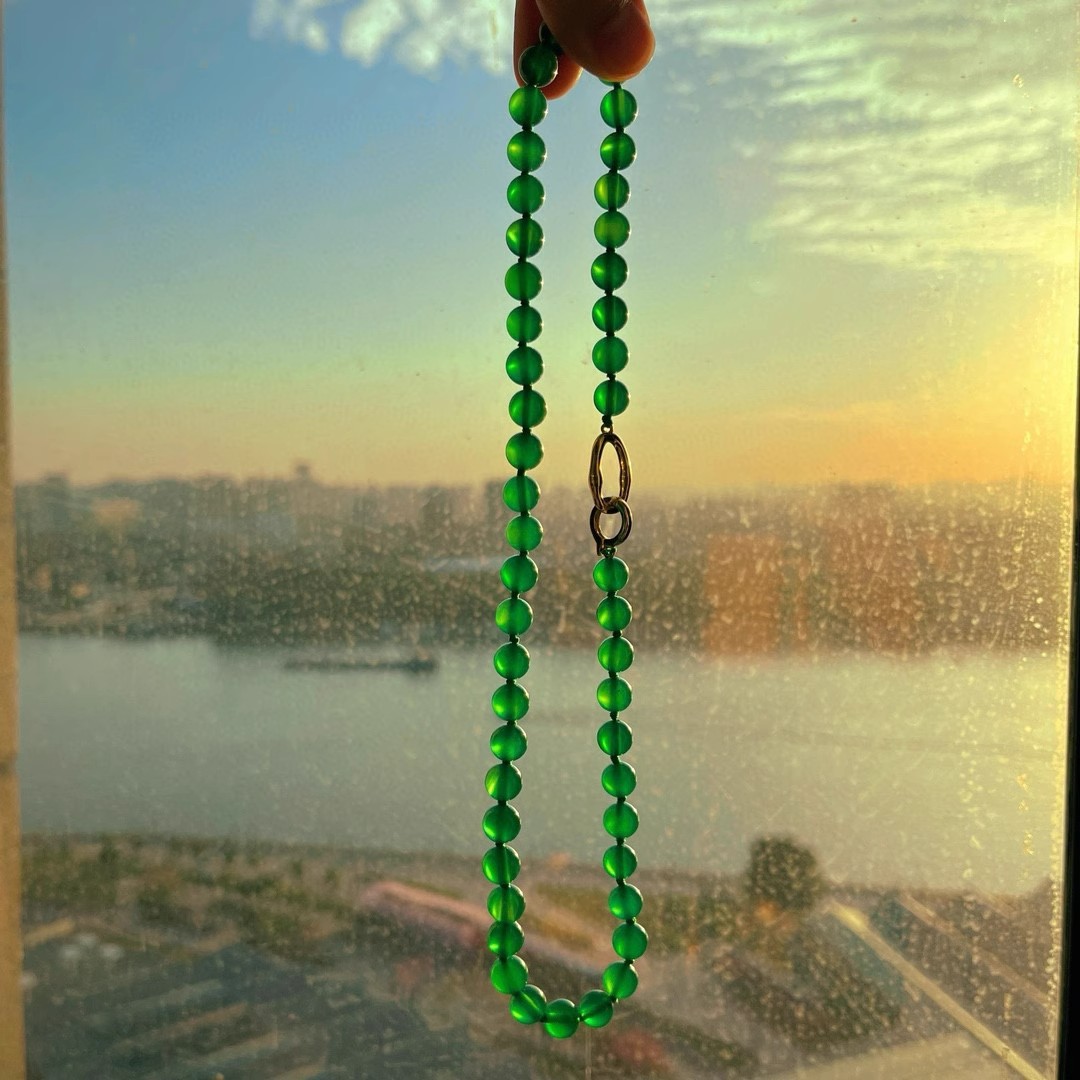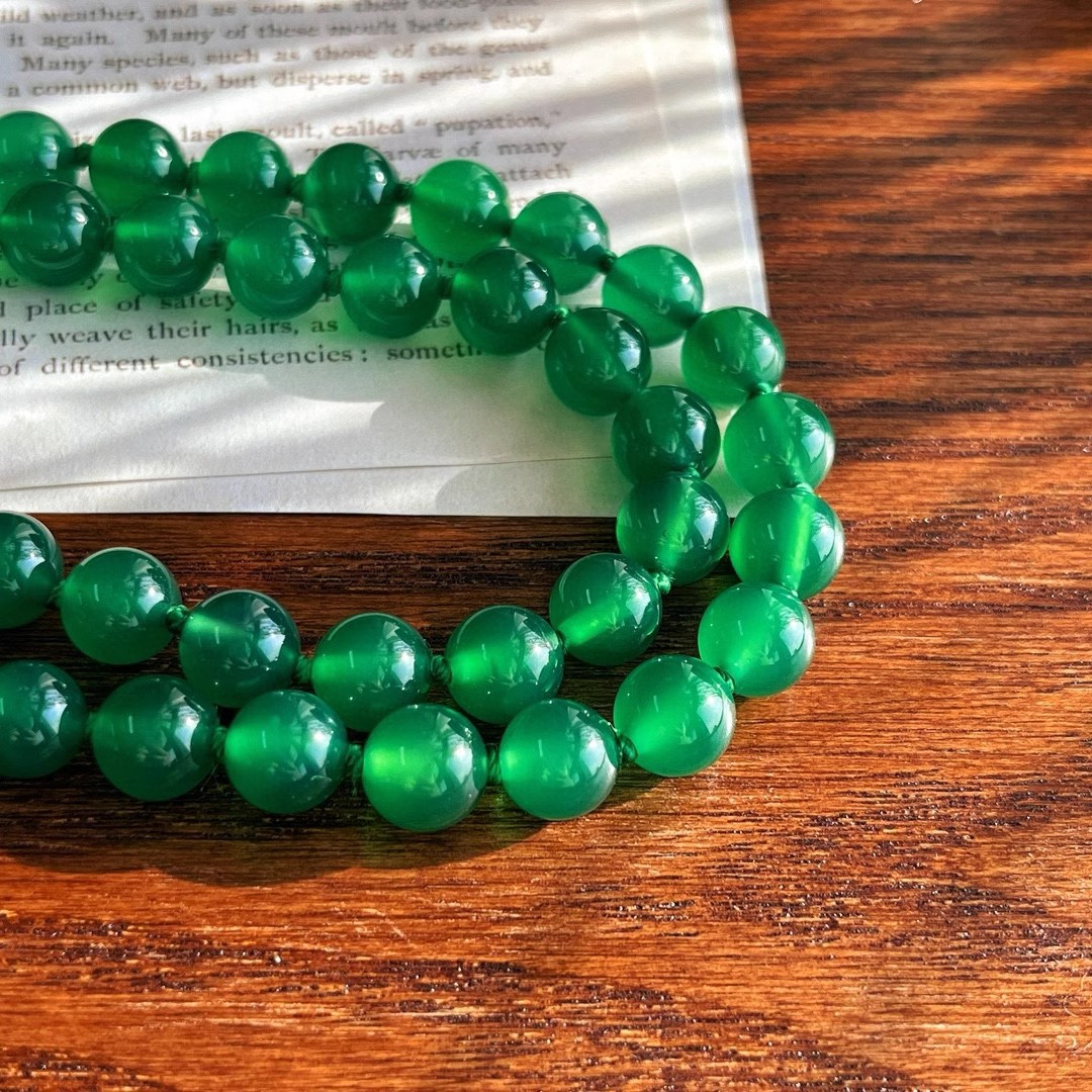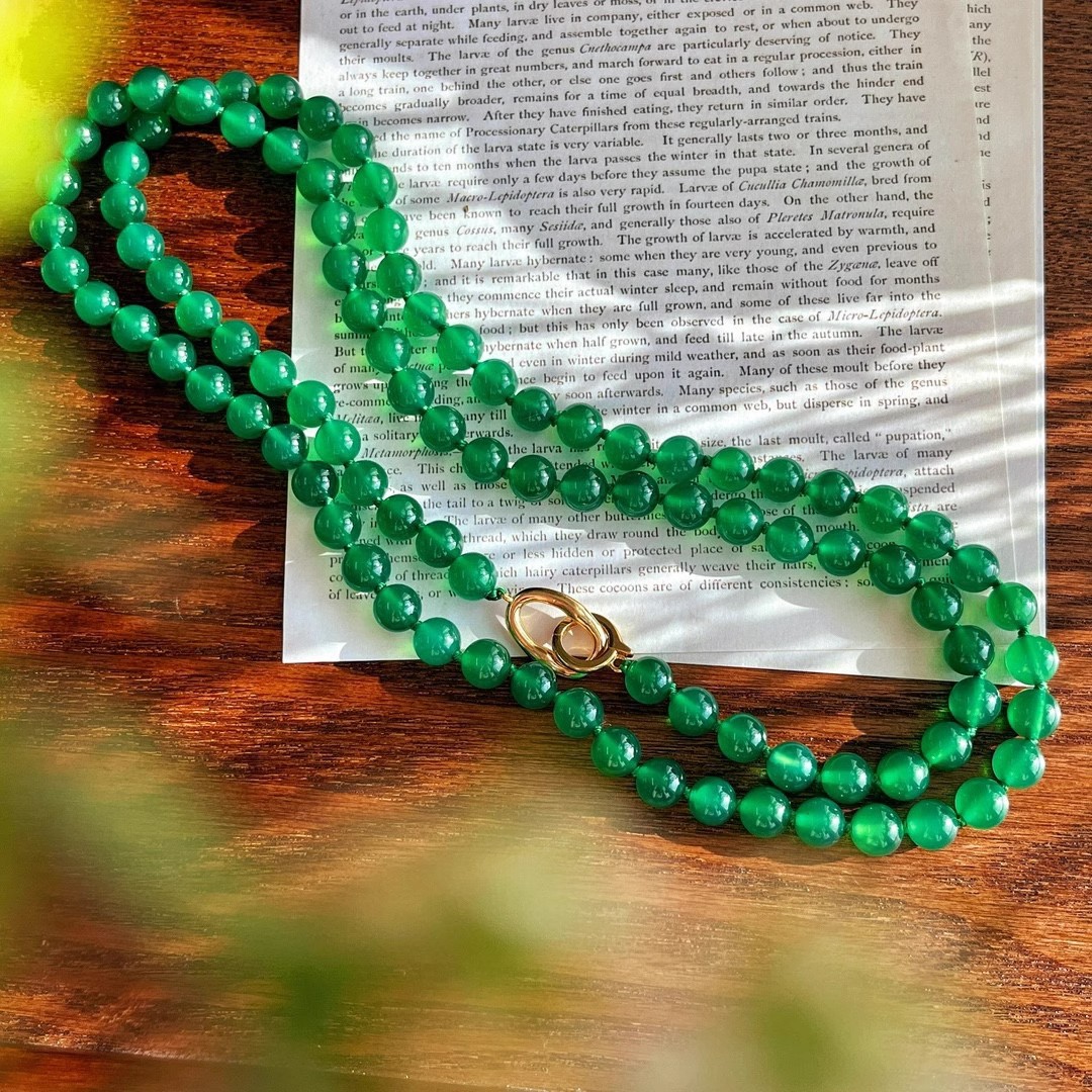 925银镀金扣 8mm6A起光天然绿玉髓项链 毛衣链 可叠戴 可当毛衣链