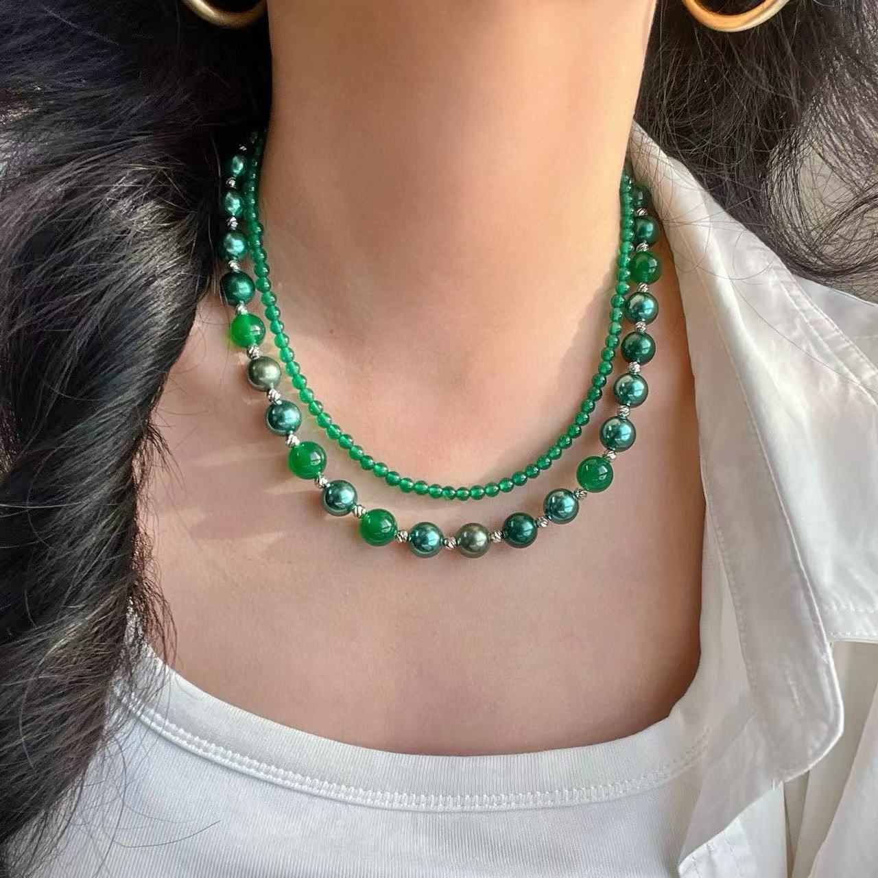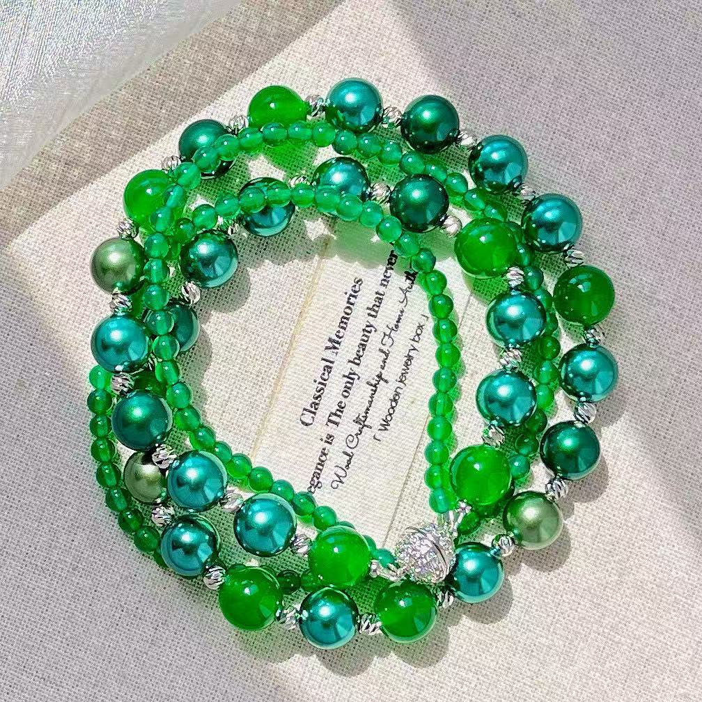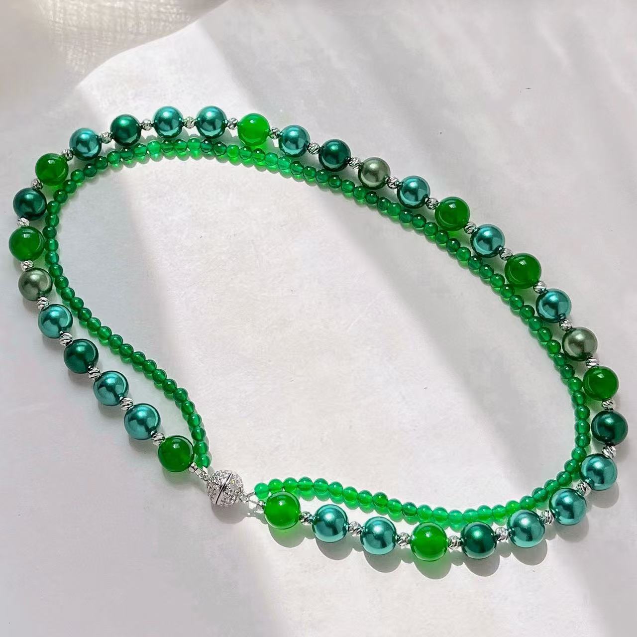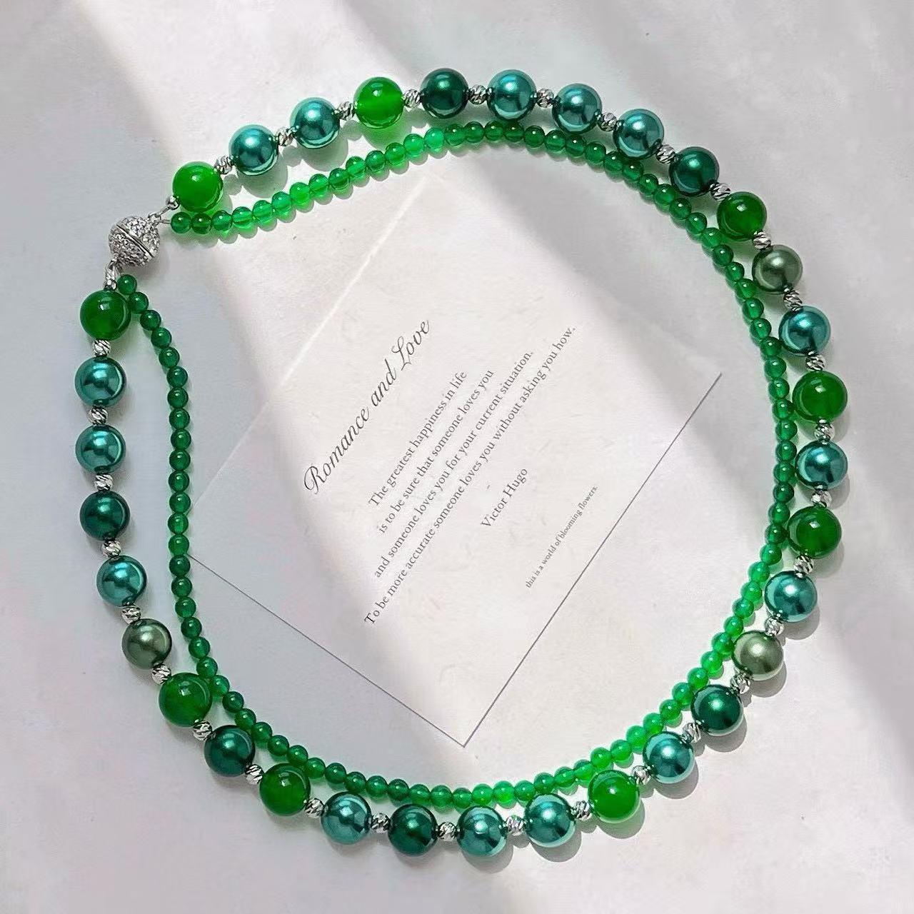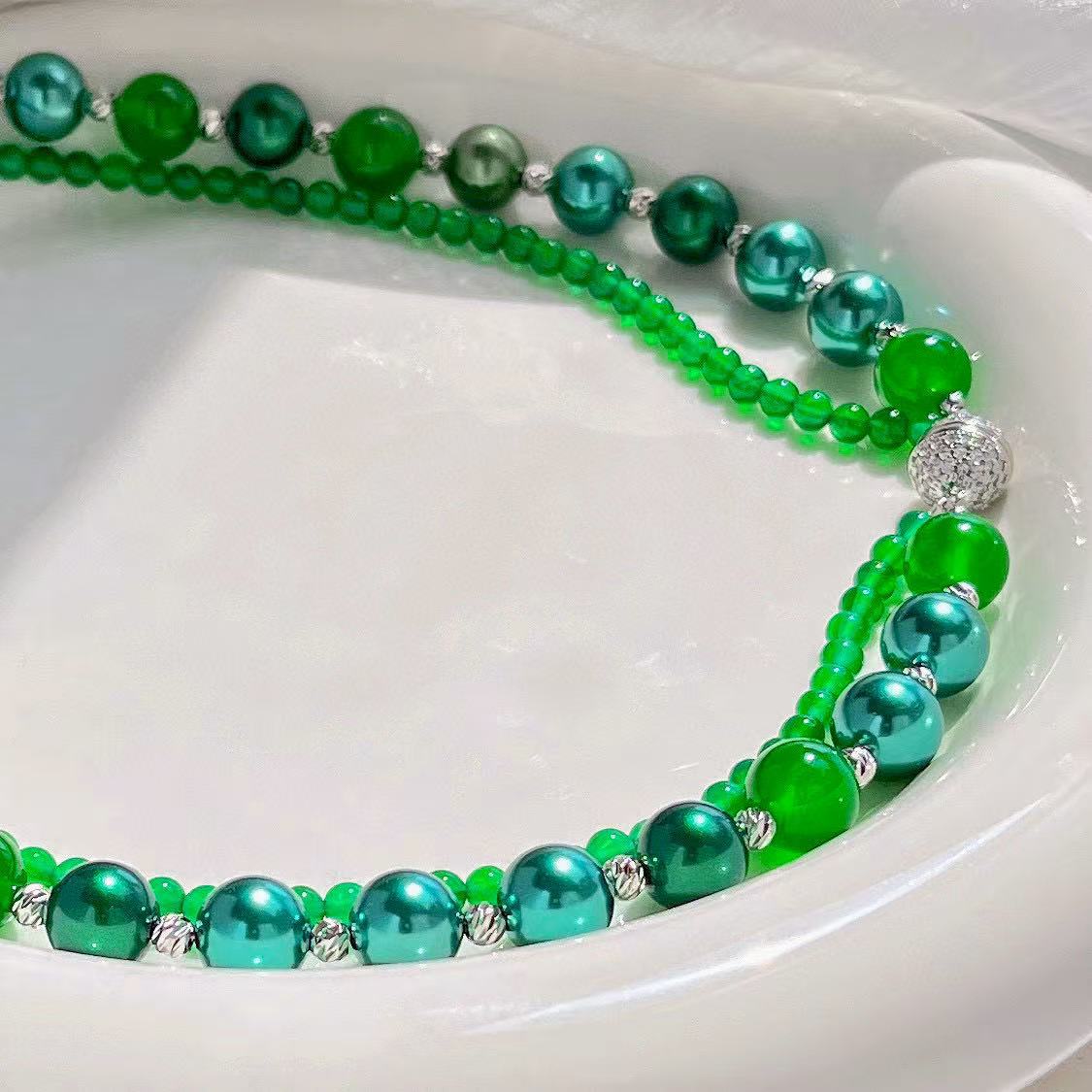 复古高定天然绿玉髓莫兰迪孔雀绿混彩人造海水珍珠多层项链锁骨链