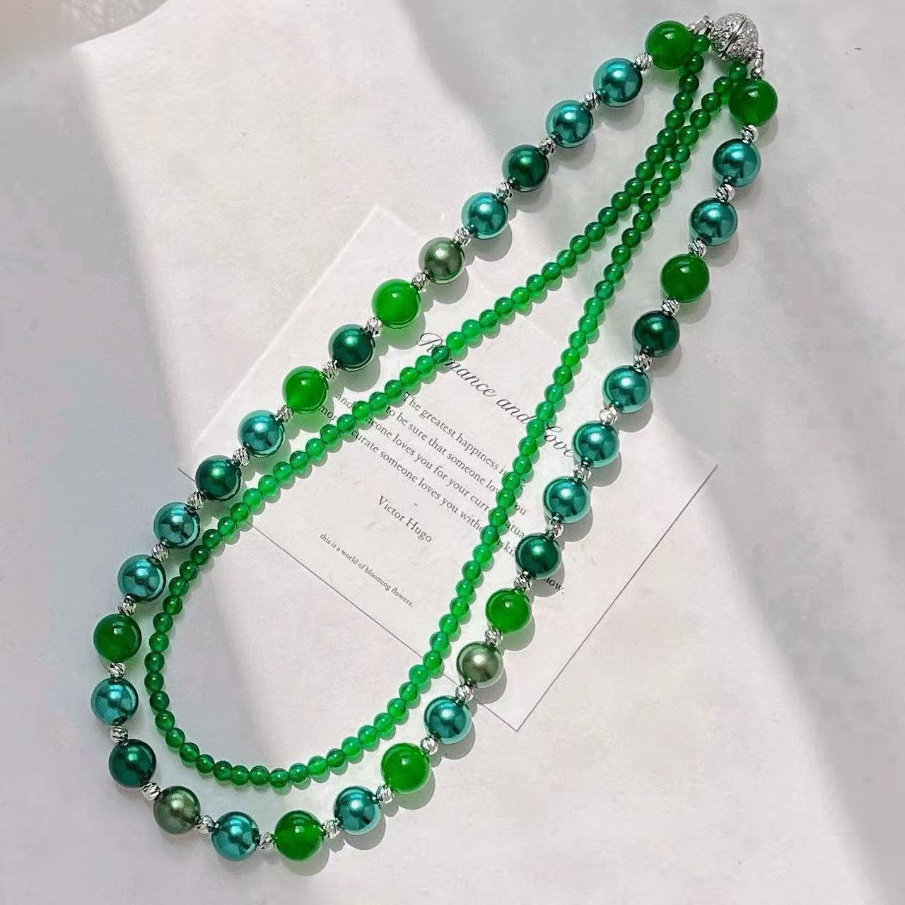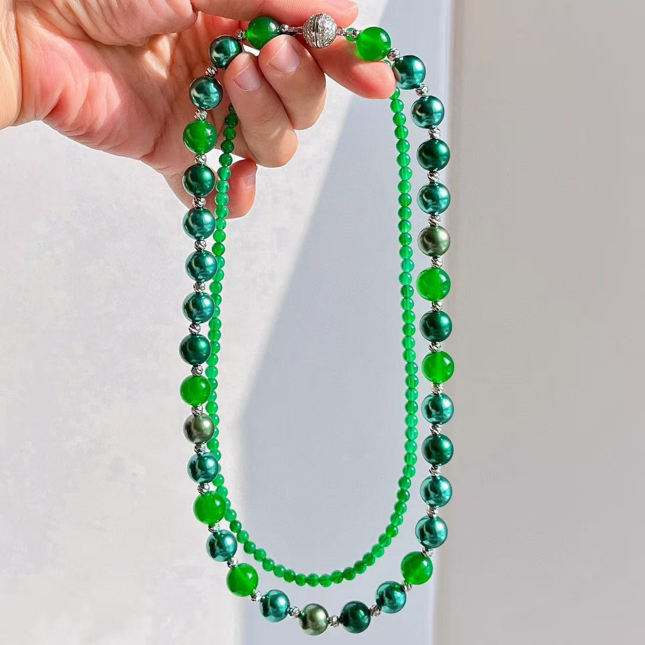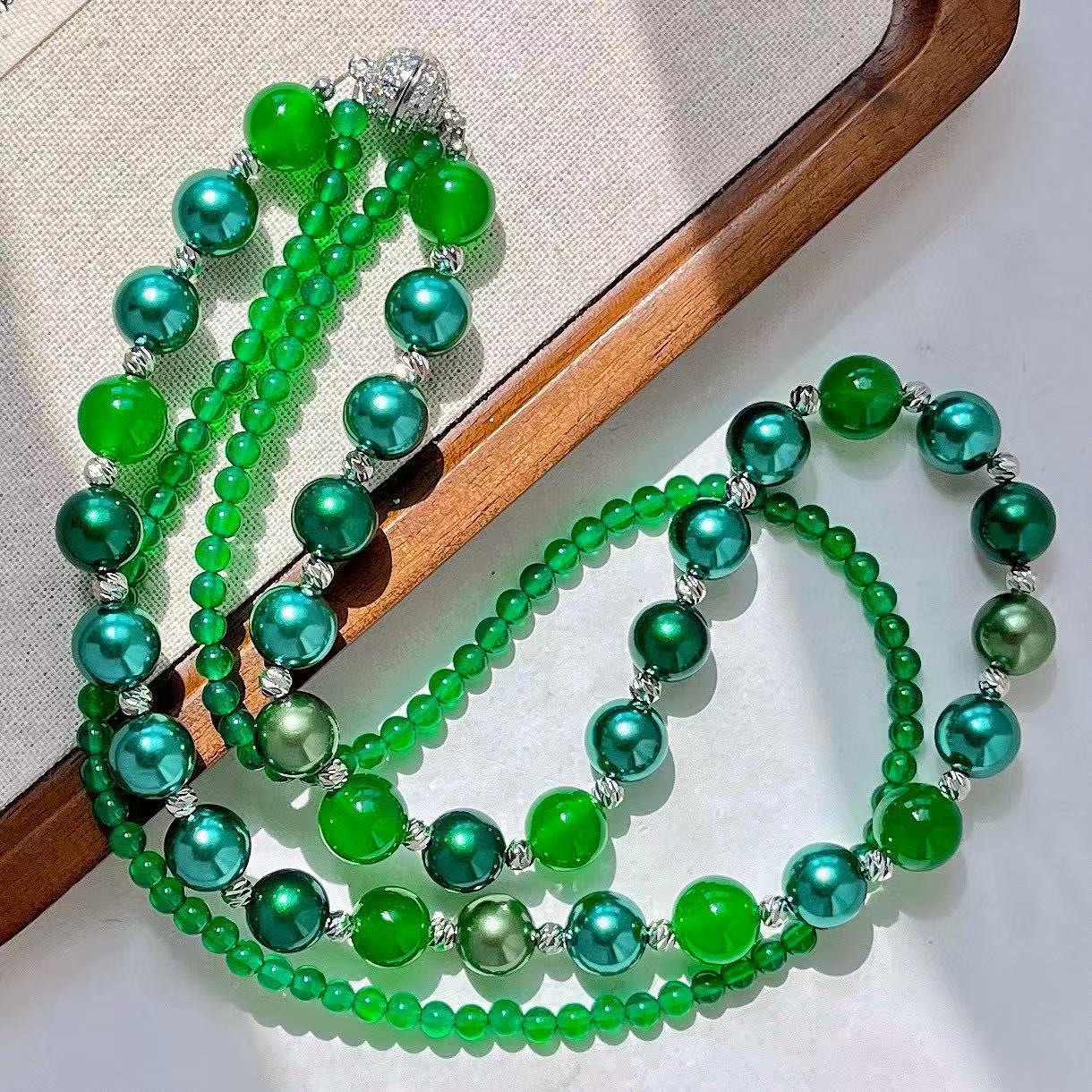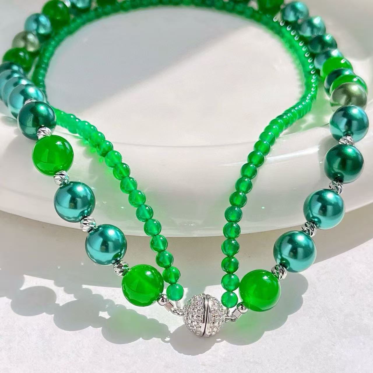 复古高定天然绿玉髓莫兰迪孔雀绿混彩人造海水珍珠多层项链锁骨链