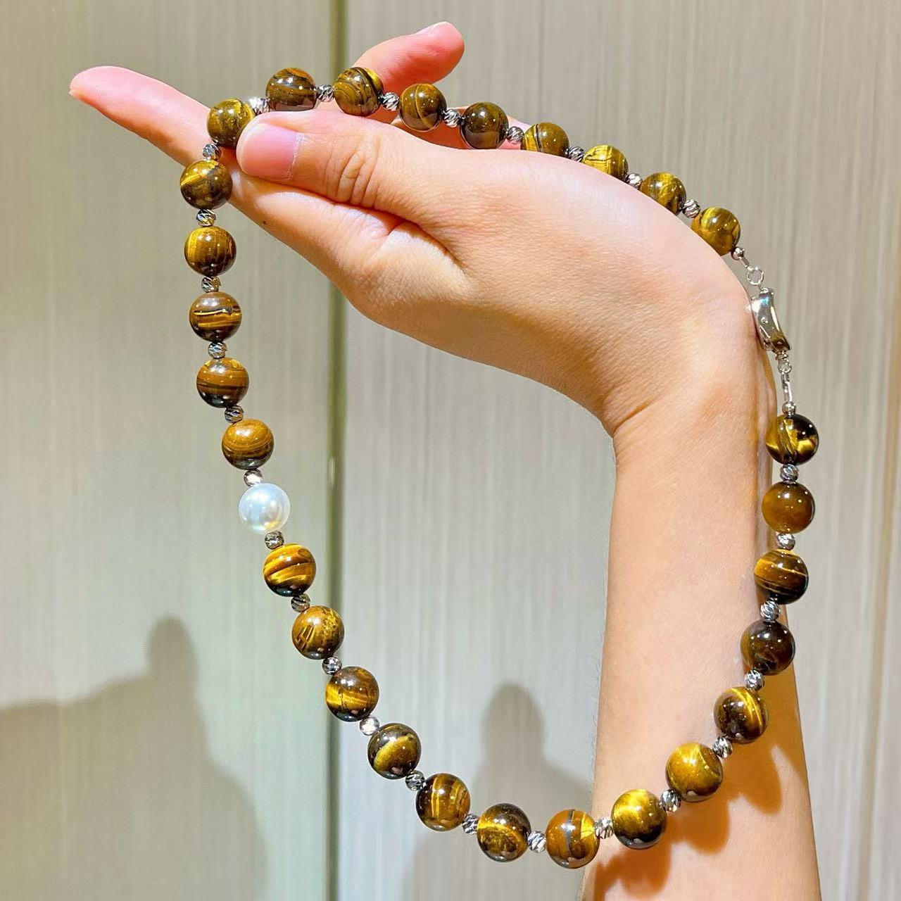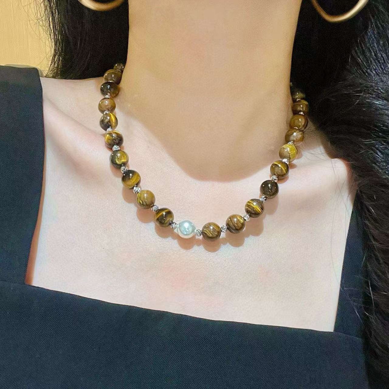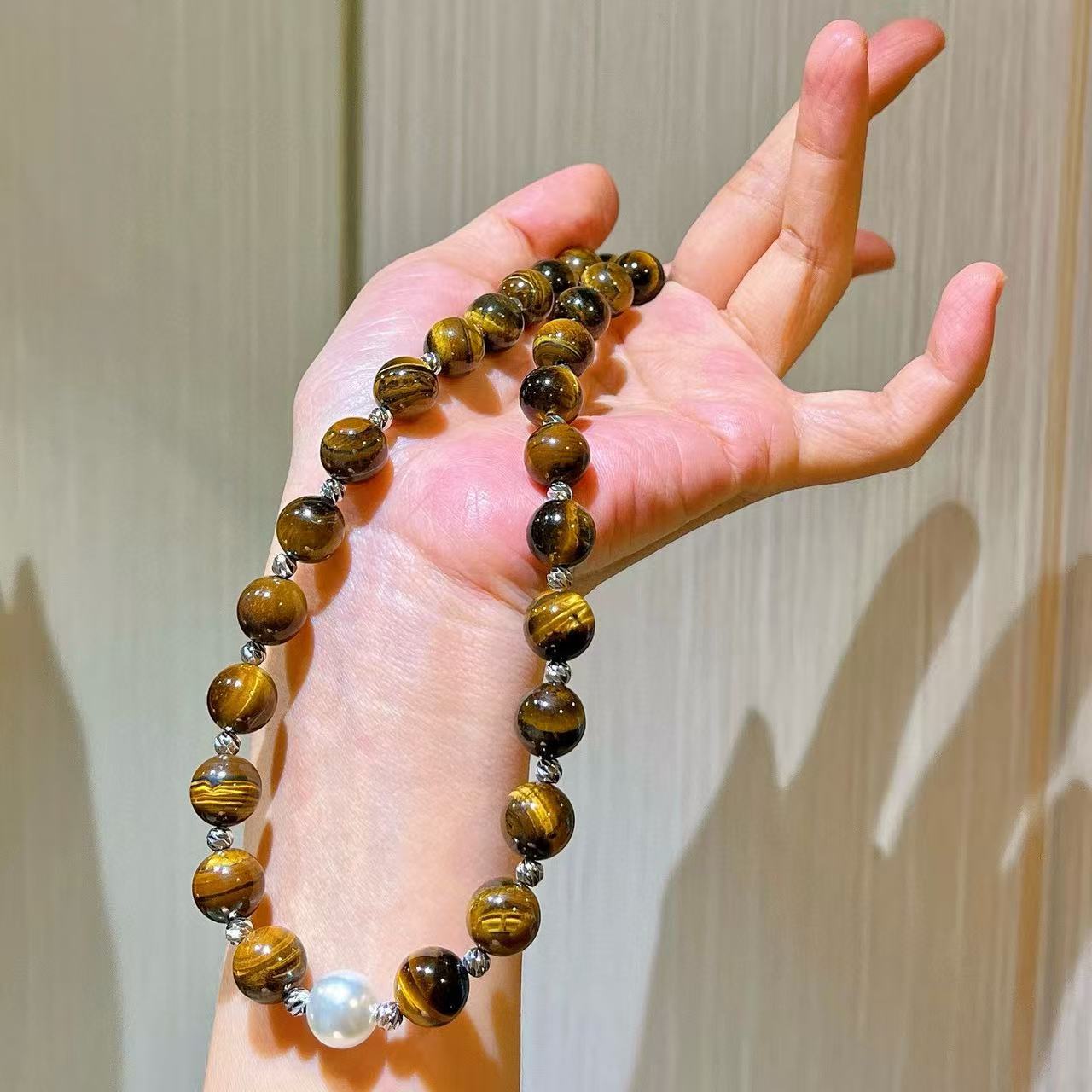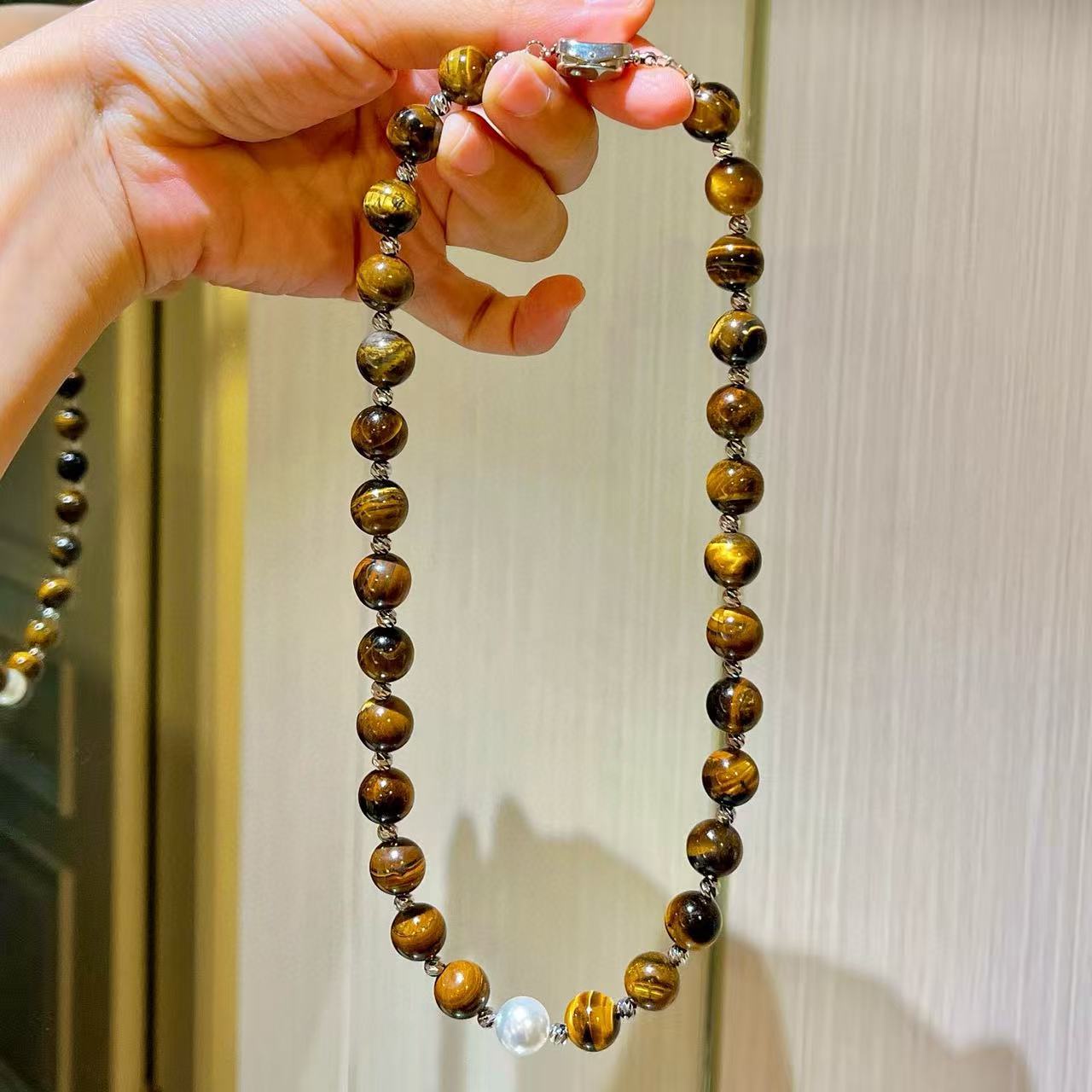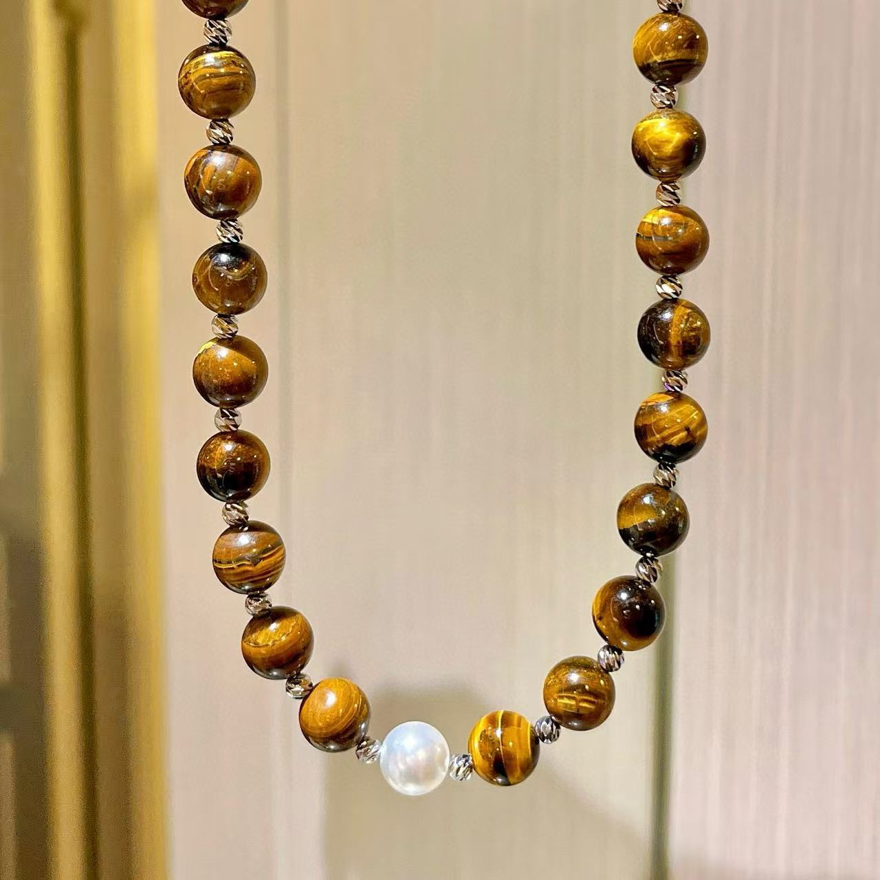 10mm美拉德天然精品虎眼石仿澳白珍珠水晶锁骨链项链保真可复检