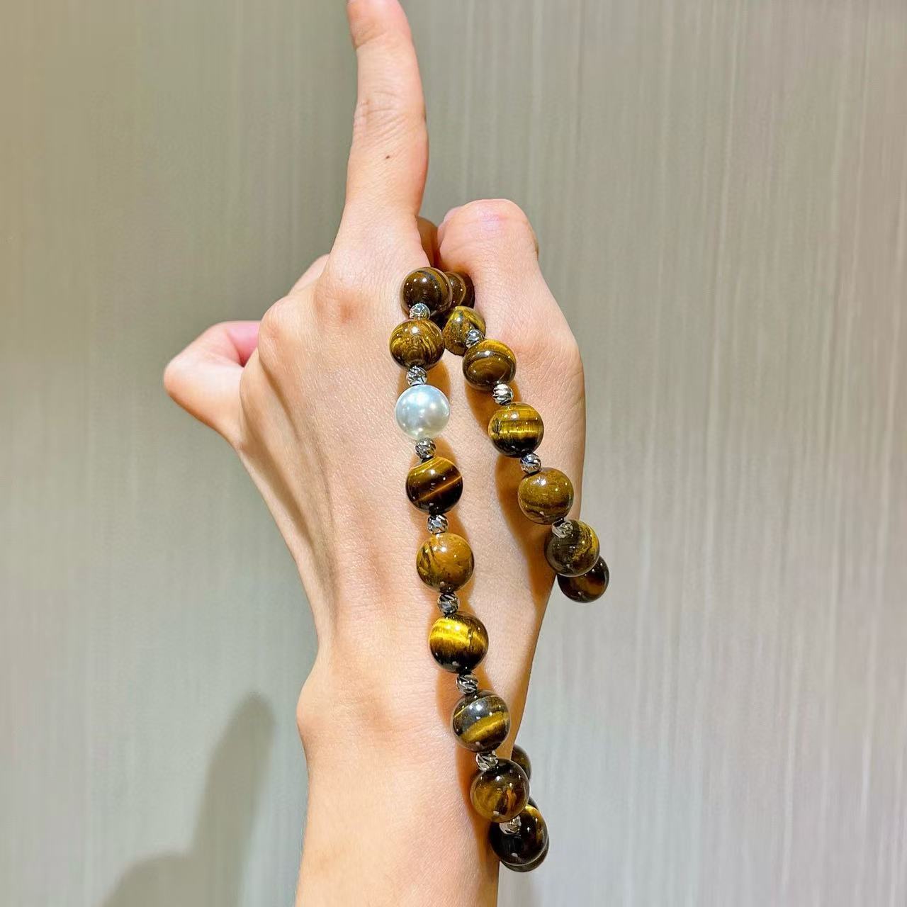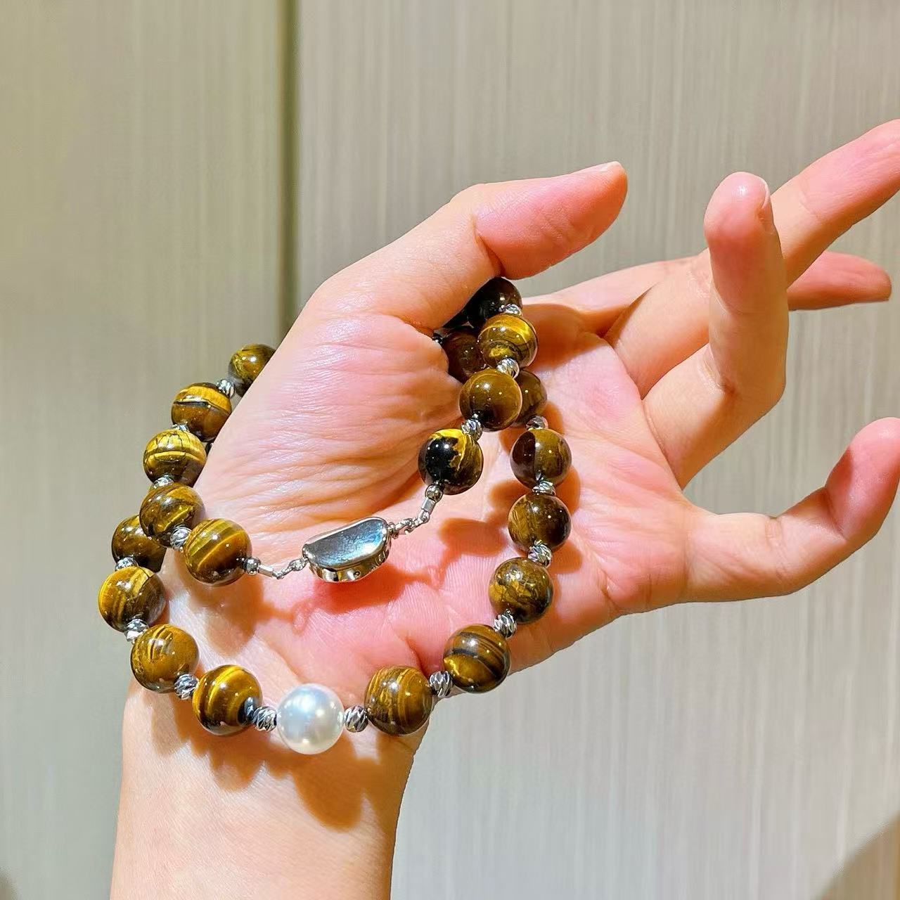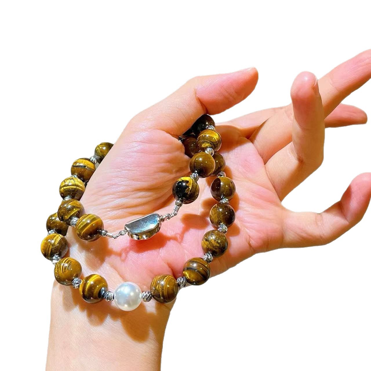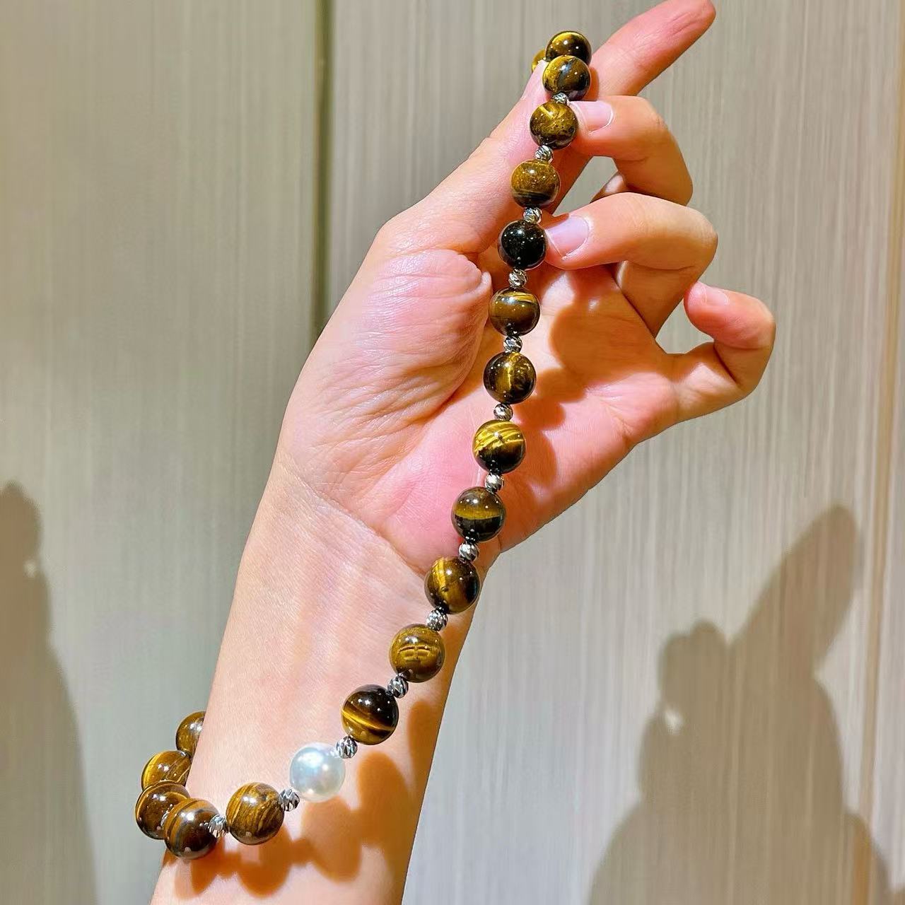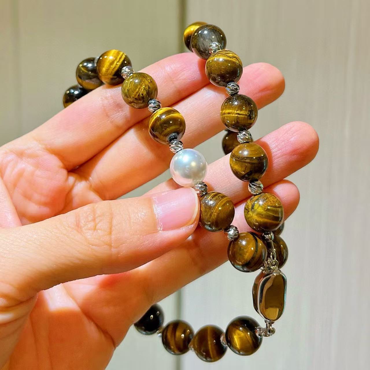 10mm美拉德天然精品虎眼石仿澳白珍珠水晶锁骨链项链保真可复检
