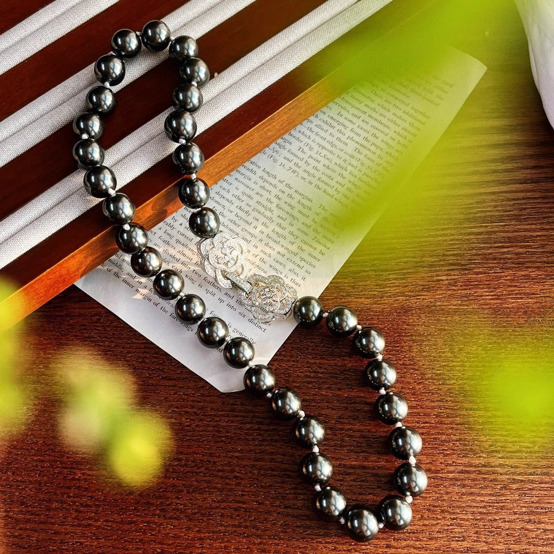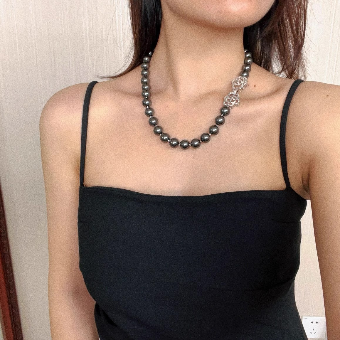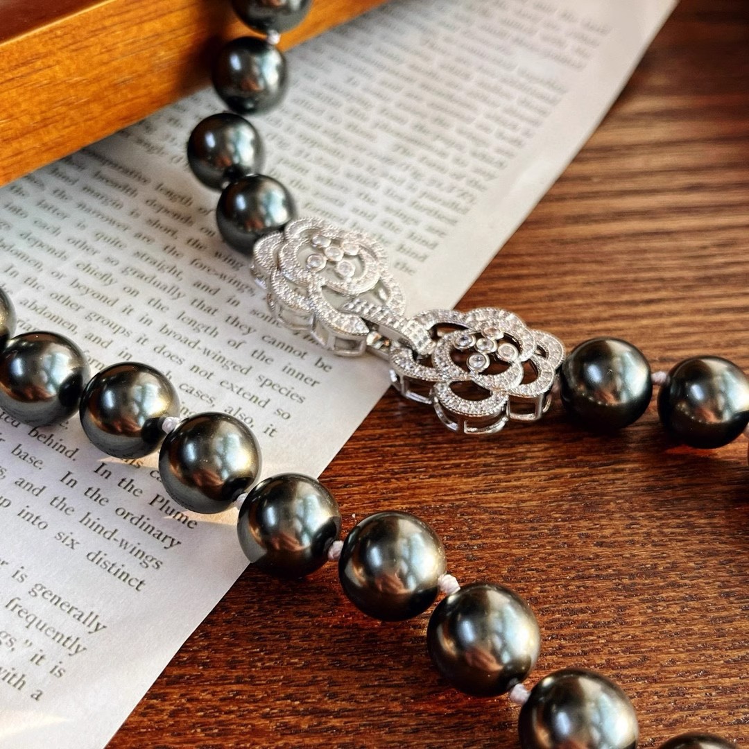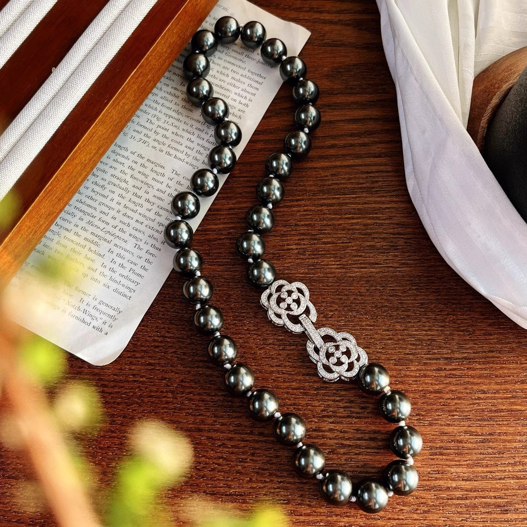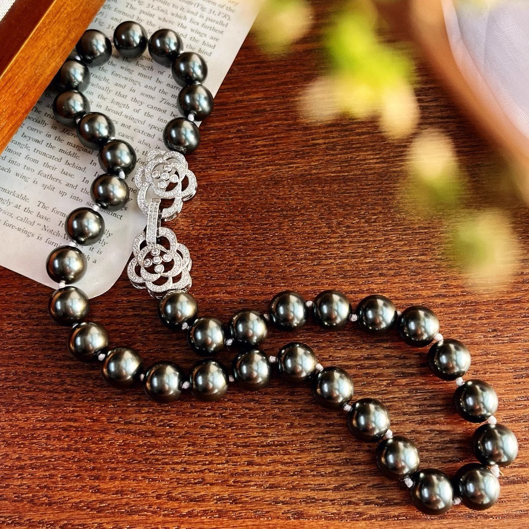 客订高品质12mm大颗粒气质暗夜黑强光施家珍珠项链双山茶花扣