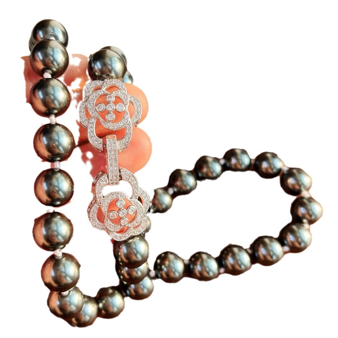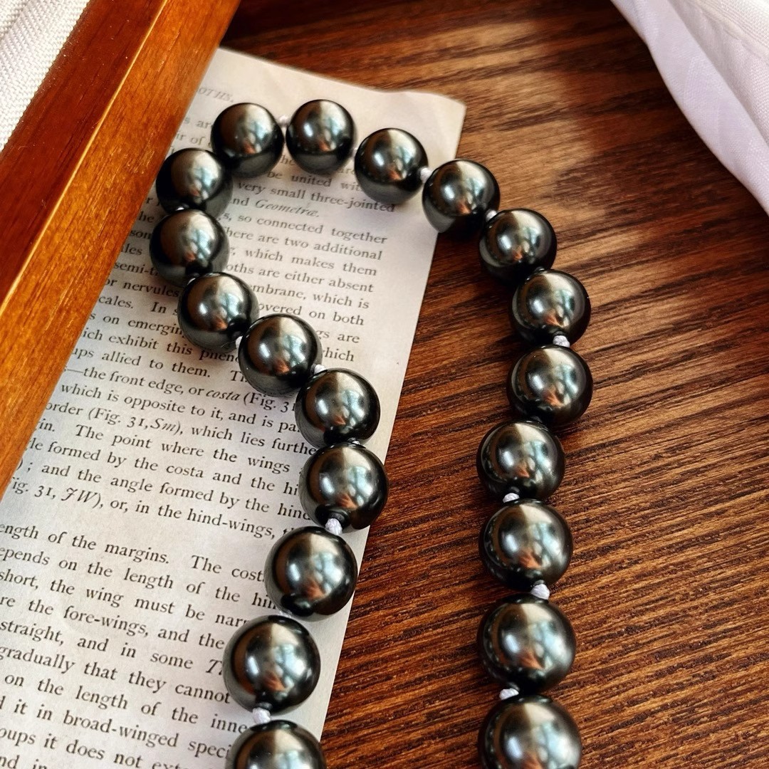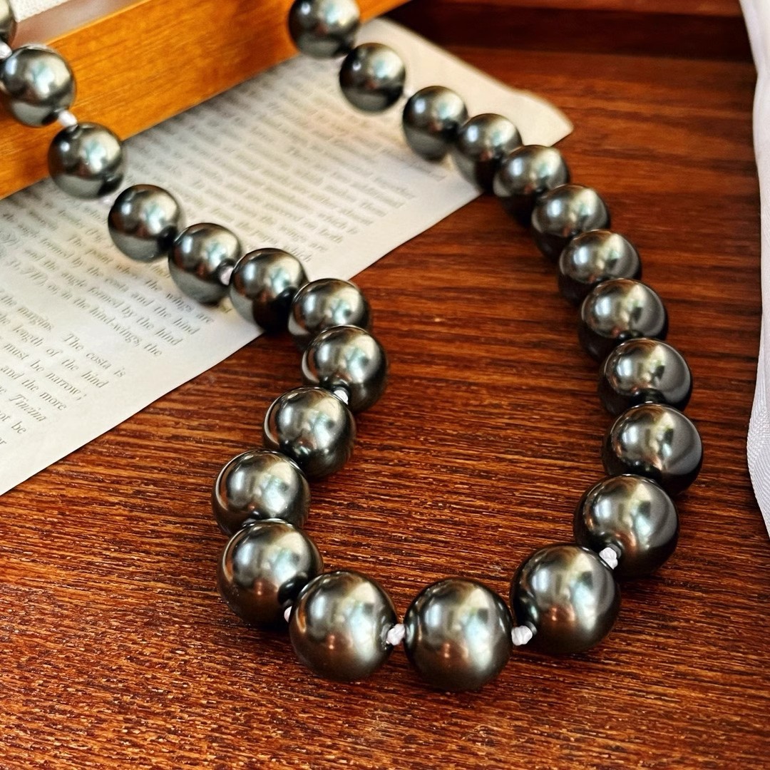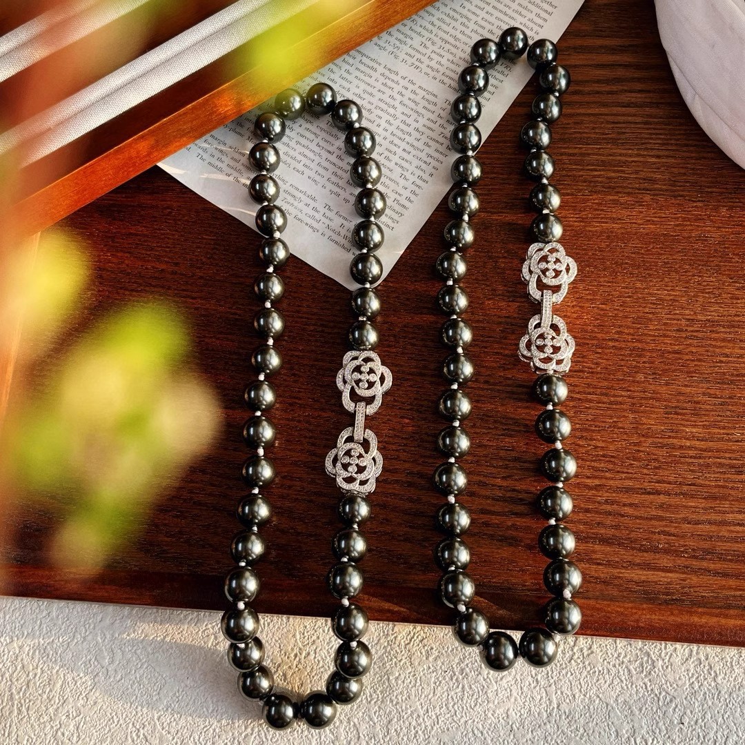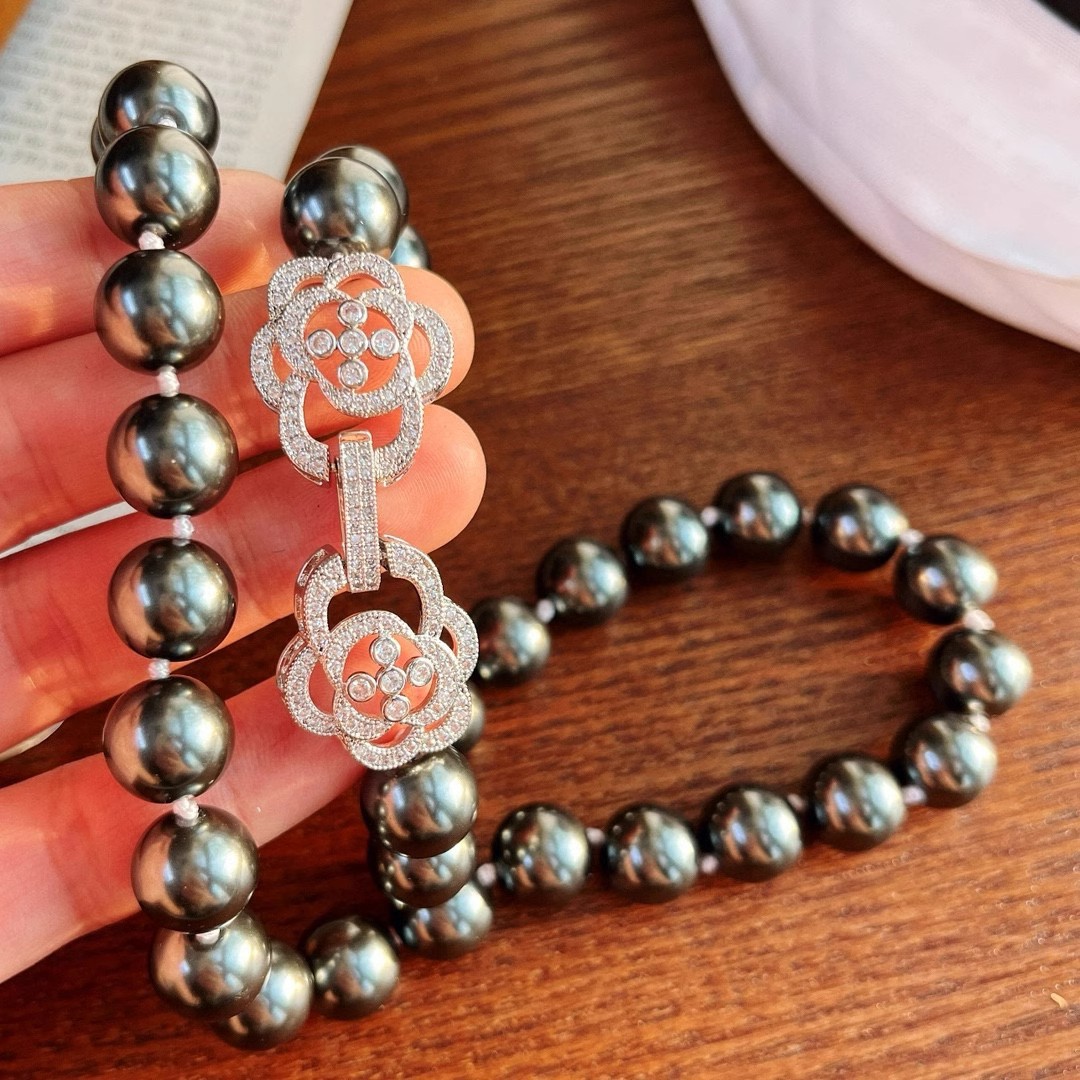客订高品质12mm大颗粒气质暗夜黑强光施家珍珠项链双山茶花扣