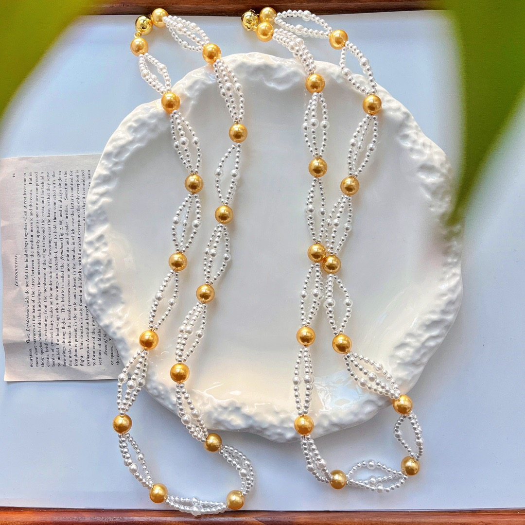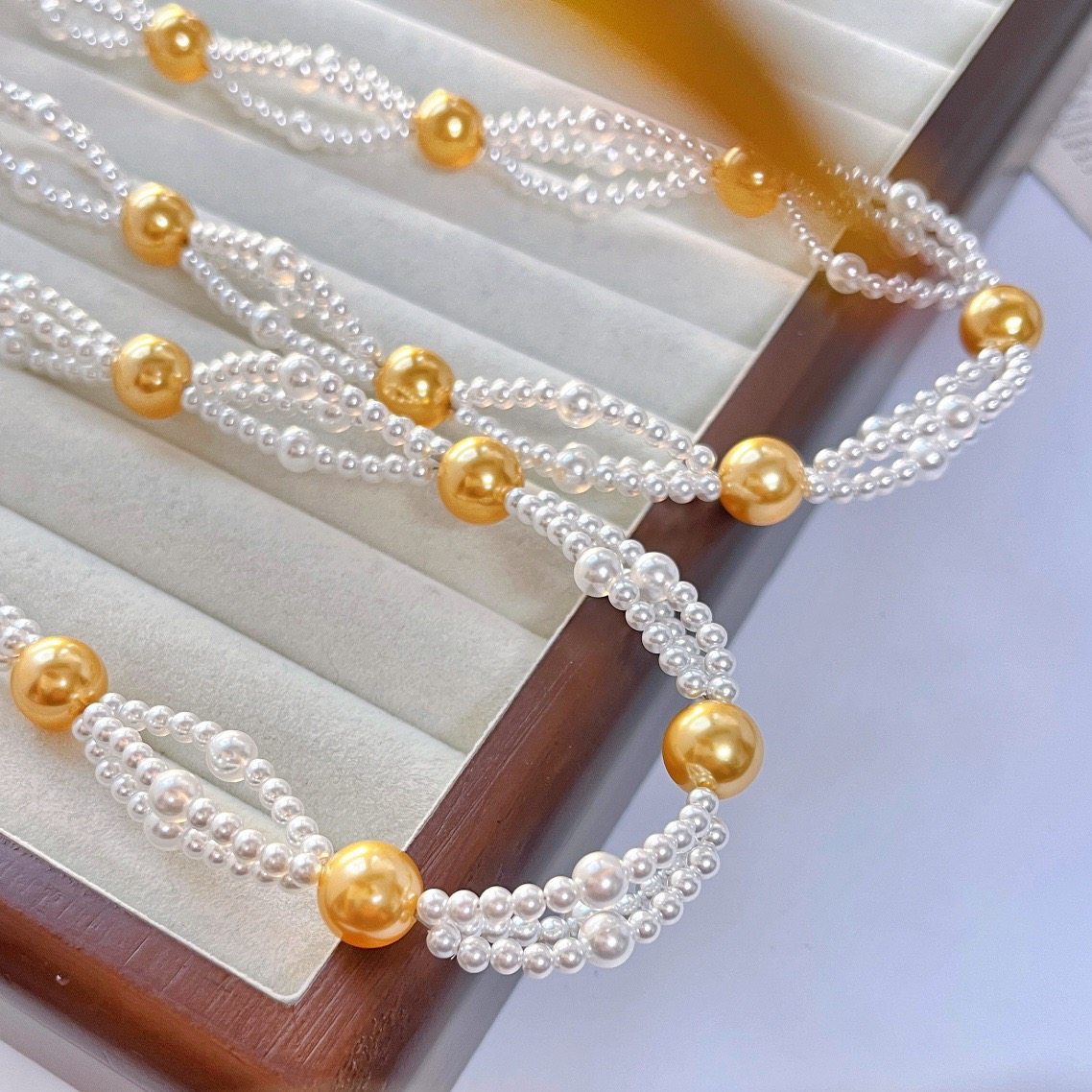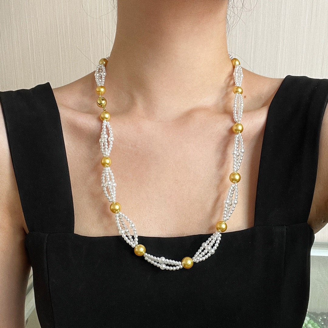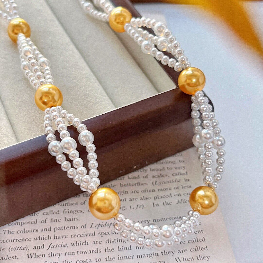 秋冬爆款原创法式复古手工编织混彩渐变人造水晶珍珠项链毛衣链