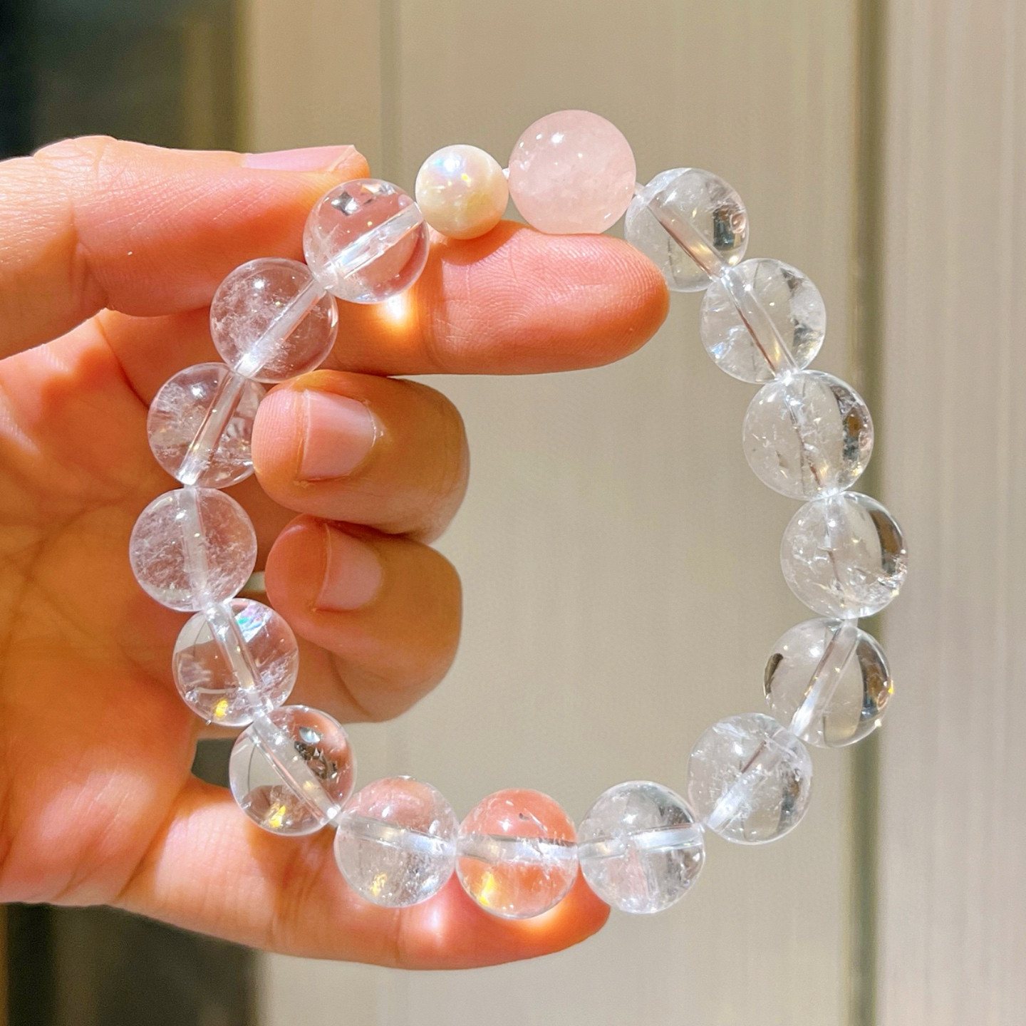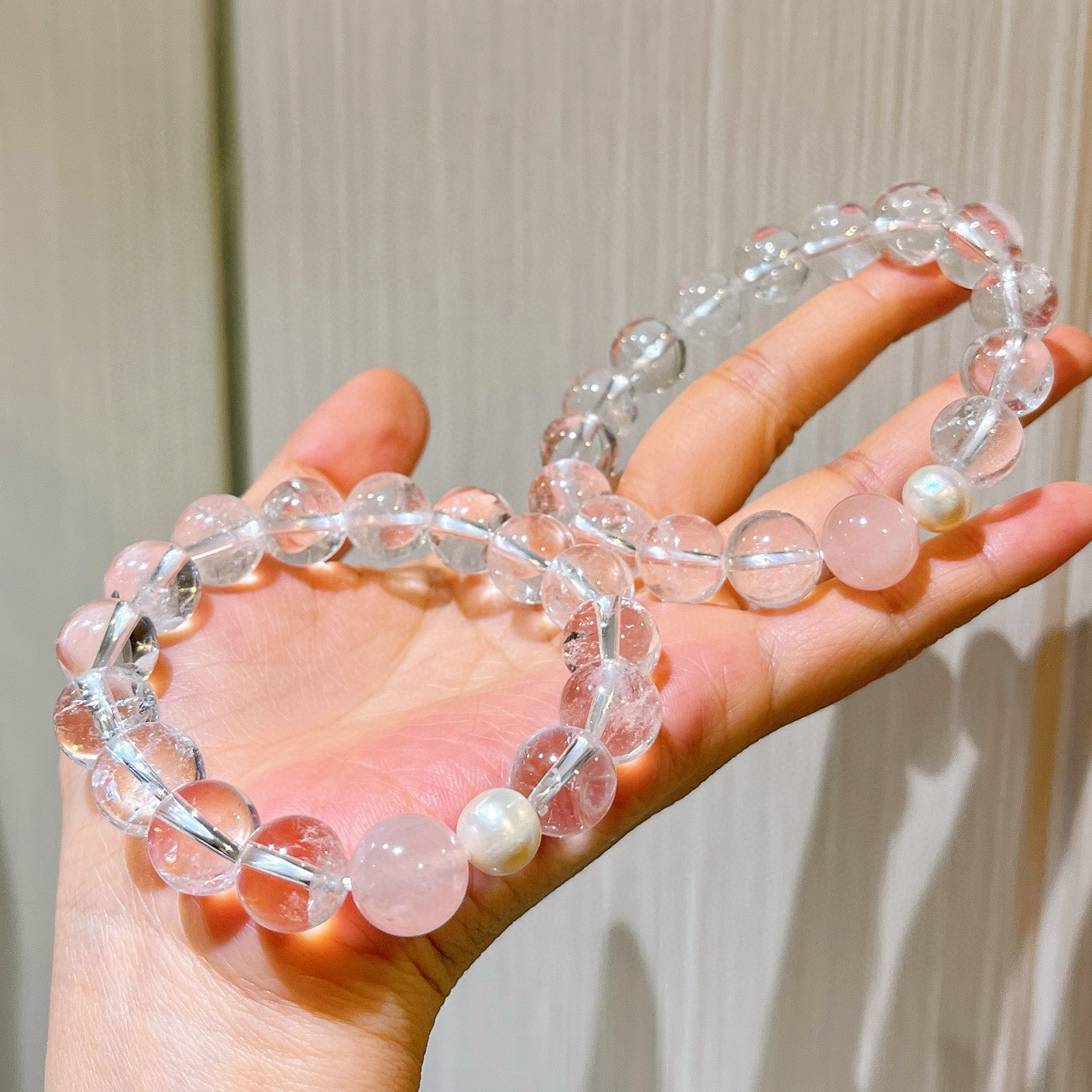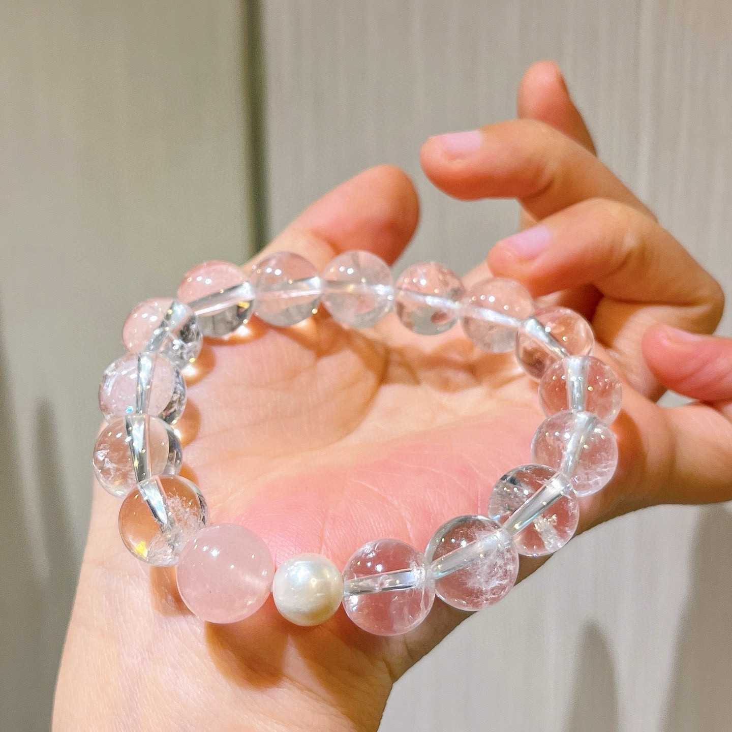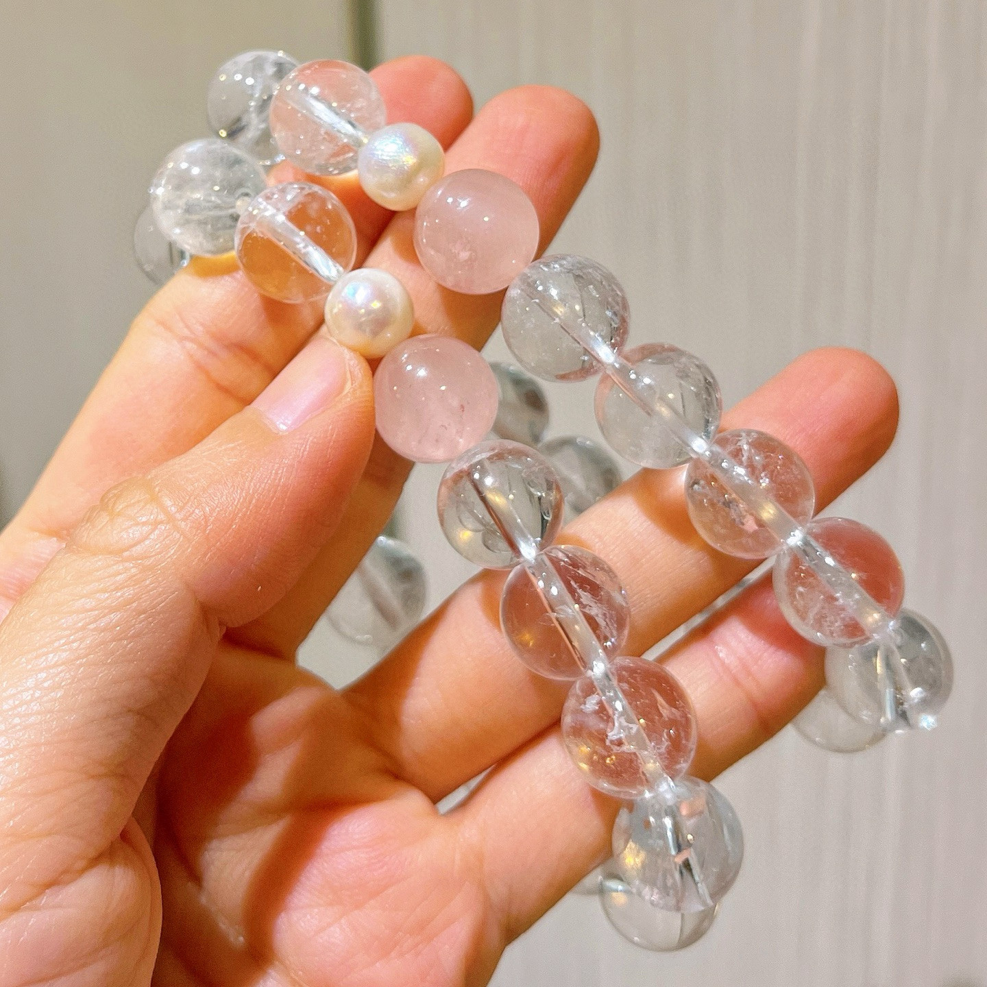 12mm天然冰透白水晶粉晶手链女轻奢小众精致高级感串珠叠戴手串