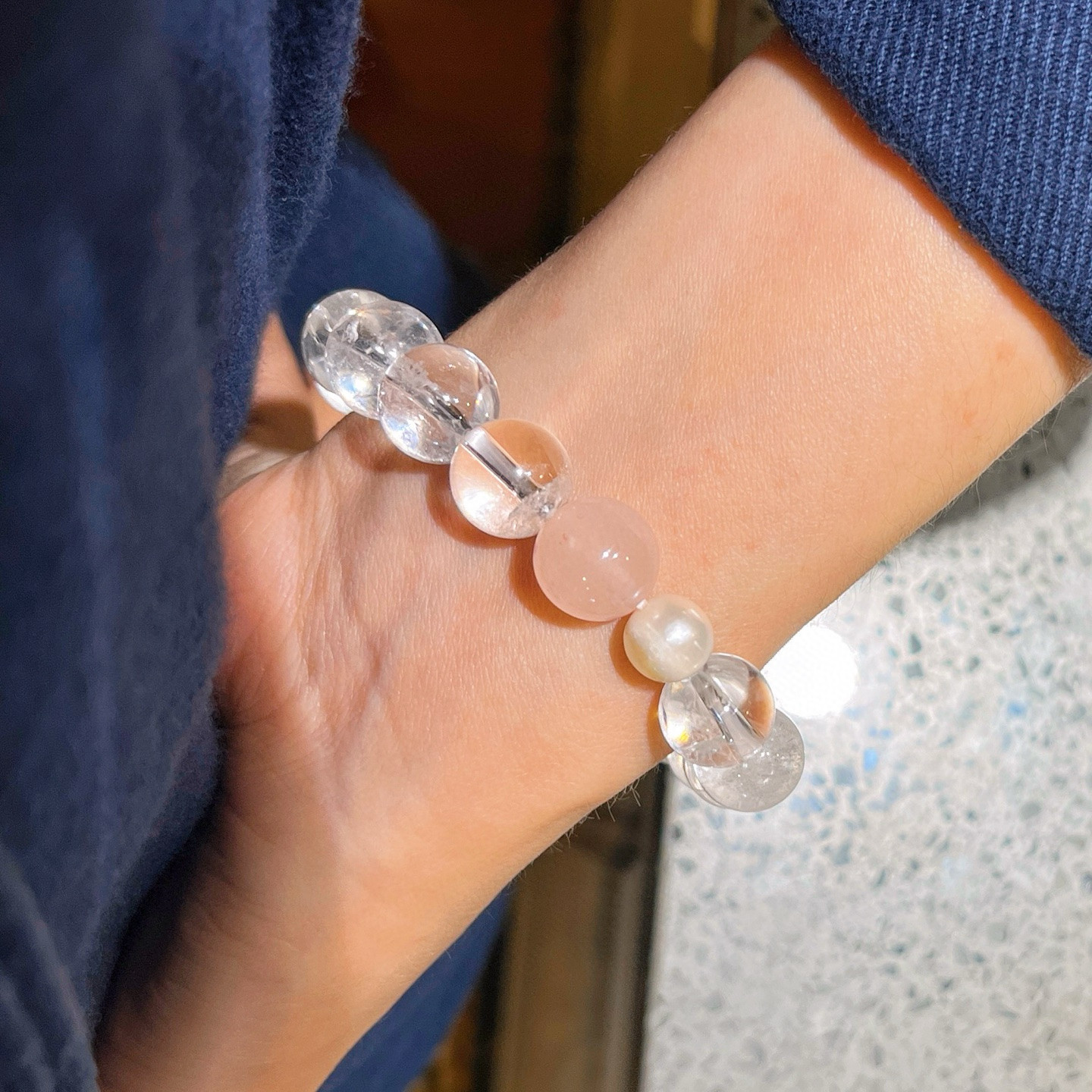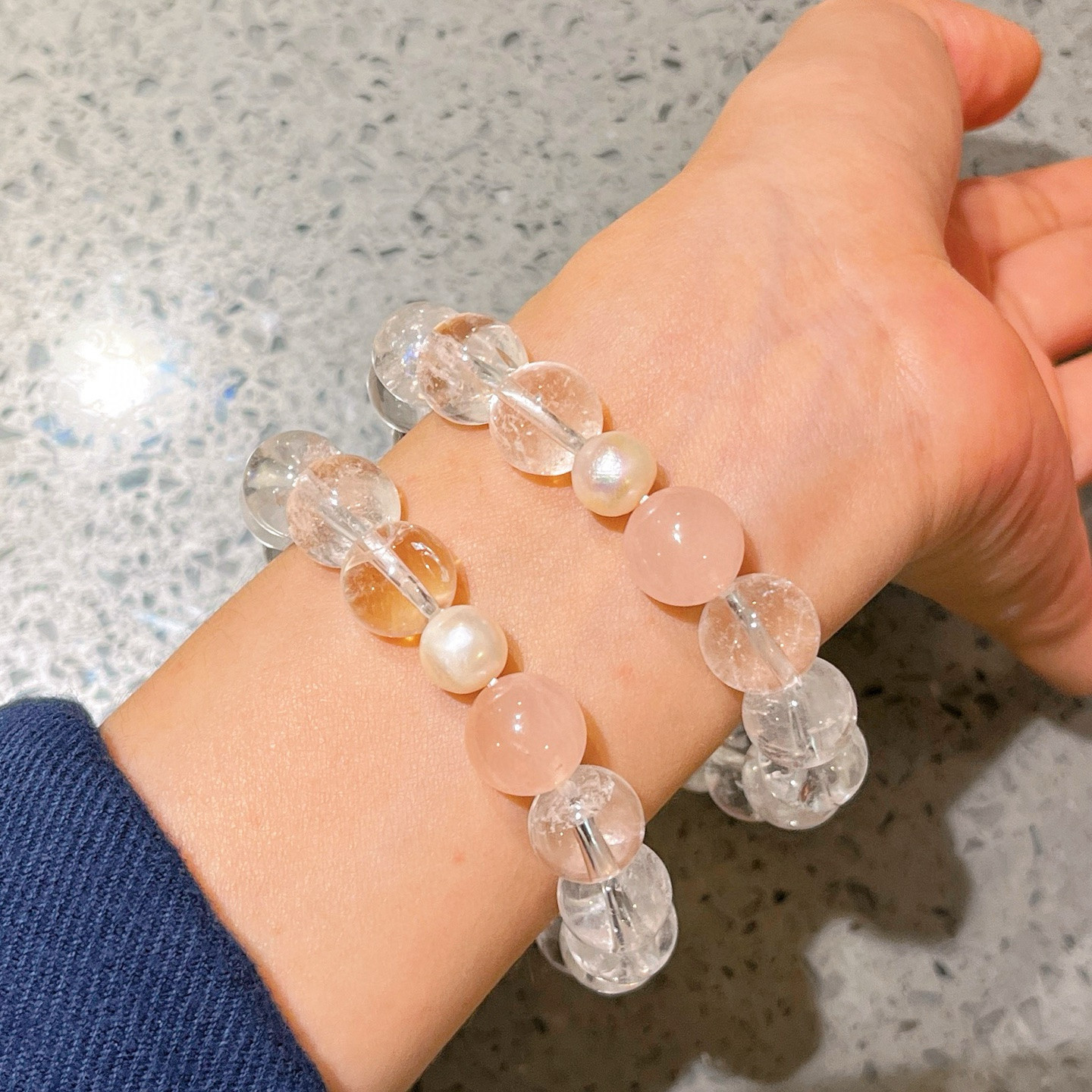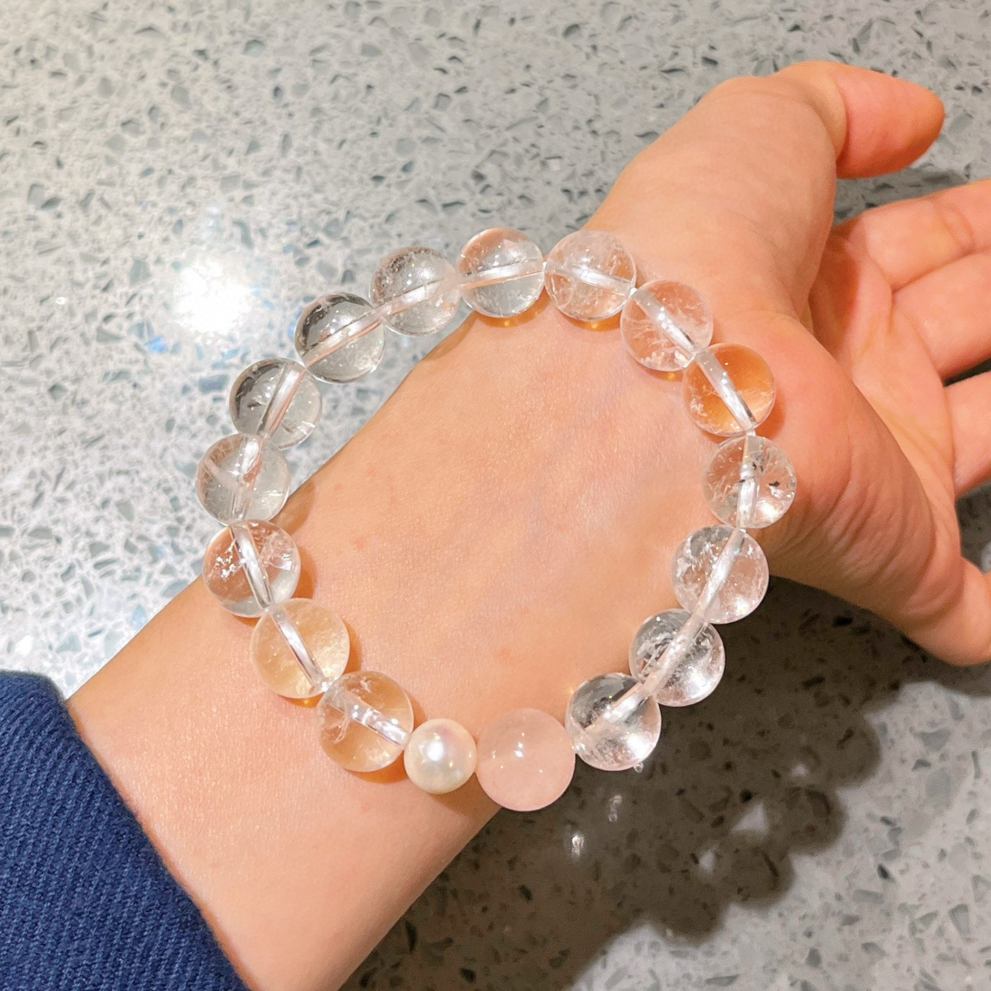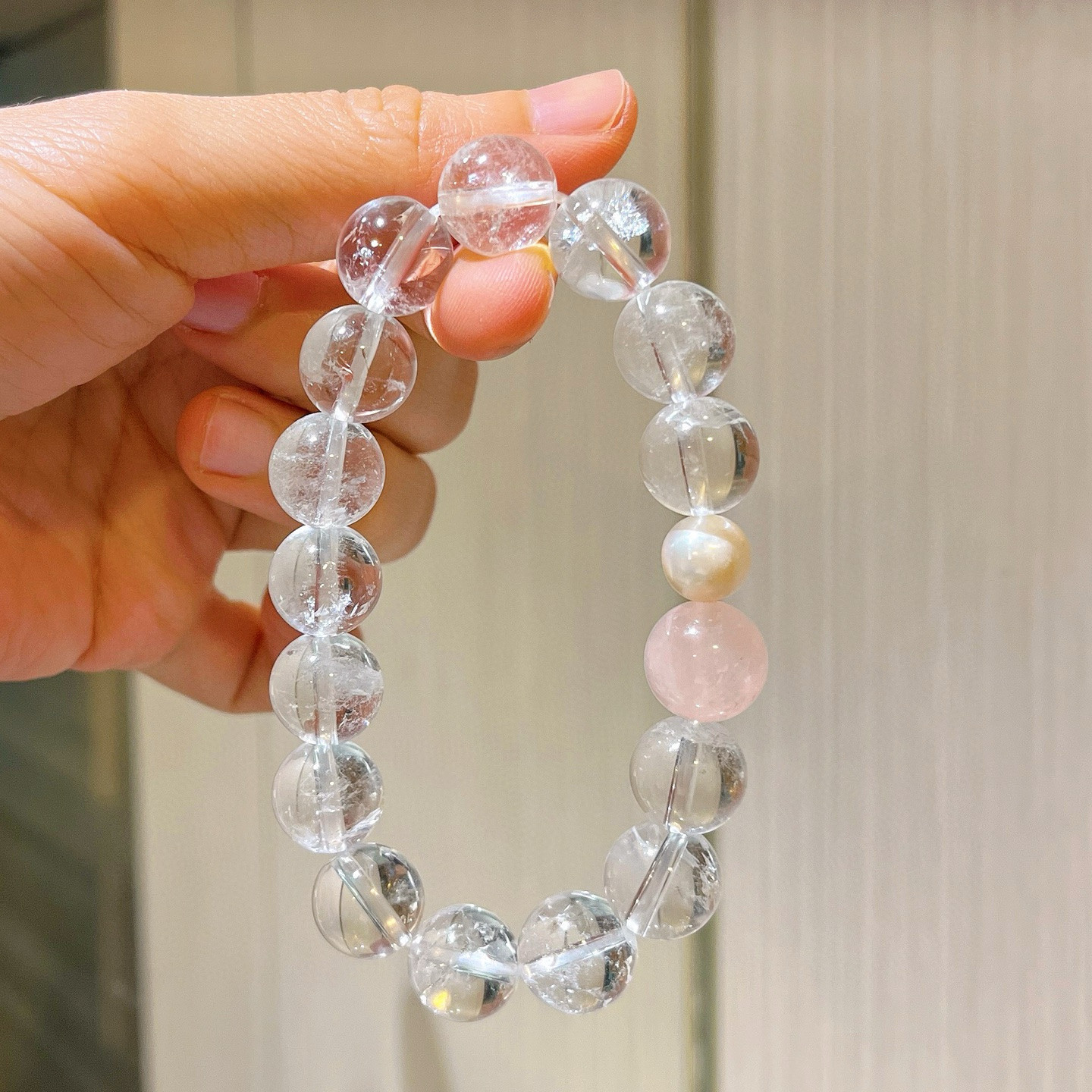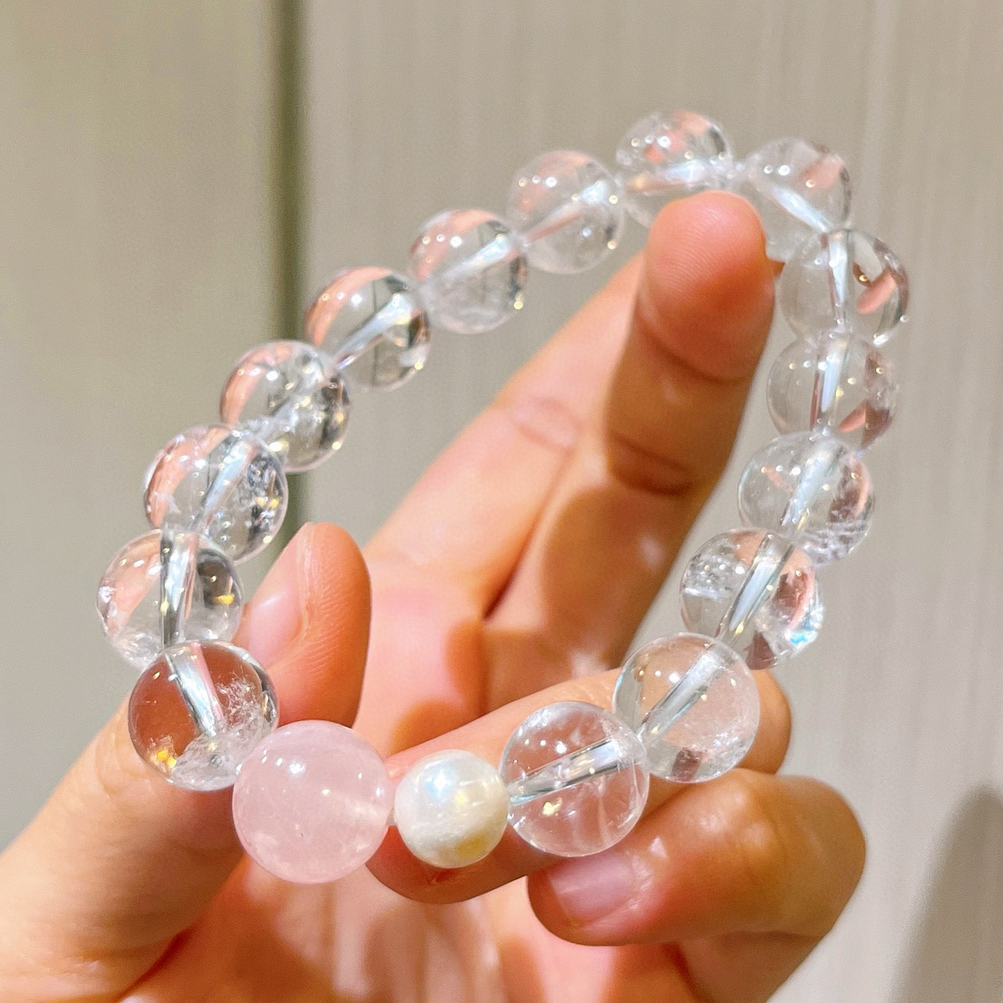 12mm天然冰透白水晶粉晶手链女轻奢小众精致高级感串珠叠戴手串