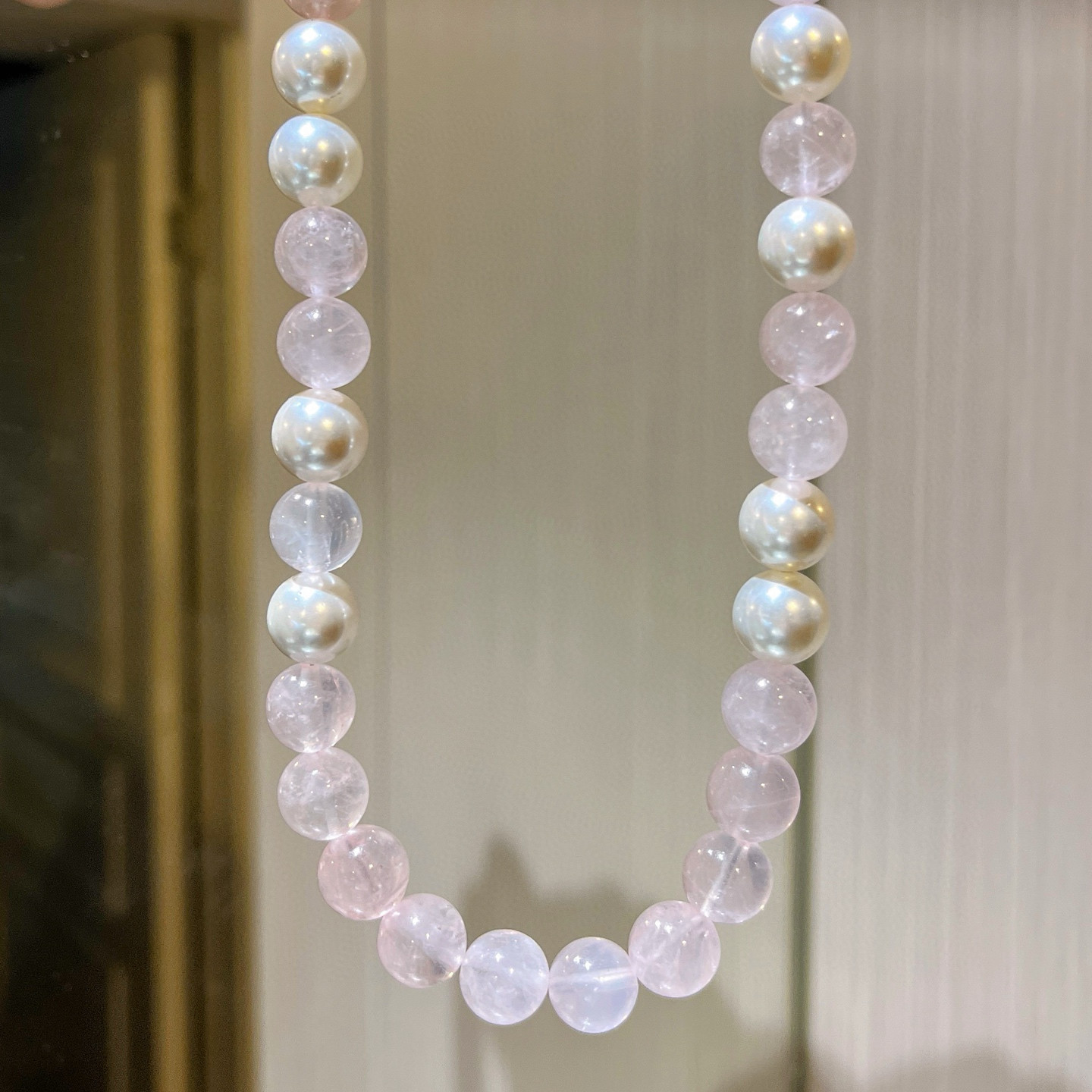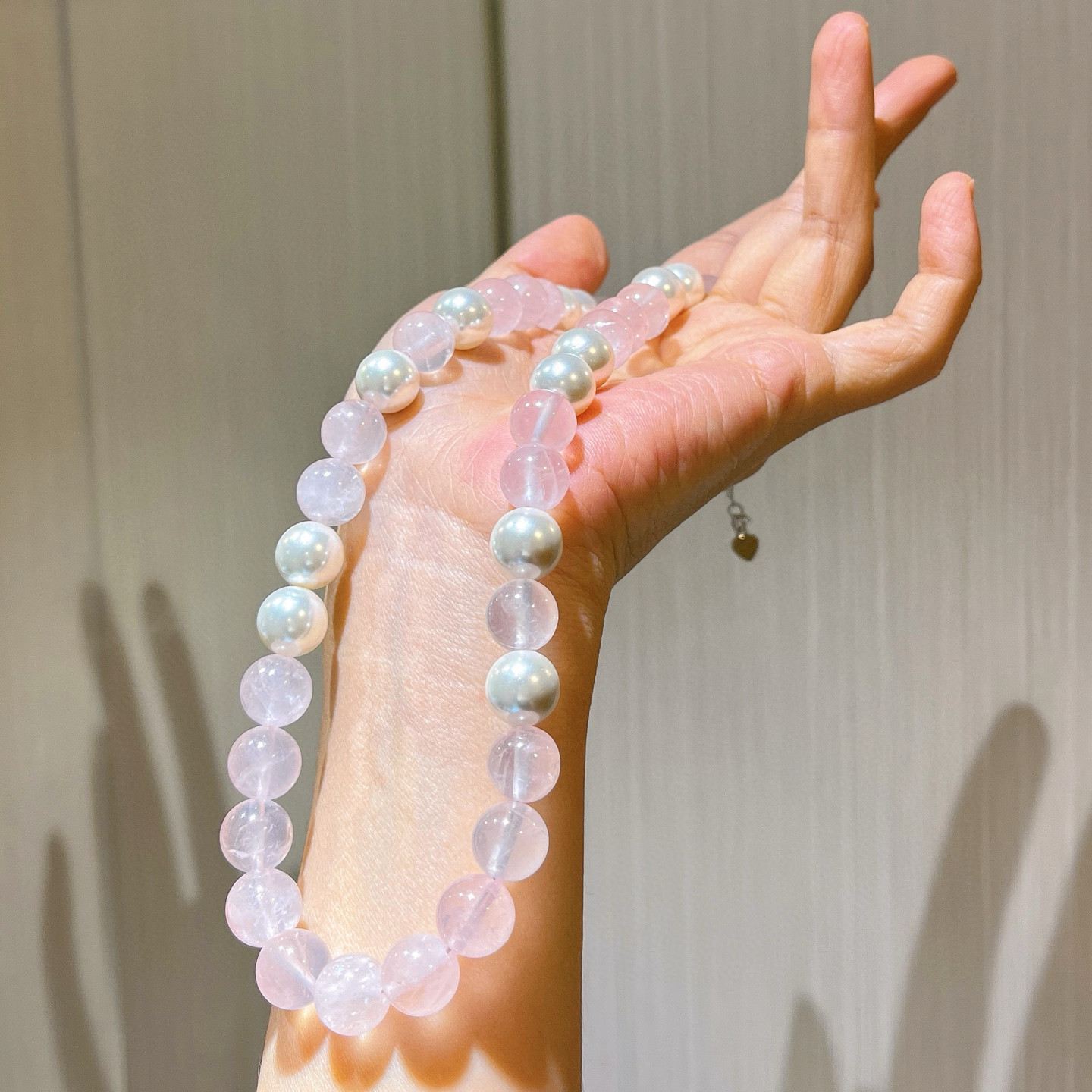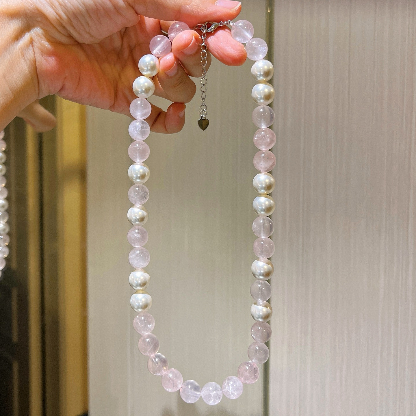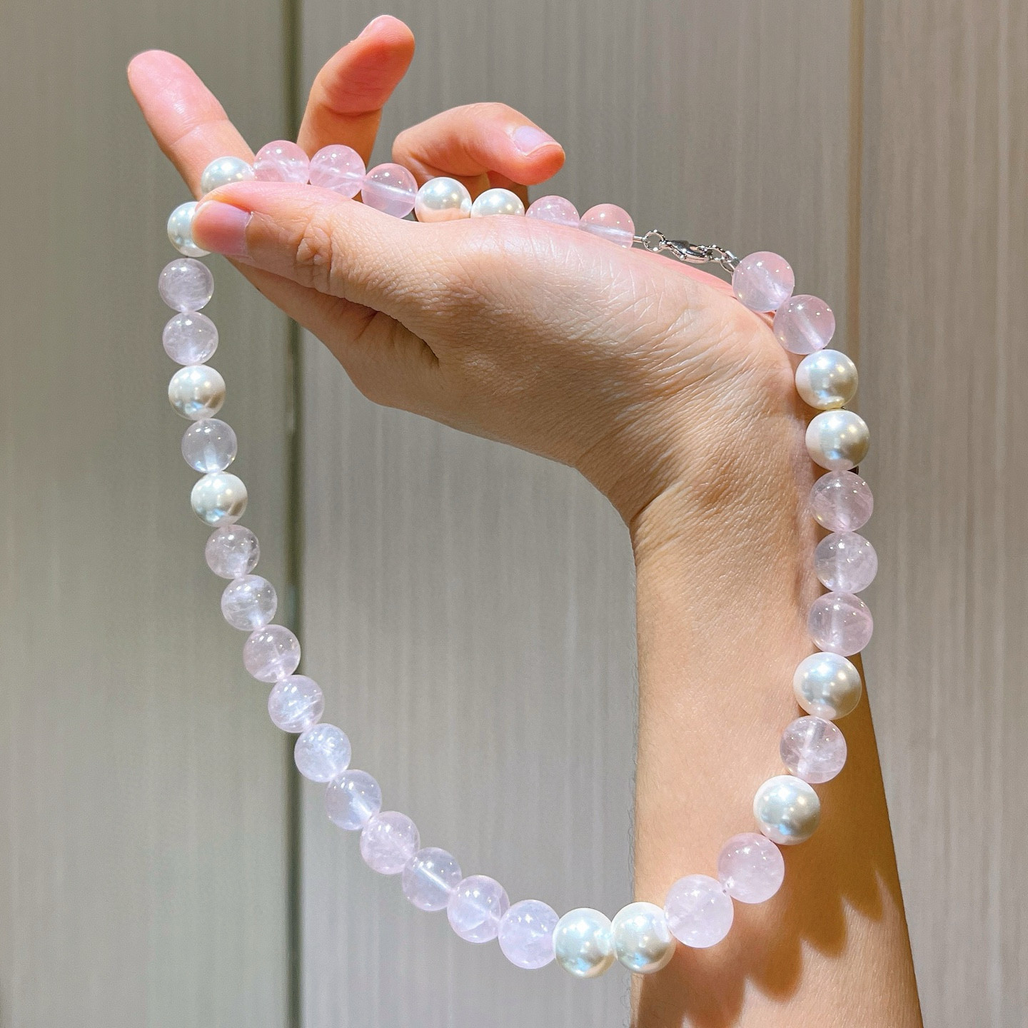 10mm天然粉晶人造珍珠贝珠项链锁骨链轻奢小众设计感高级气质颈链