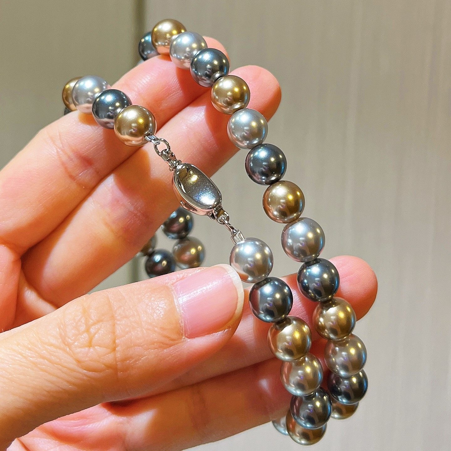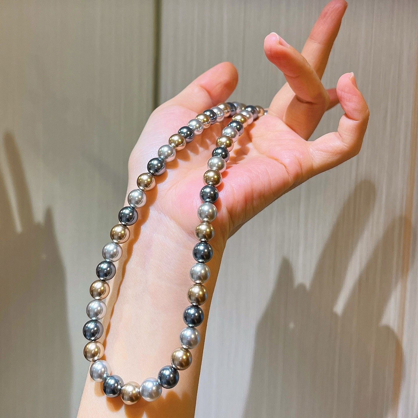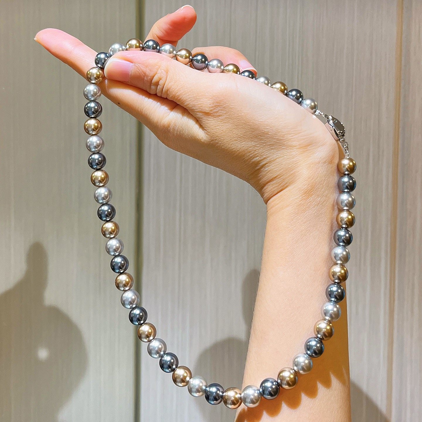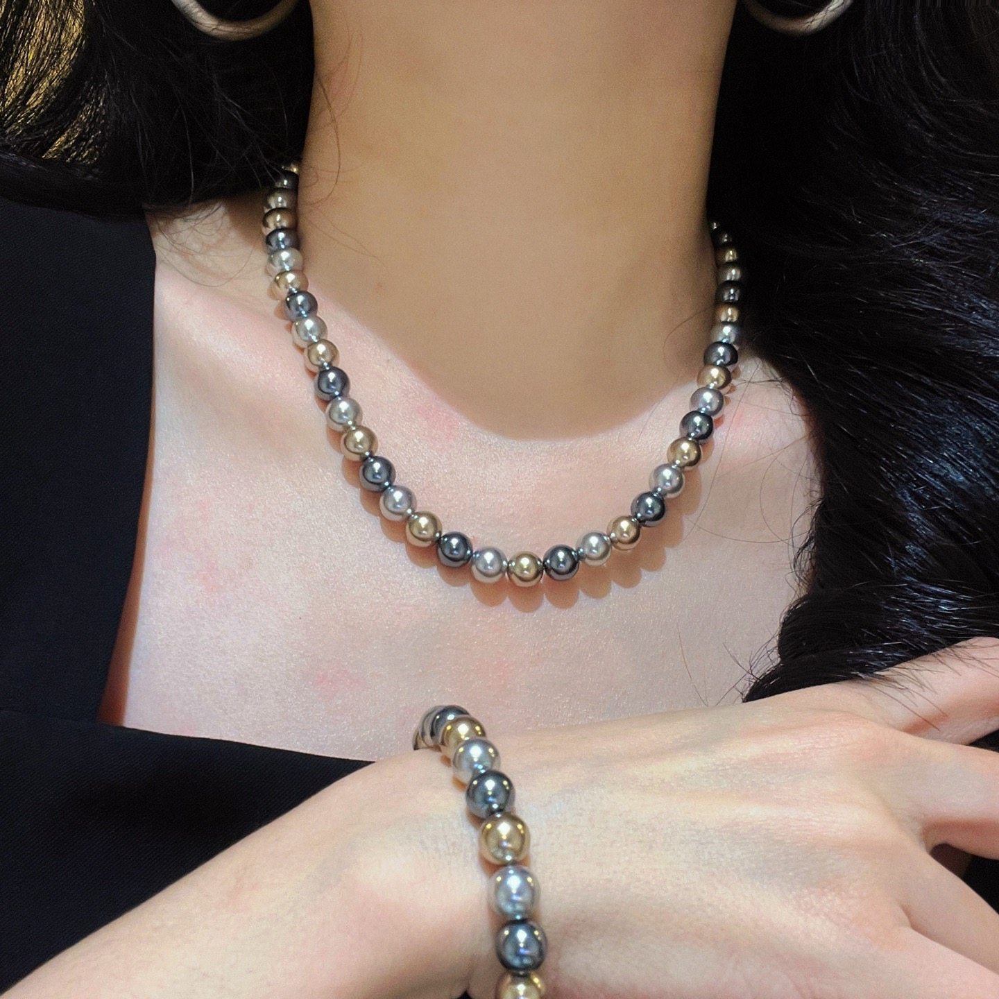 施家正圆极光仿海水大溪地黑灰混彩糖果色莫兰迪轻奢珍珠项链颈链